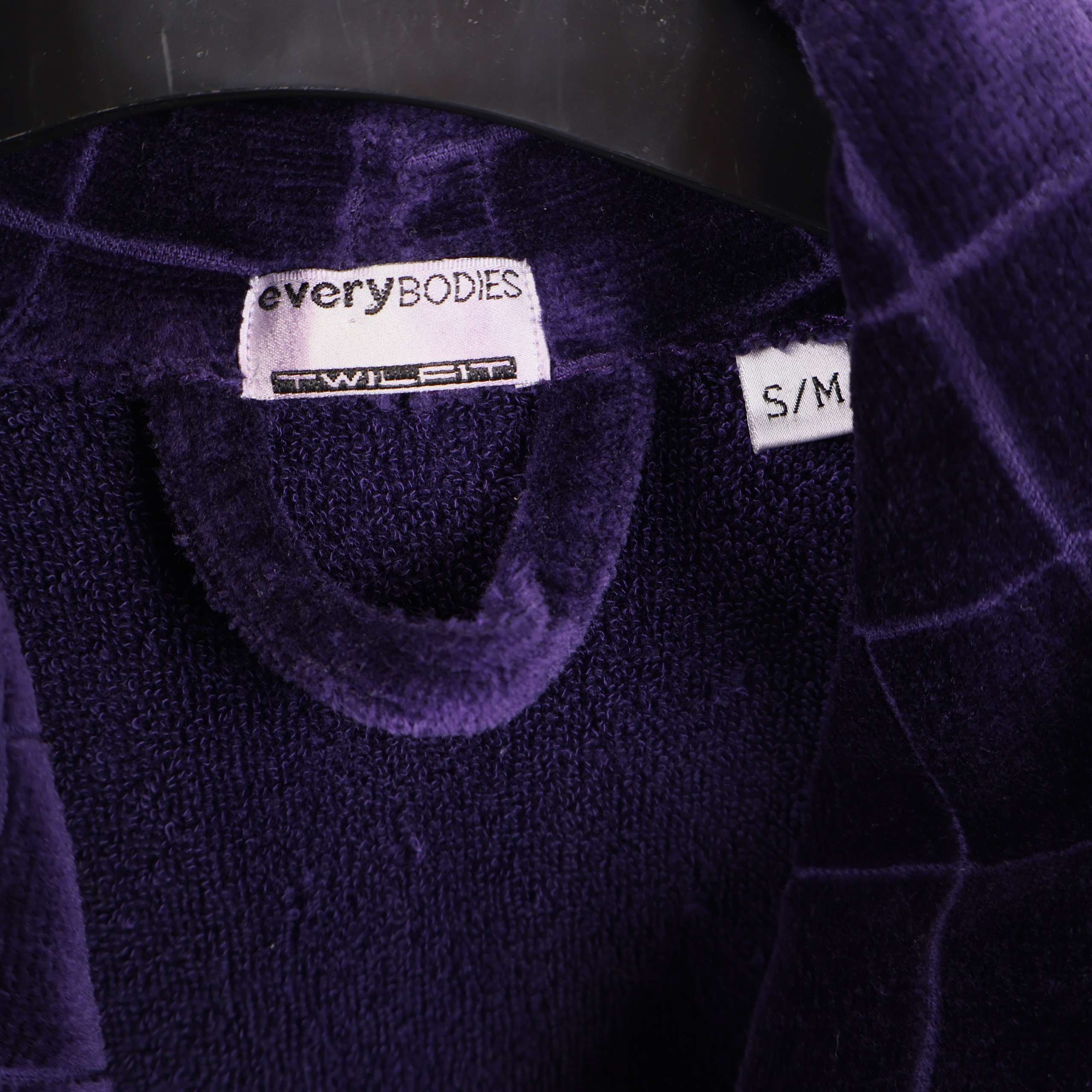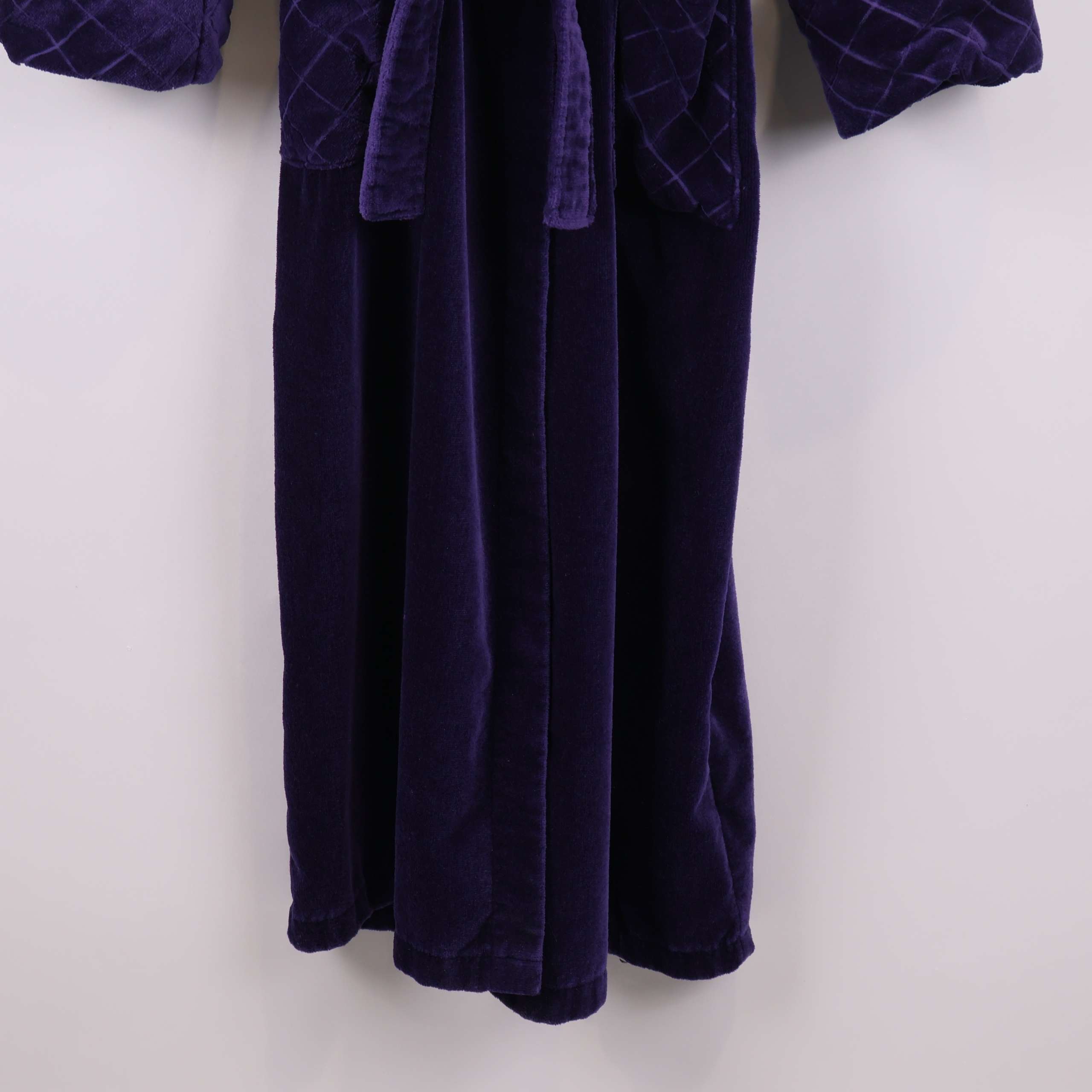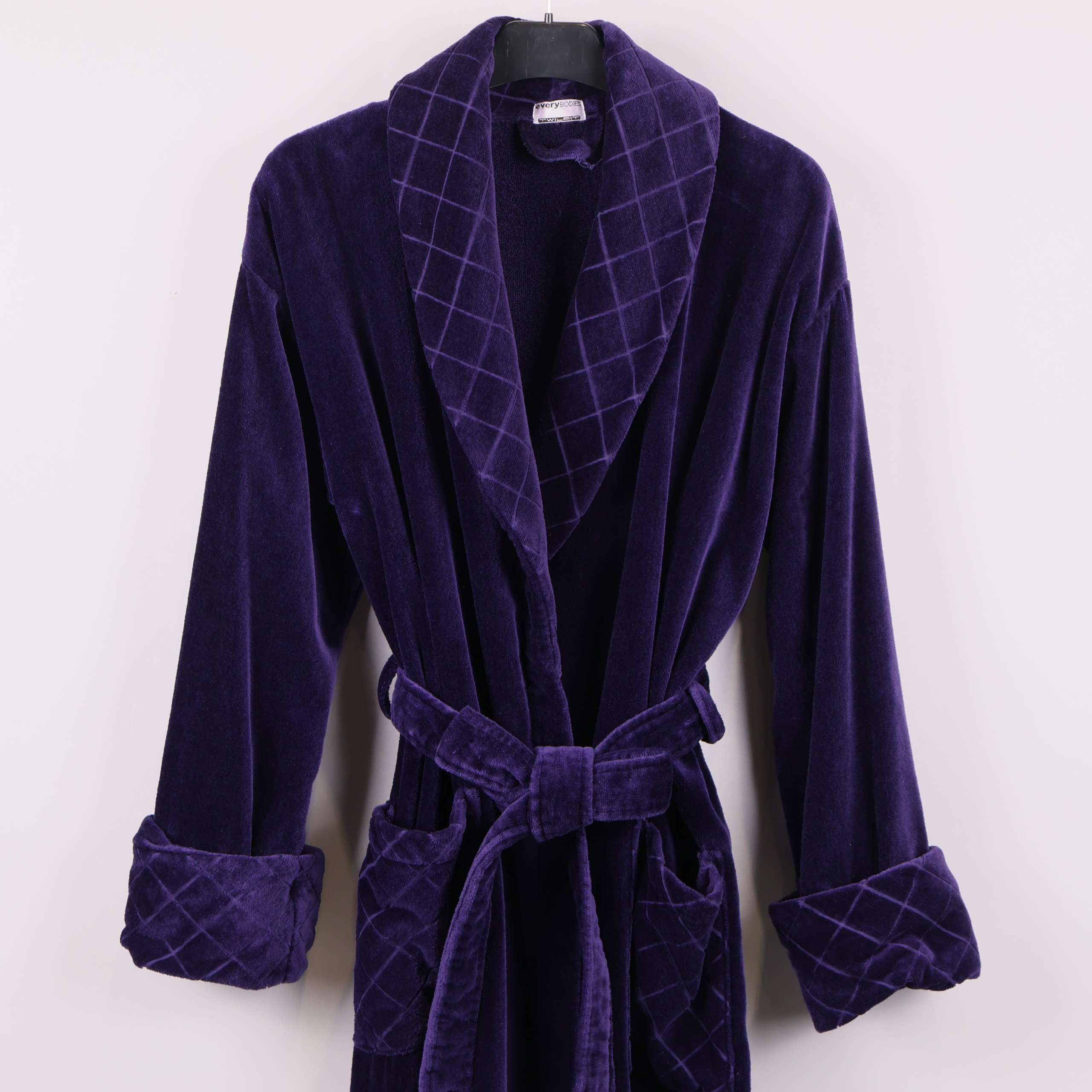Härlig morgonrock i mjuk, lila frotté med elegant rutmönstrade slag och ärmslut. Rocken har två stora fickor framtill och midjebälte för justerbar passform. Frottématerialet ger en skön och omslutande känsla som passar alla. Normal passform i stl S/M.