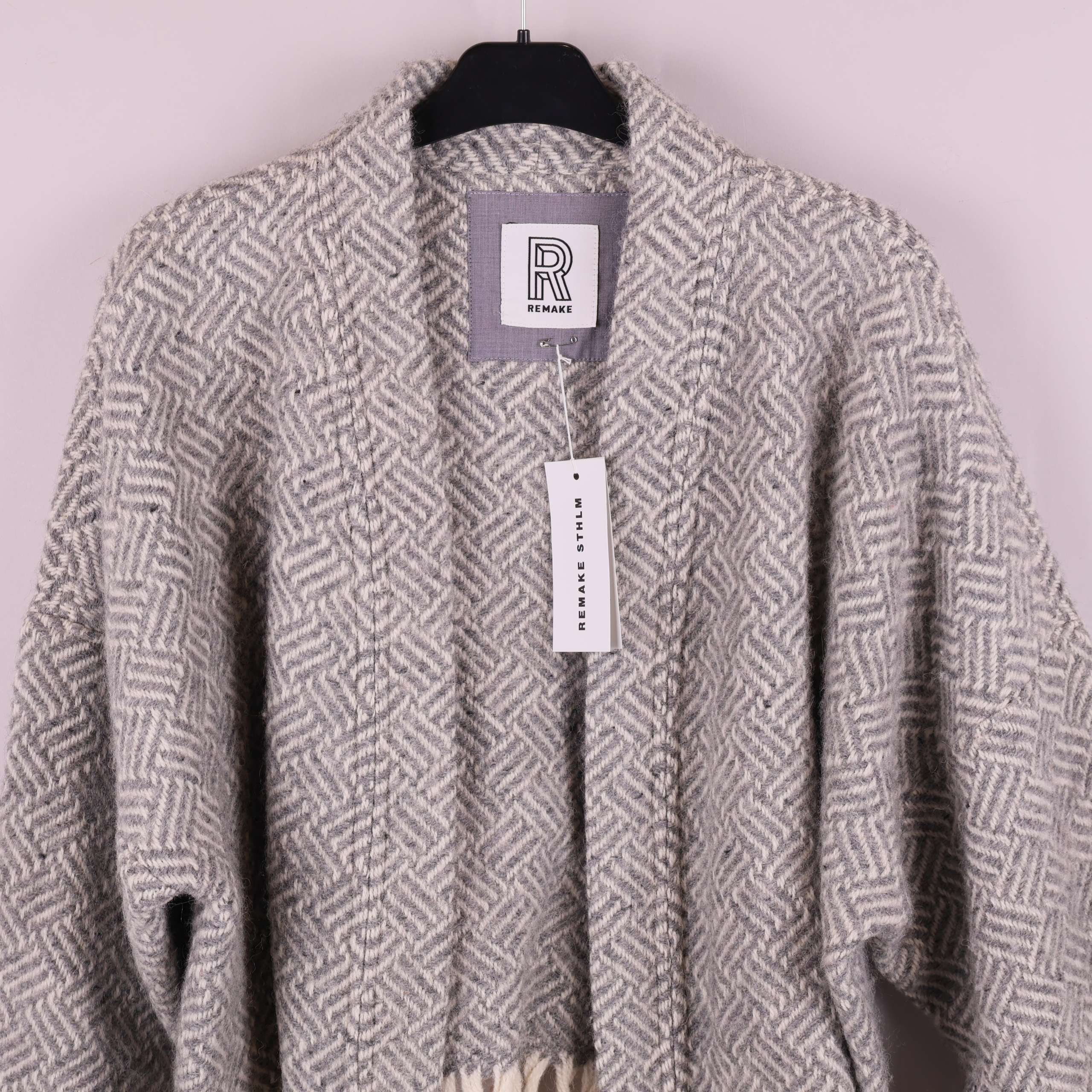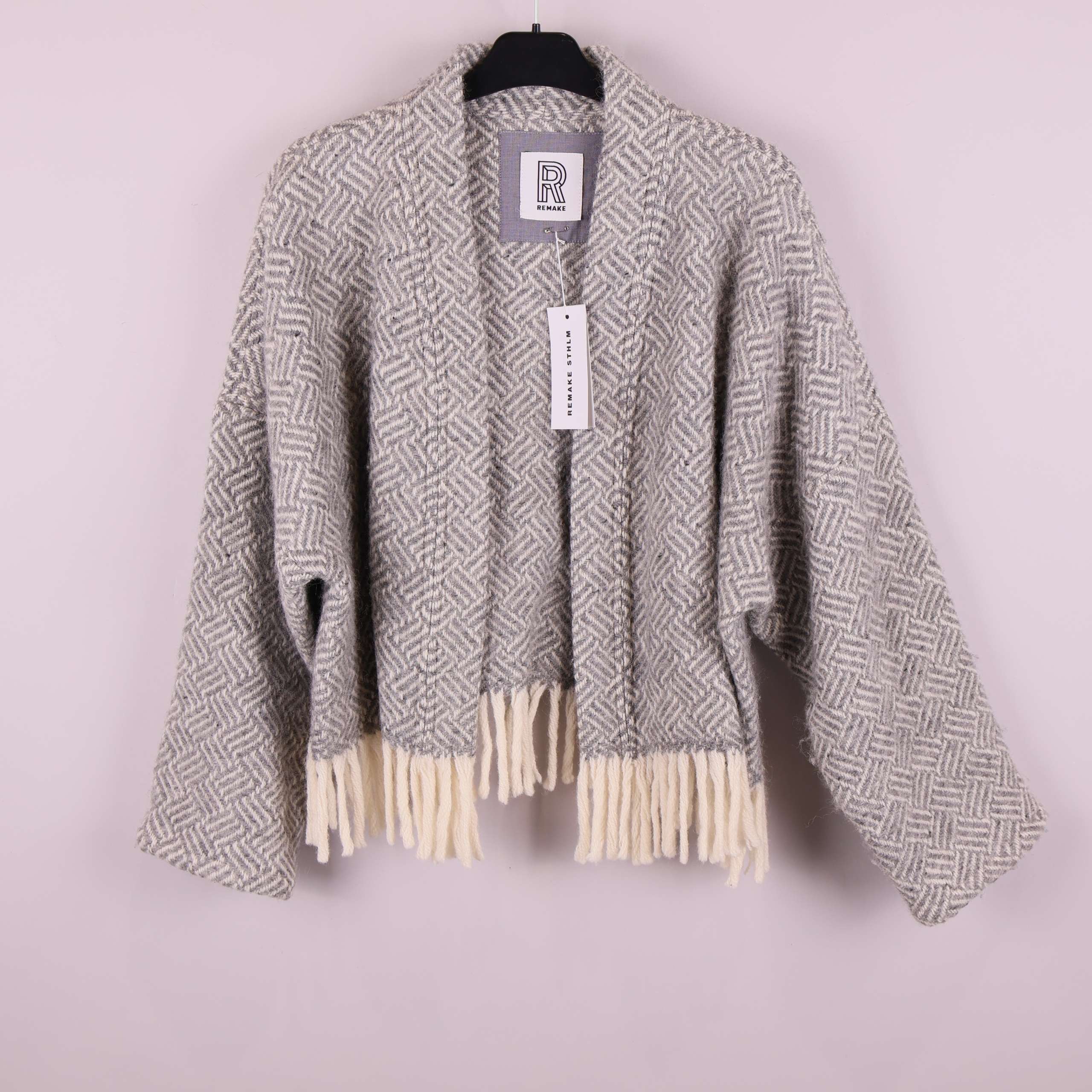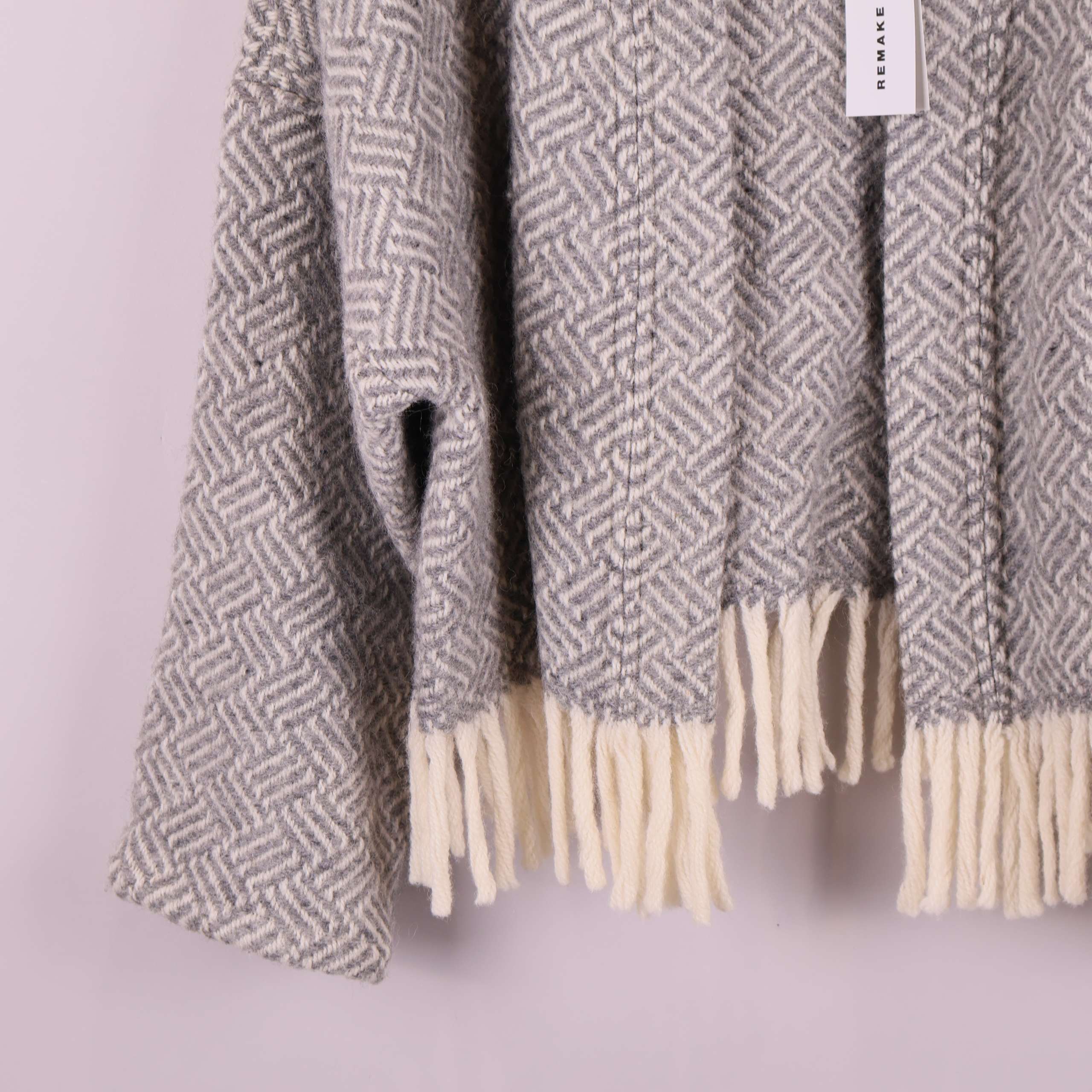Jacket made from wool blankets donated to Stockholms Stadsmission. The color palette features shades of gray, with the traditional blanket fringe used as the hemline. Each style is carefully cut and sewn to make full use of the blanket’s material. The design is kimono-inspired with long sleeves.