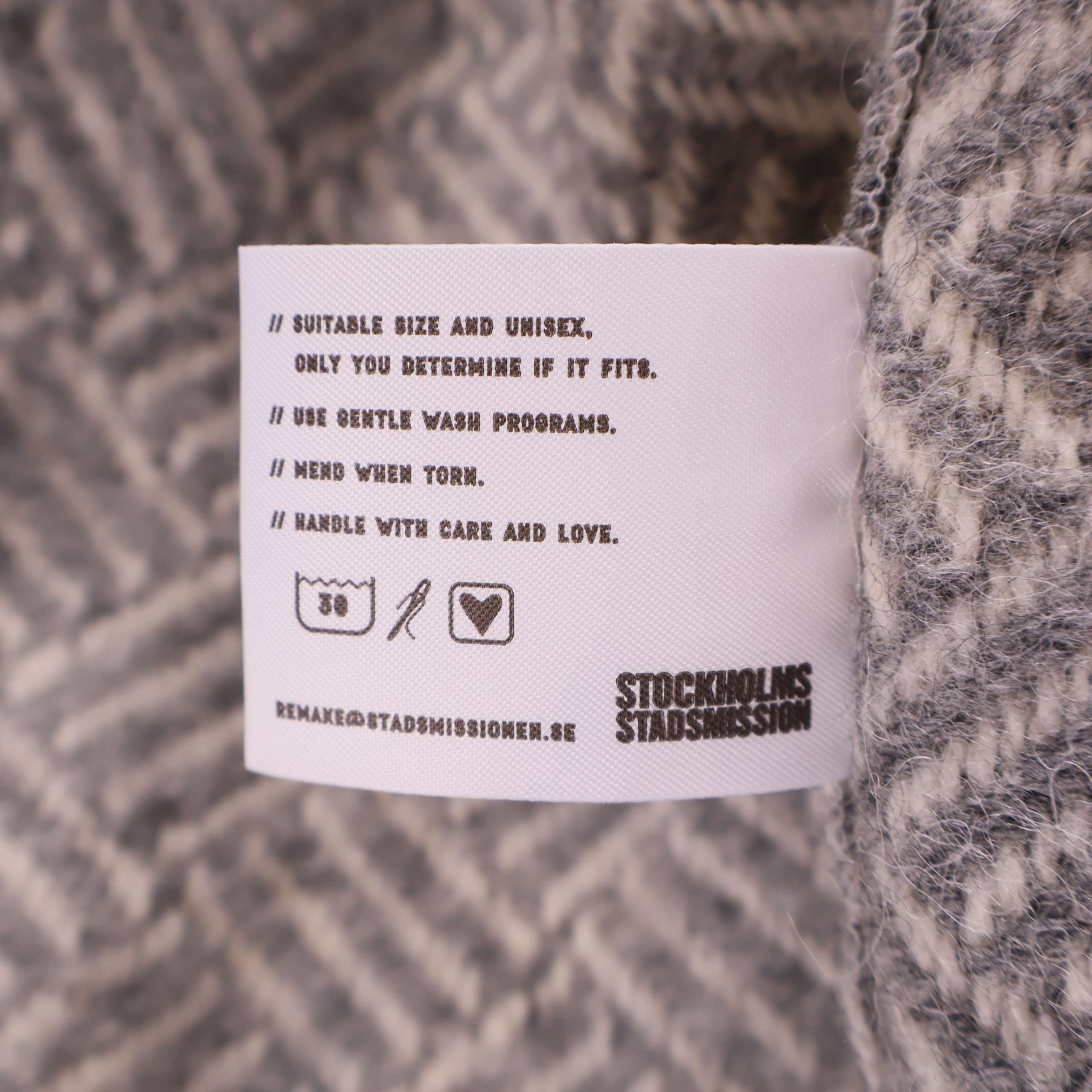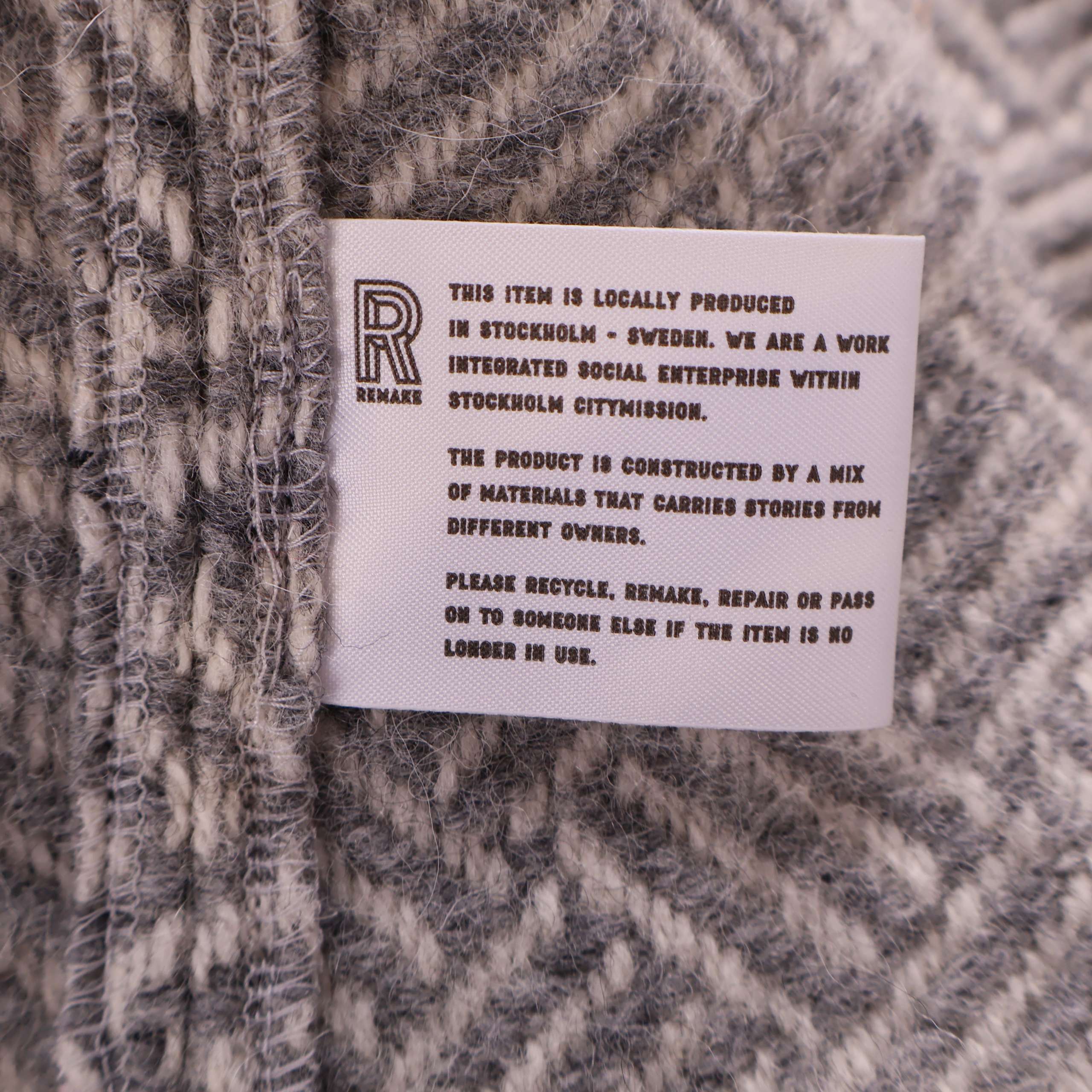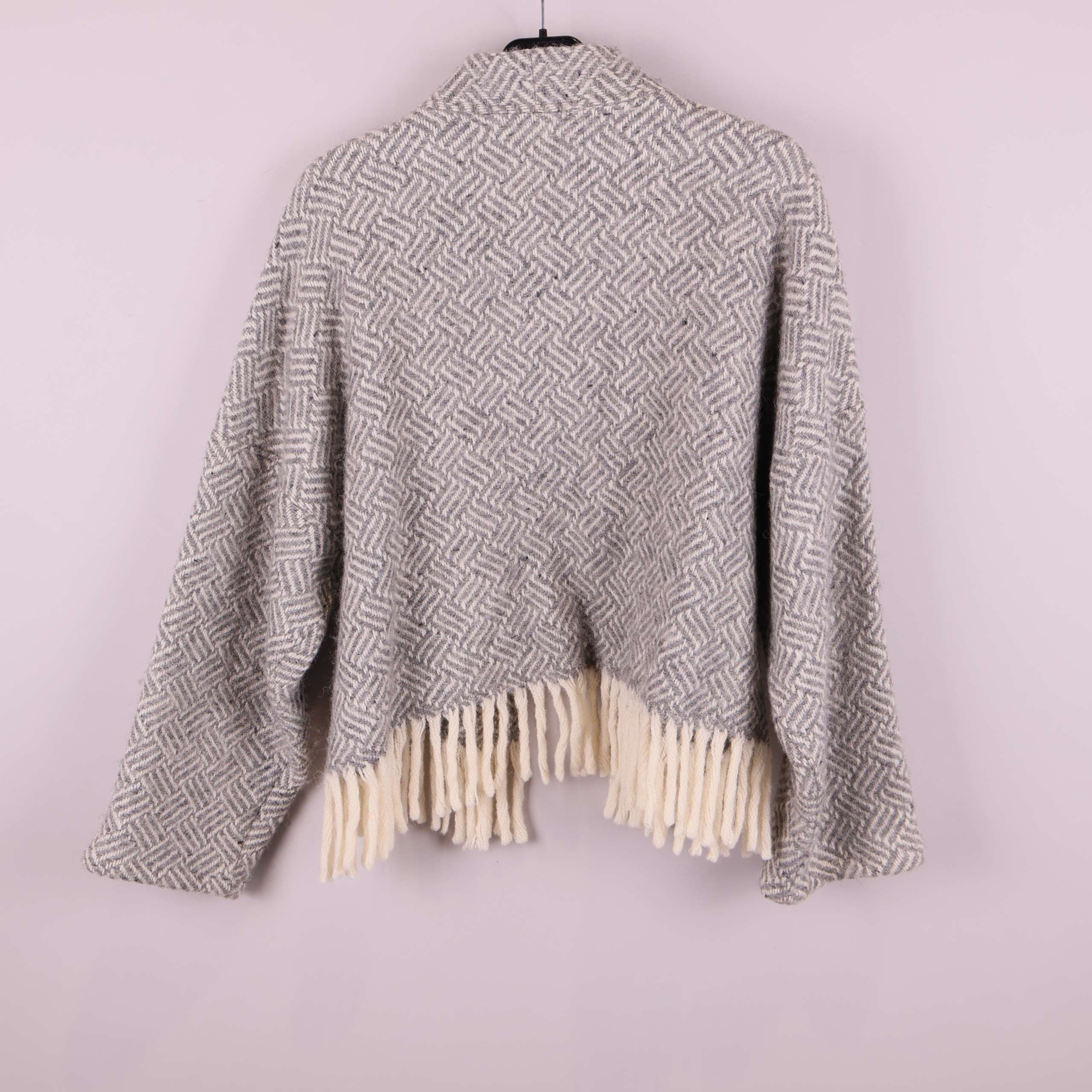 Jacket made from wool blankets donated to Stockholms Stadsmission. The color palette features shades of gray, with the traditional blanket fringe used as the hemline. Each style is carefully cut and sewn to make full use of the blanket’s material. The design is kimono-inspired with long sleeves.