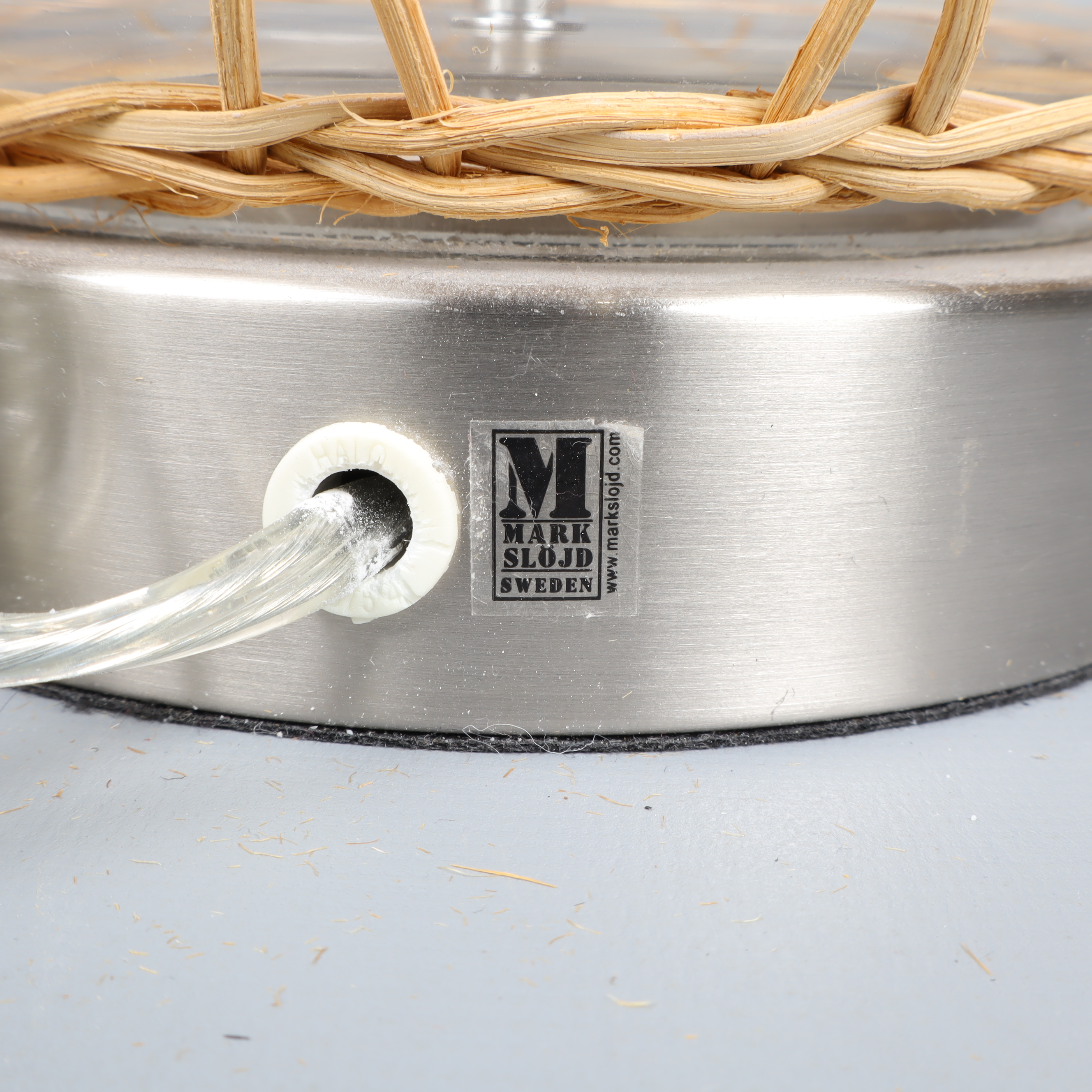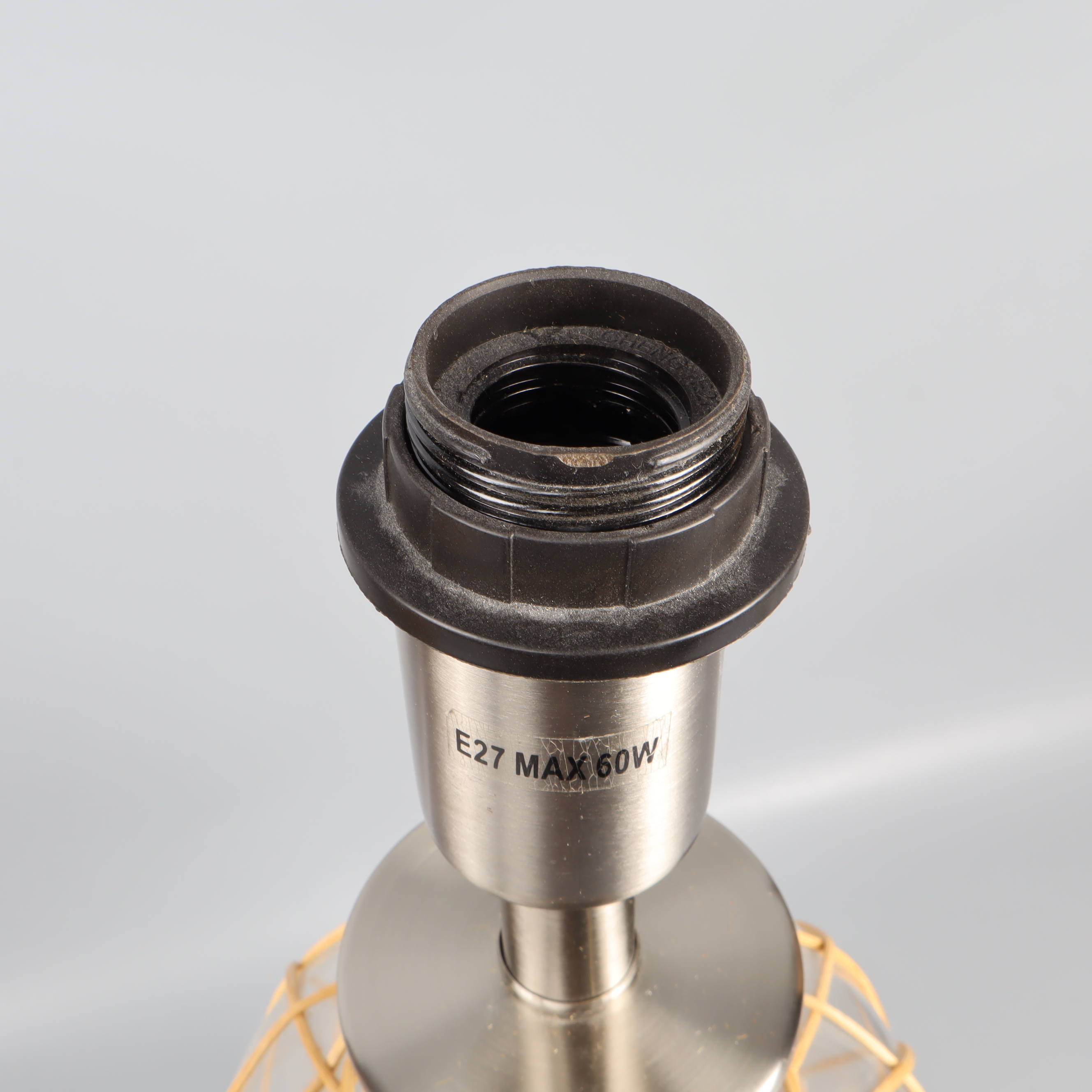 Denna unika bordslampa erbjuder både stil och funktionalitet för alla rum. Designad med en transparent glascylinder, omges den av ett elegant flätat nät som skapar ett iögonfallande utseende. Den övre delen är prydd med en texturerad lampskärm i beige ton, som ger ett varmt och inbjudande ljus.