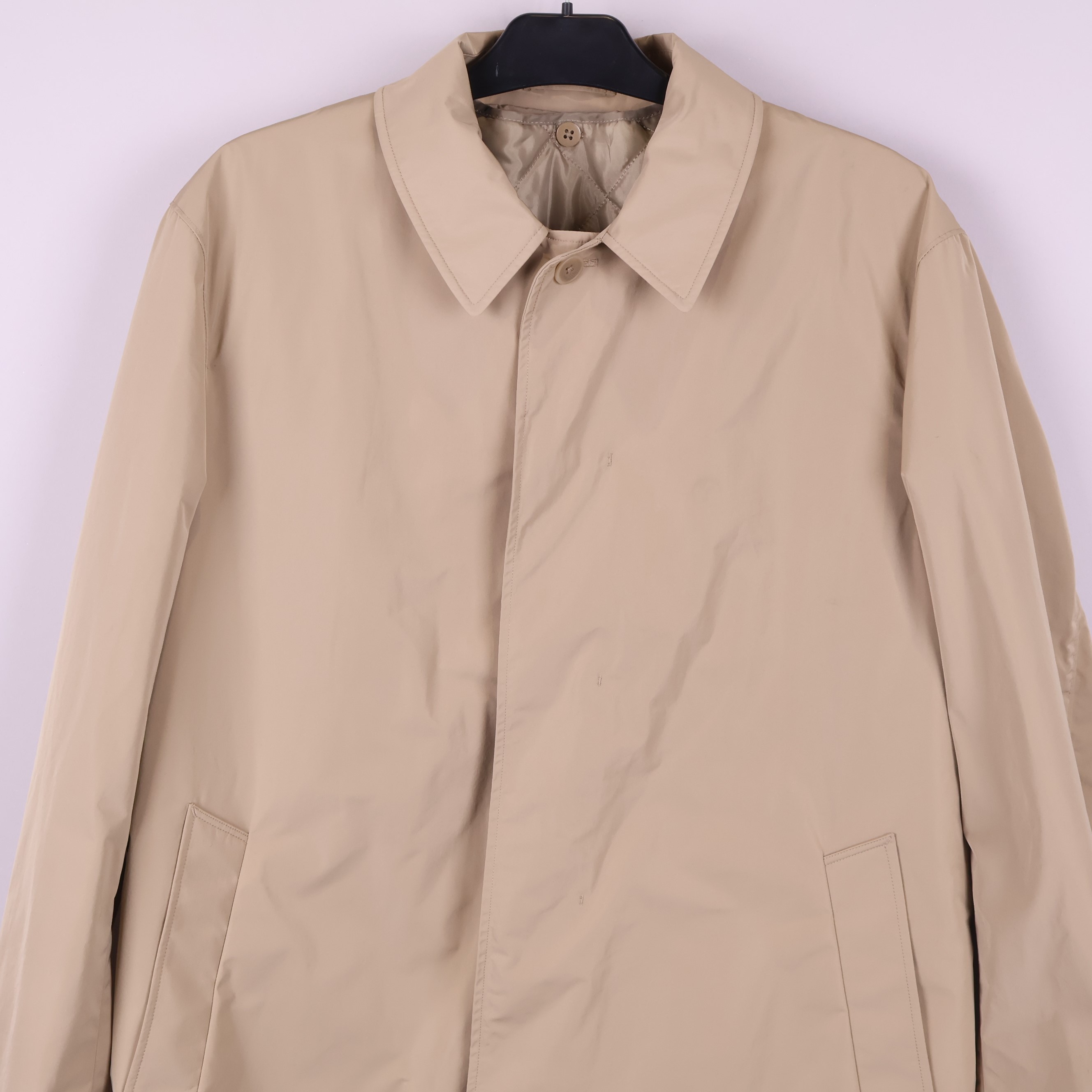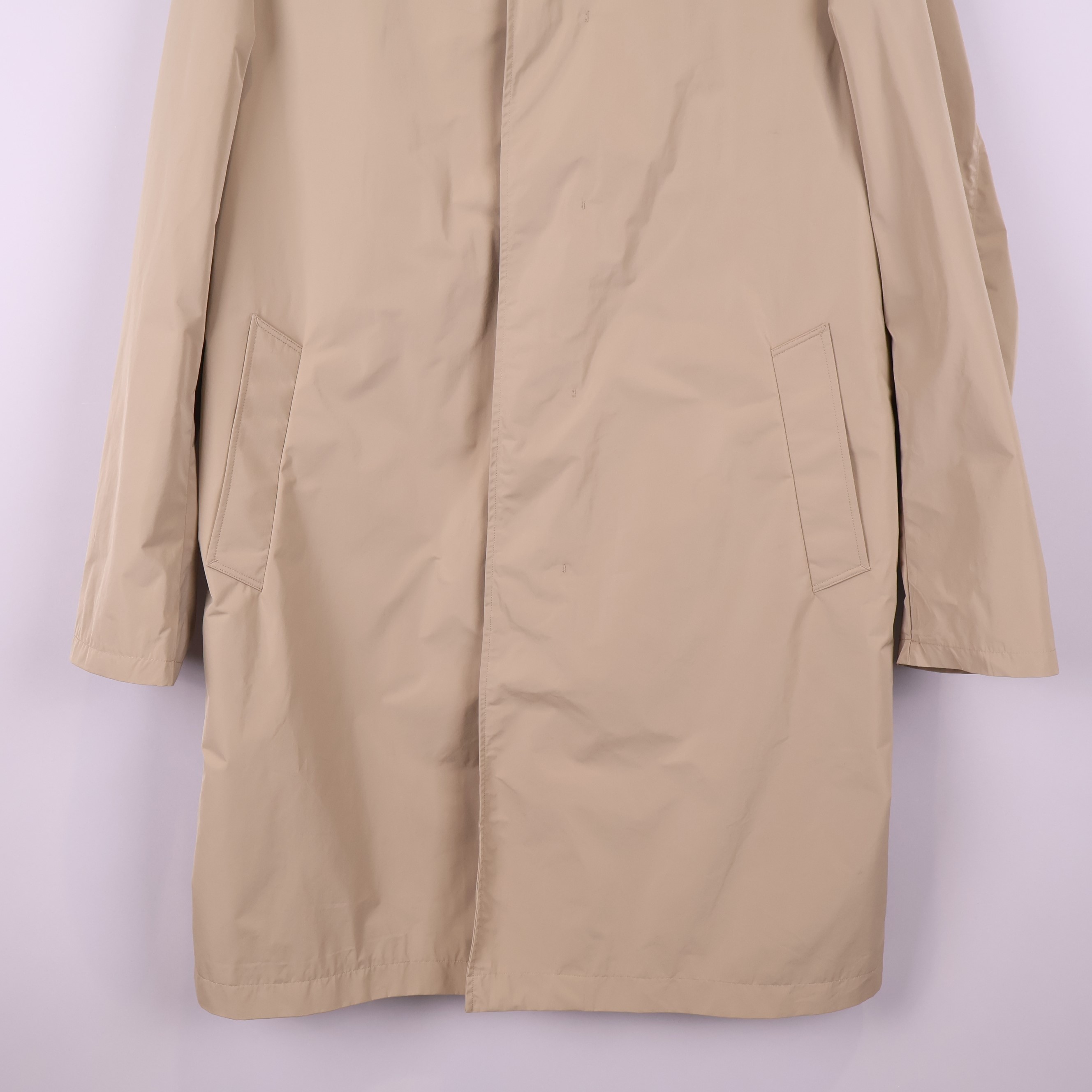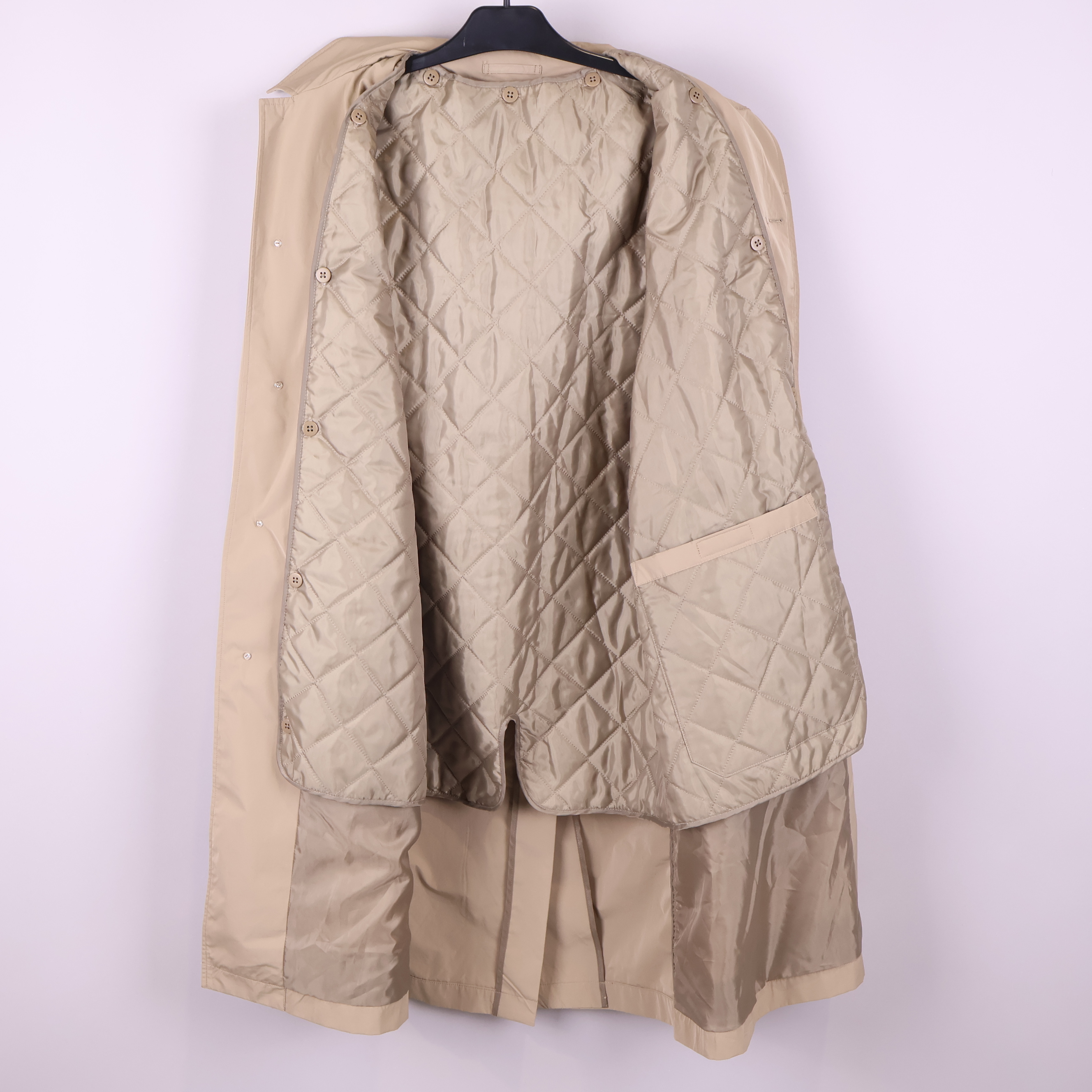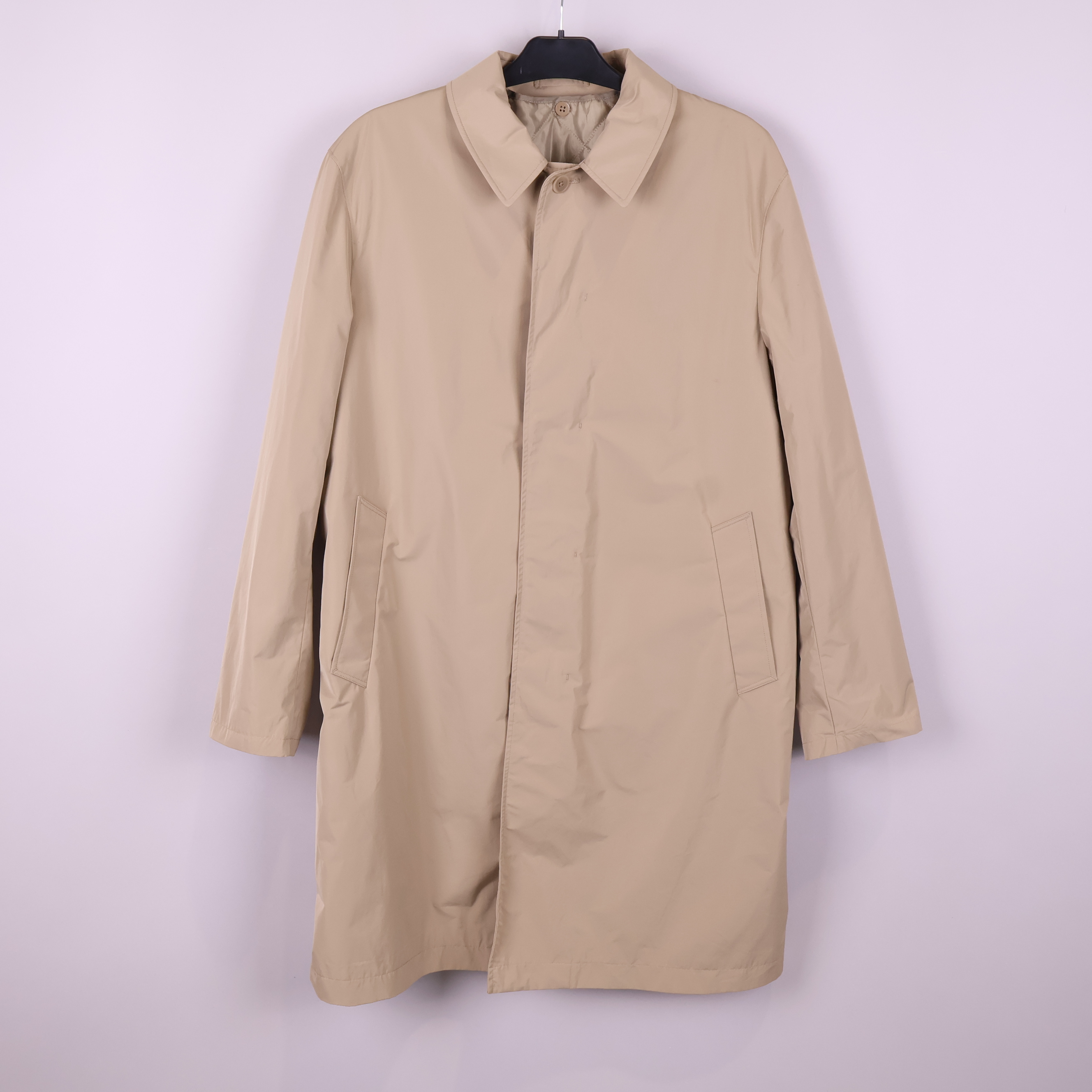 En stilren trenchcoat i beige med rak passform och diskret krage. Jackan har dold knäppning framtill och två snedställda fickor.
