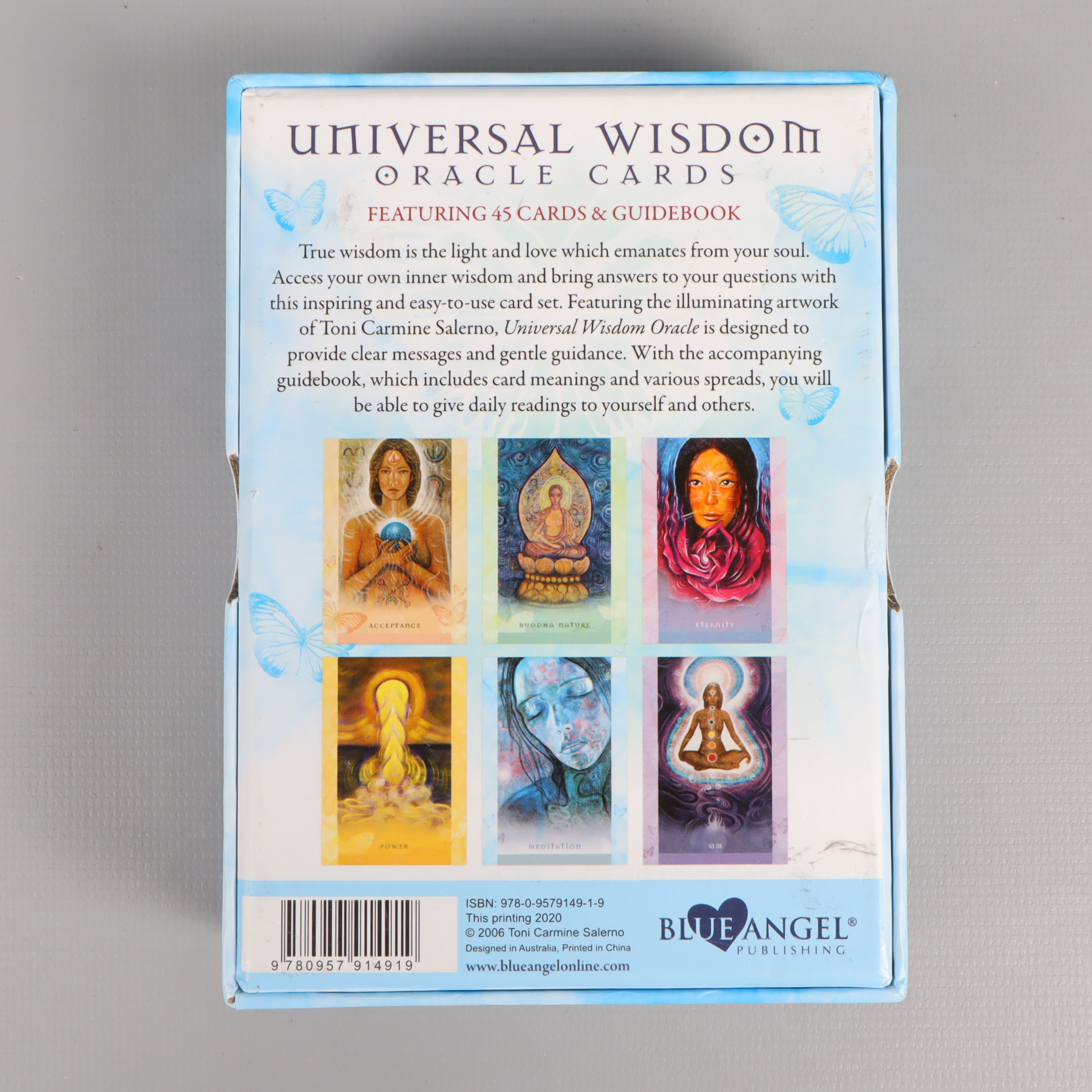 Blue Angel Publishing Universal Wisdom orakelkortset 129 kr Product variation Antal st Beskrivning Utforska dina inre tankar med detta färgstarka orakelkortset, inklusive 45 illustrerade kort och en engelskspråkig guidebok på 45 sidor. Korten har fantasifull konst och mjuk, harmonisk design som skapar en unik och inspirerande känsla. Visa all beskrivning Detaljer Övrigt: 45 kort + guidebok på engelska US, sidor Skick Gott skick Produkten har använts men är av fin kvalitet och ska inte ha några skador eller förslitningar. Läs mer om hur vi bedömer Utgivningsår 2002 Varumärke Blue Angel Publishing Produkten är unik och finns enbart som 1 st i lager. Fri frakt på alla köp över 990 kr. 14 dagars ångerrät.