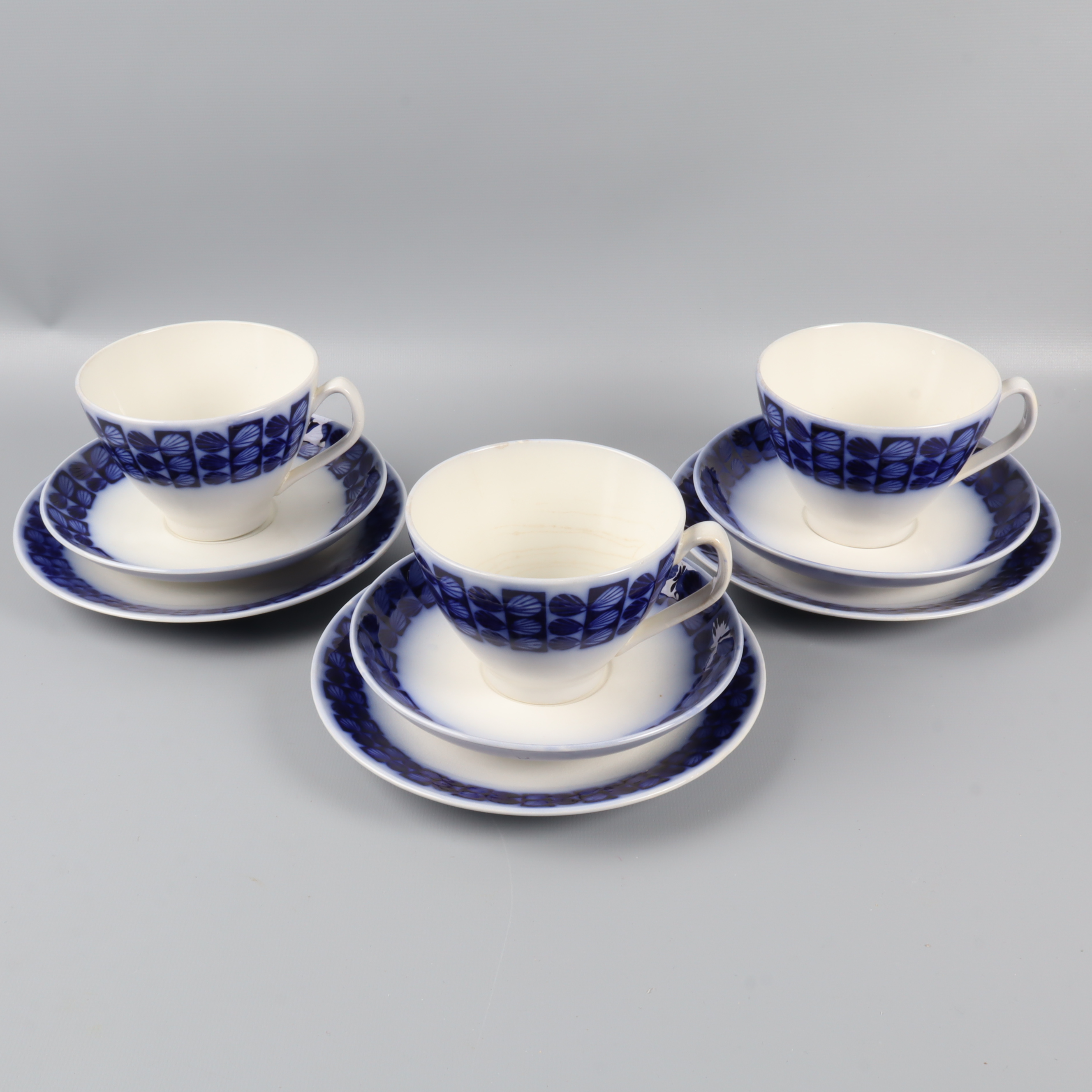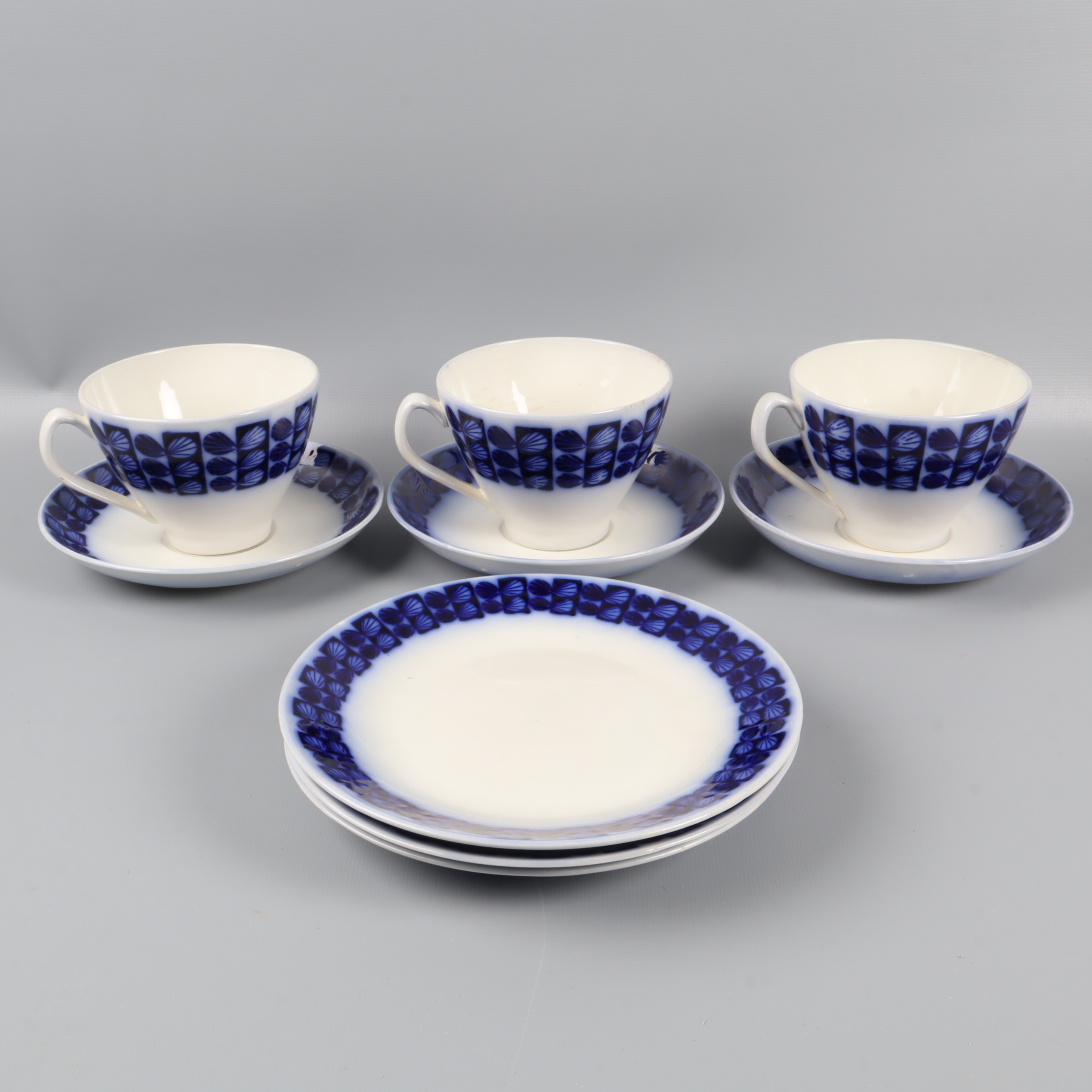 Upsala-Ekeby Gefle Uppsala Ekeby Berit Ternell kaffeservis 9 delar 349 kr Product variation Antal st Beskrivning Set om tre kaffekoppar med tillhörande fat, dekorerade med blå geometriska mönster mot crèmevit botten. Skandinavisk retro-design som ger en tidlös och charmig känsla. Perfekt när du vill ha klassisk stil med vintage vibe på fikabordet. Visa all beskrivning Detaljer Koppar Höjd: ca 8cm, Diameter: ca 10cmFat Diameter: ca 15cmAssietter Diameter: ca 17cm Övrigt: Fläckar (bild 6) / 9 Delar Skick Använt skick Produkten har blivit använd och kan ha slitits eller ha mindre skador Läs mer om hur vi bedömer Färg Grå Material Porslin Varumärke Upsala-Ekeby Gefle Produkten är unik och finns enbart som 1 st i lager. Fri frakt på alla köp över 990 kr. 14 dagars ångerrät.