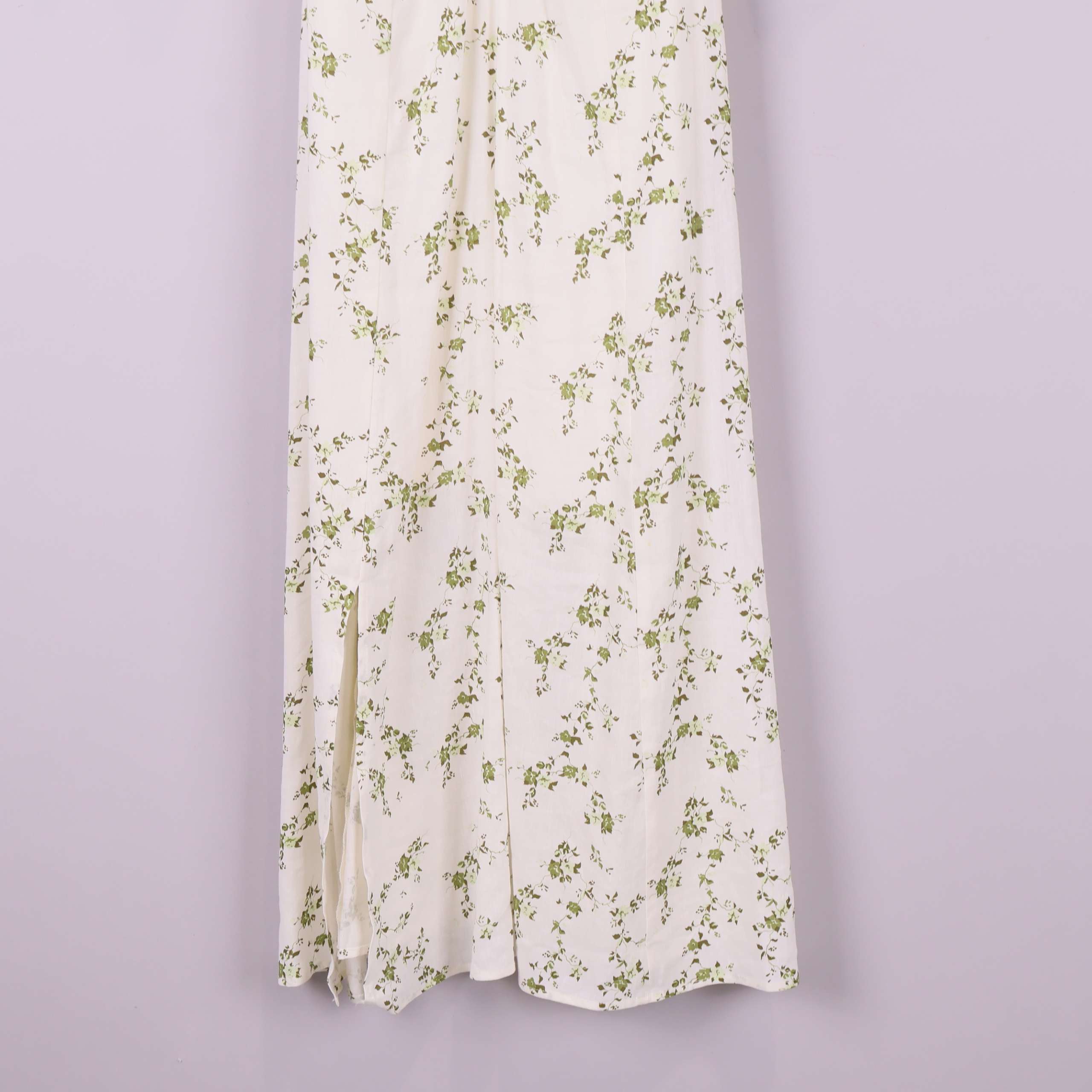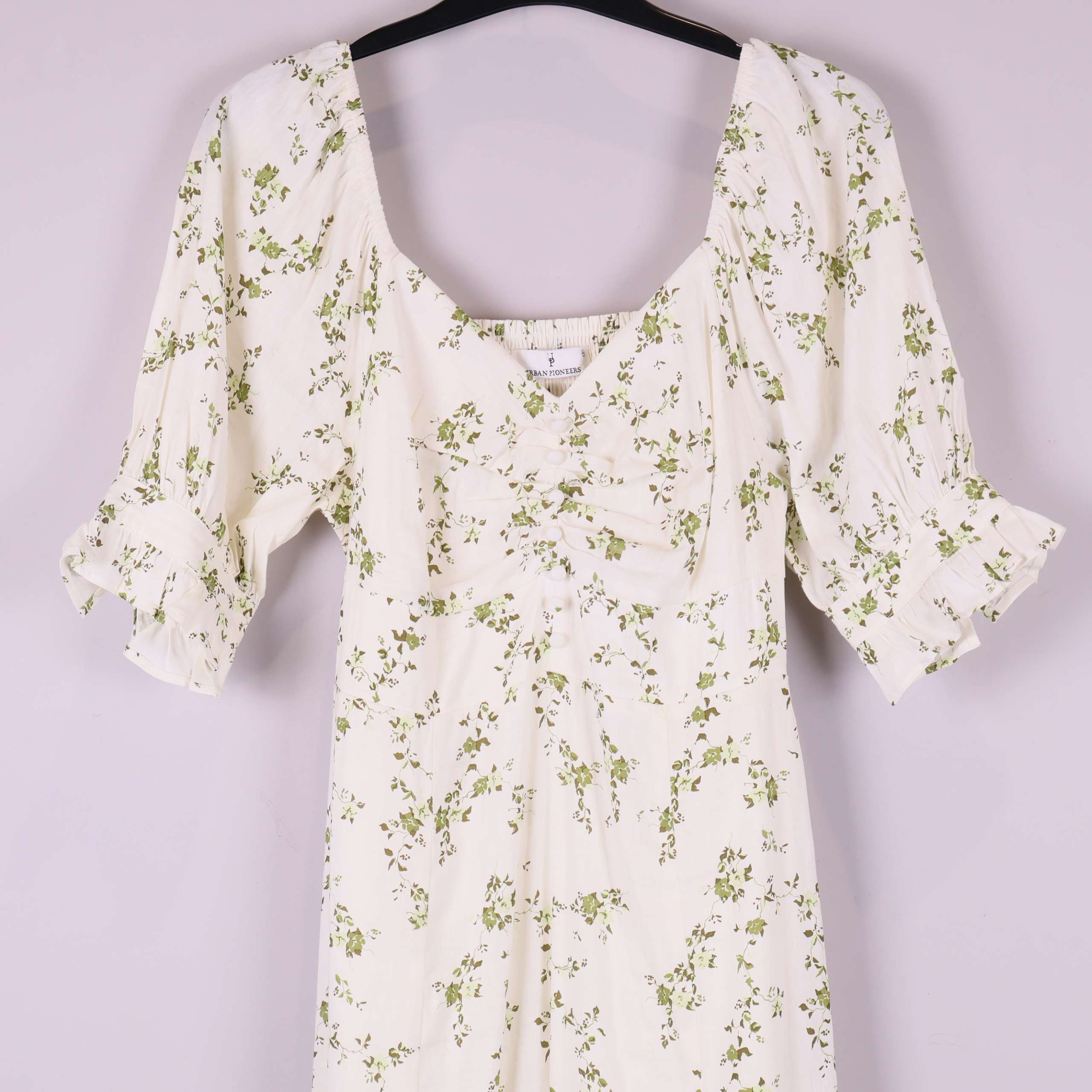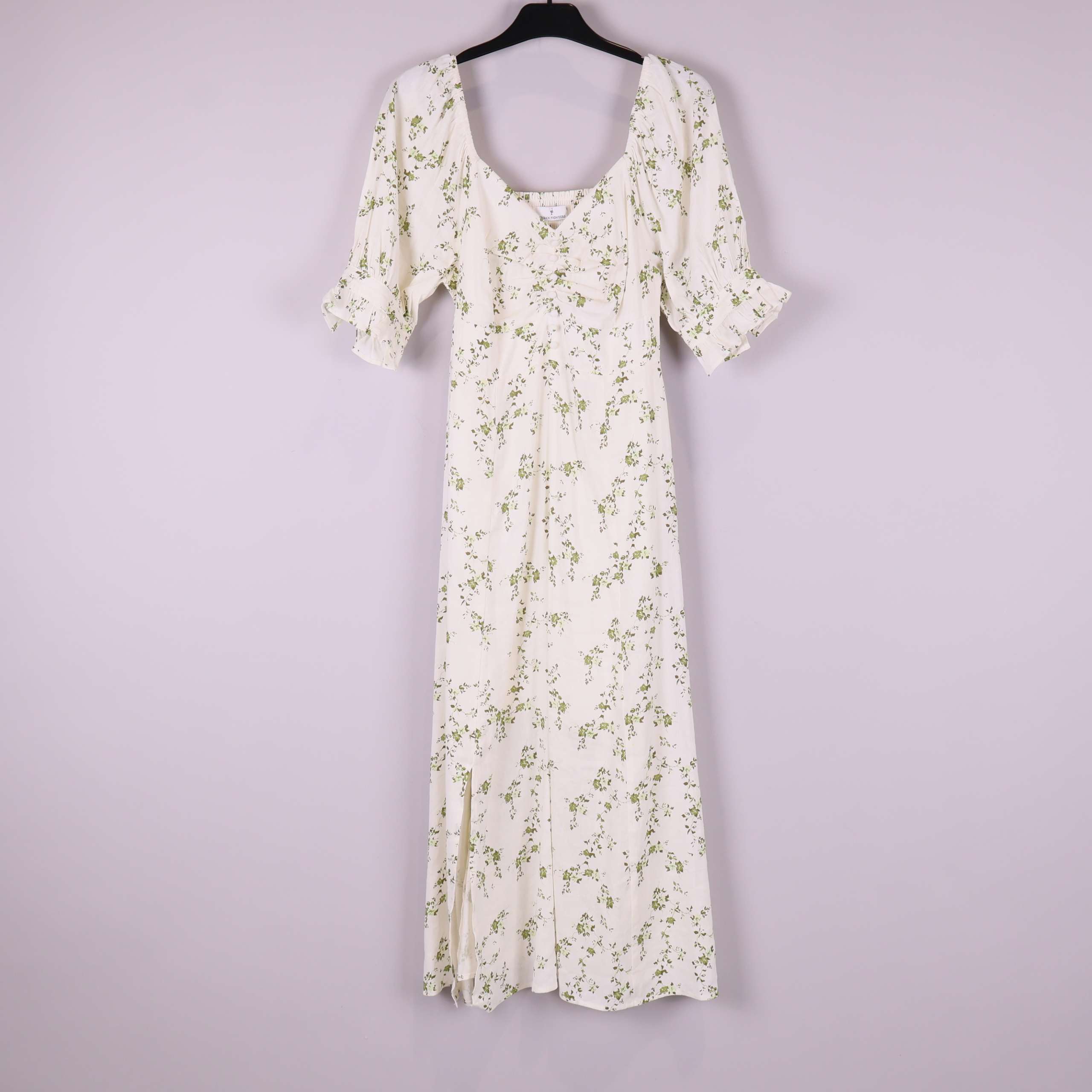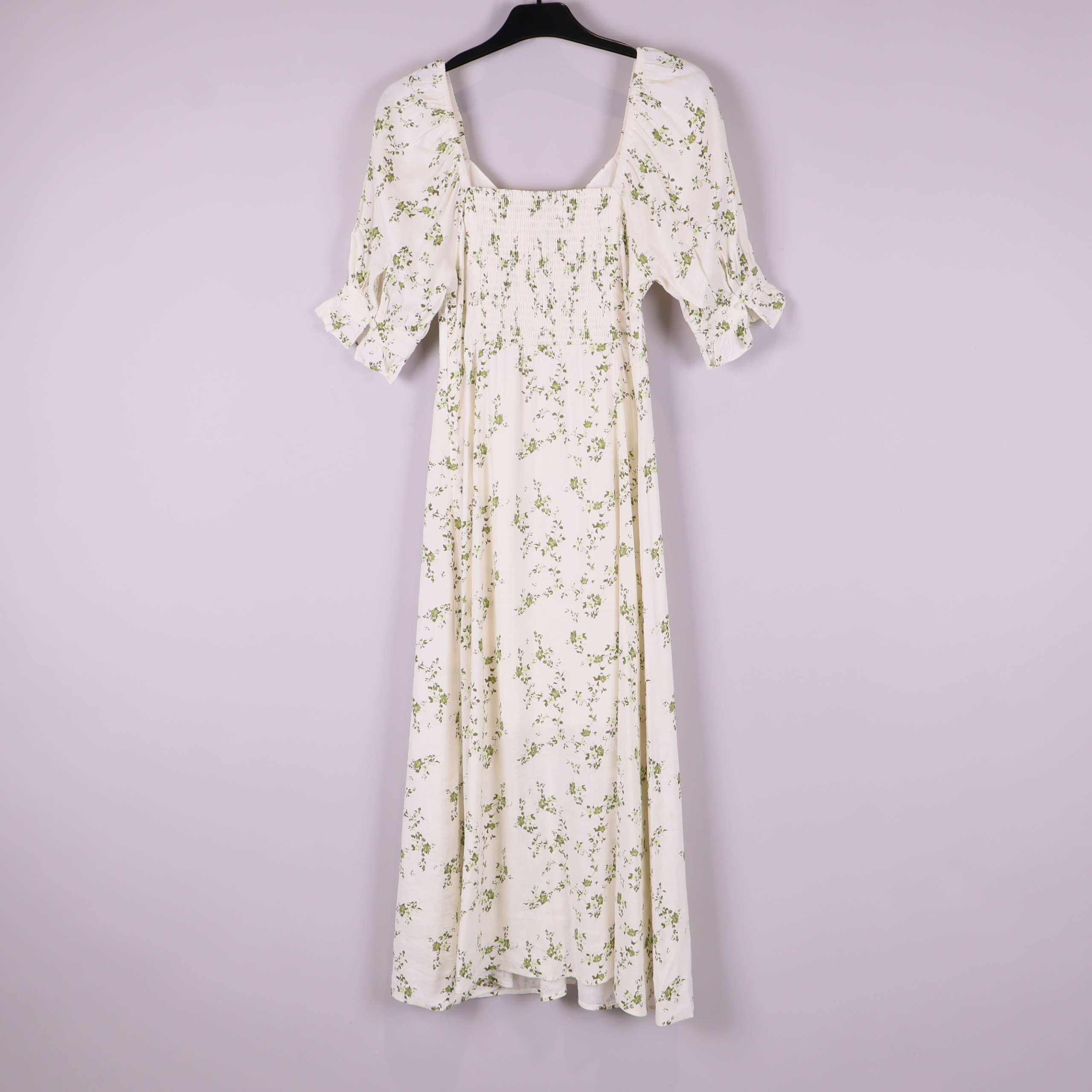 Lång klänning i en mjuk, ljus ton med subtilt blommigt mönster i grönt. Modellen har elastisk rynkad rygg och vida puffärmar med resår i ärmslut samt söt rynkning över bysten. Tunt, följsamt tyg som ger ett luftigt och bekvämt uttryck, perfekt för relaxed fit och somrig vintage vibe.