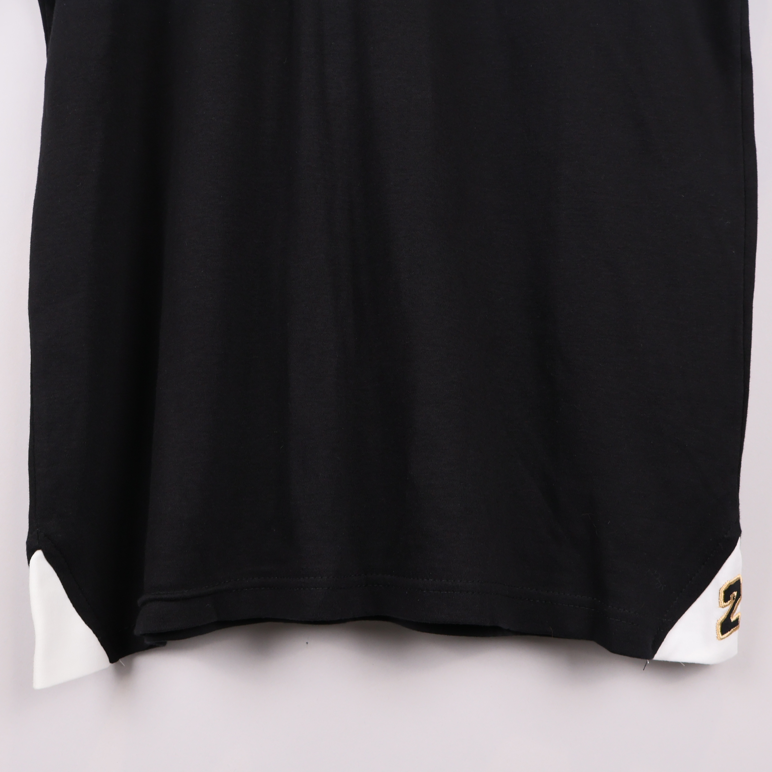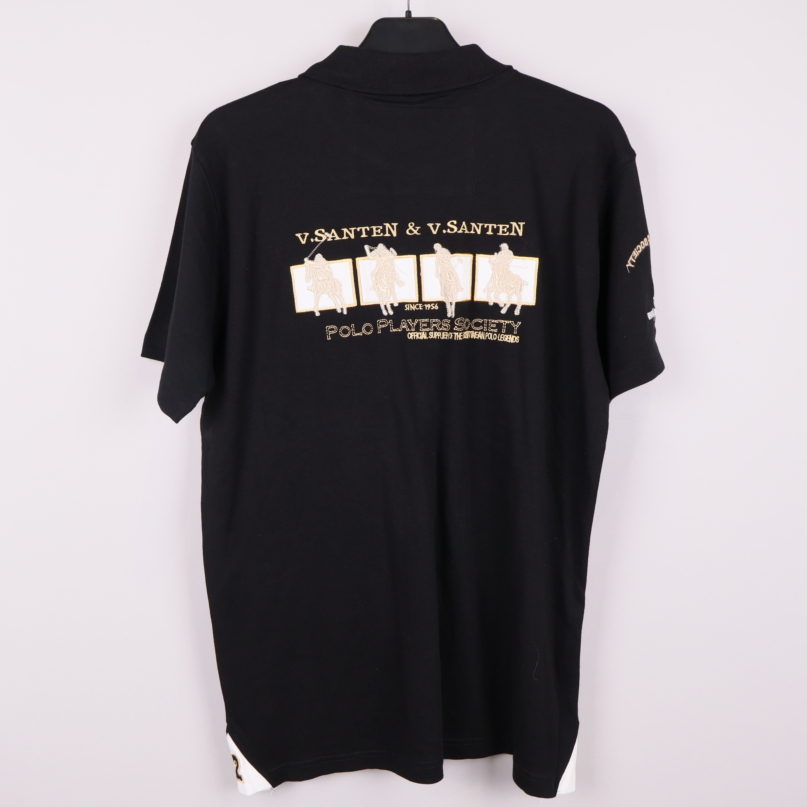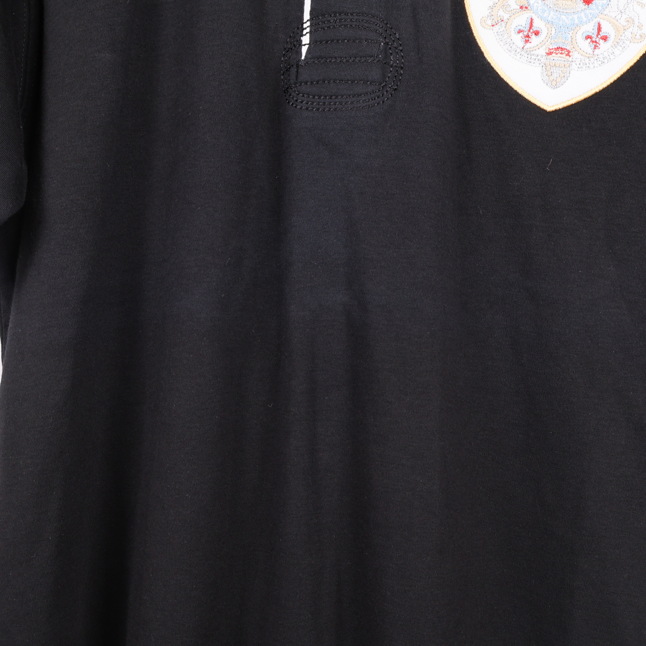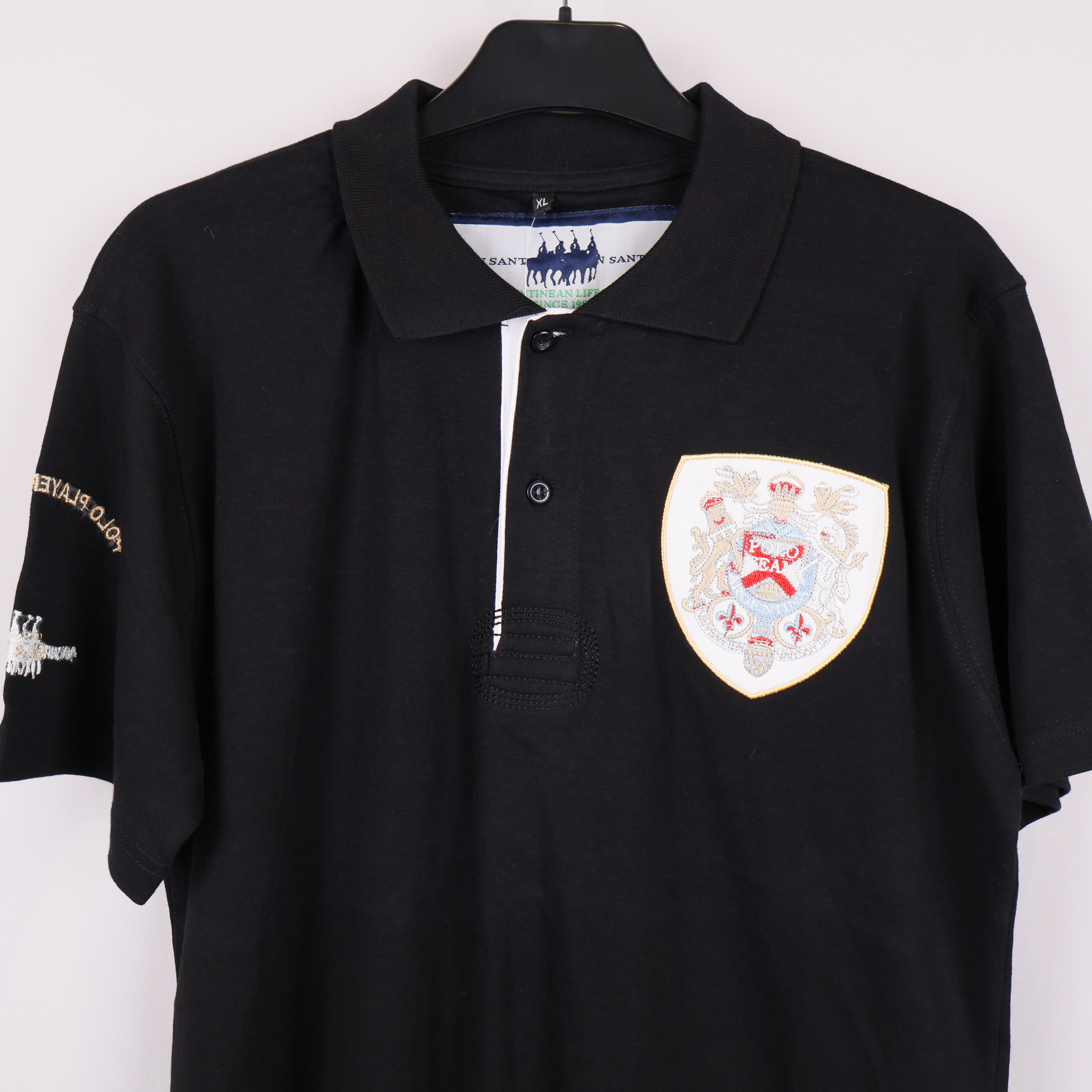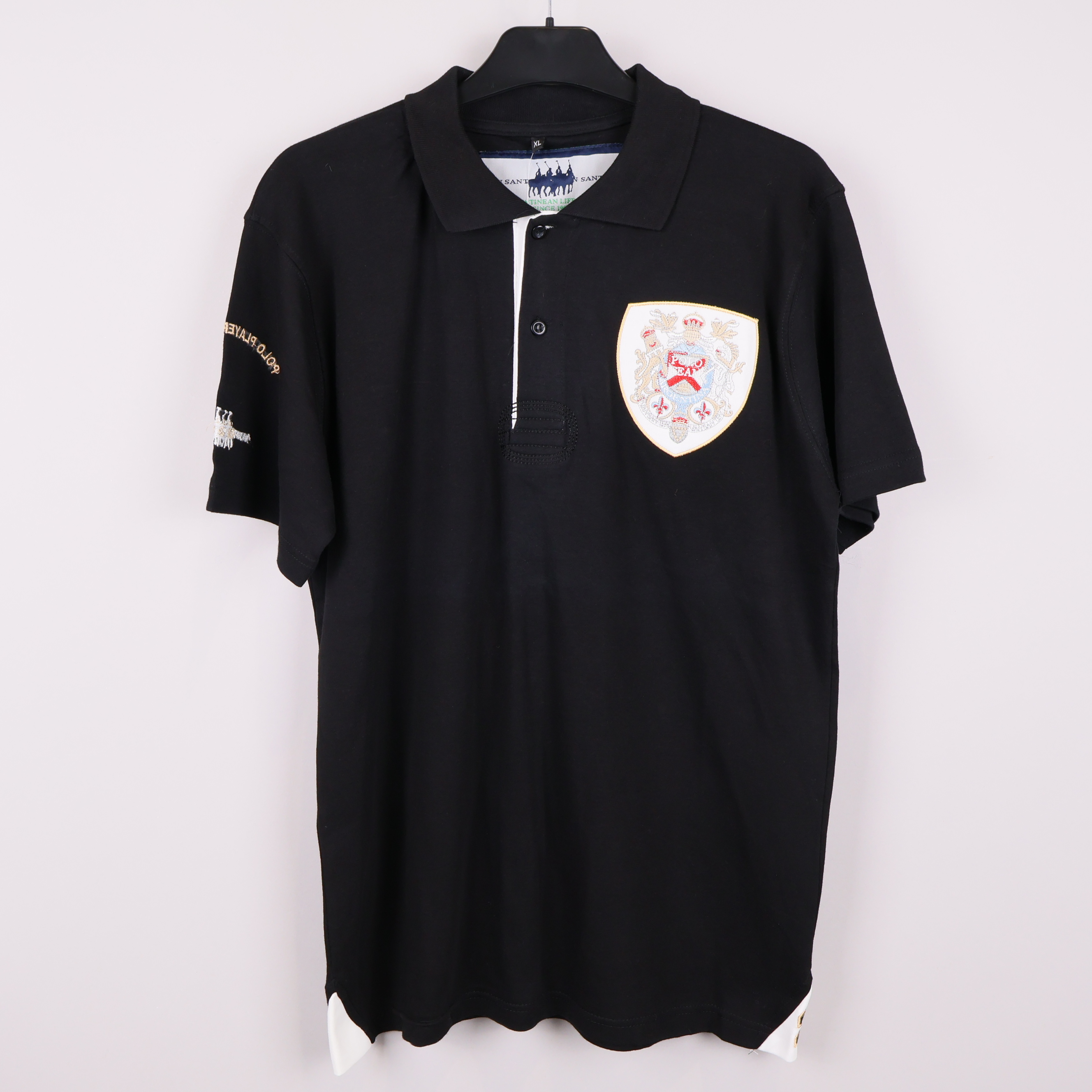 Modern pikétröja i svart med elegant broderat emblem på bröstet och detaljer i vitt. Rak passform med klassisk krage och knappslå framtill. Fina guldfärgade dekorationer på ärm och rygg ger en exklusiv känsla.