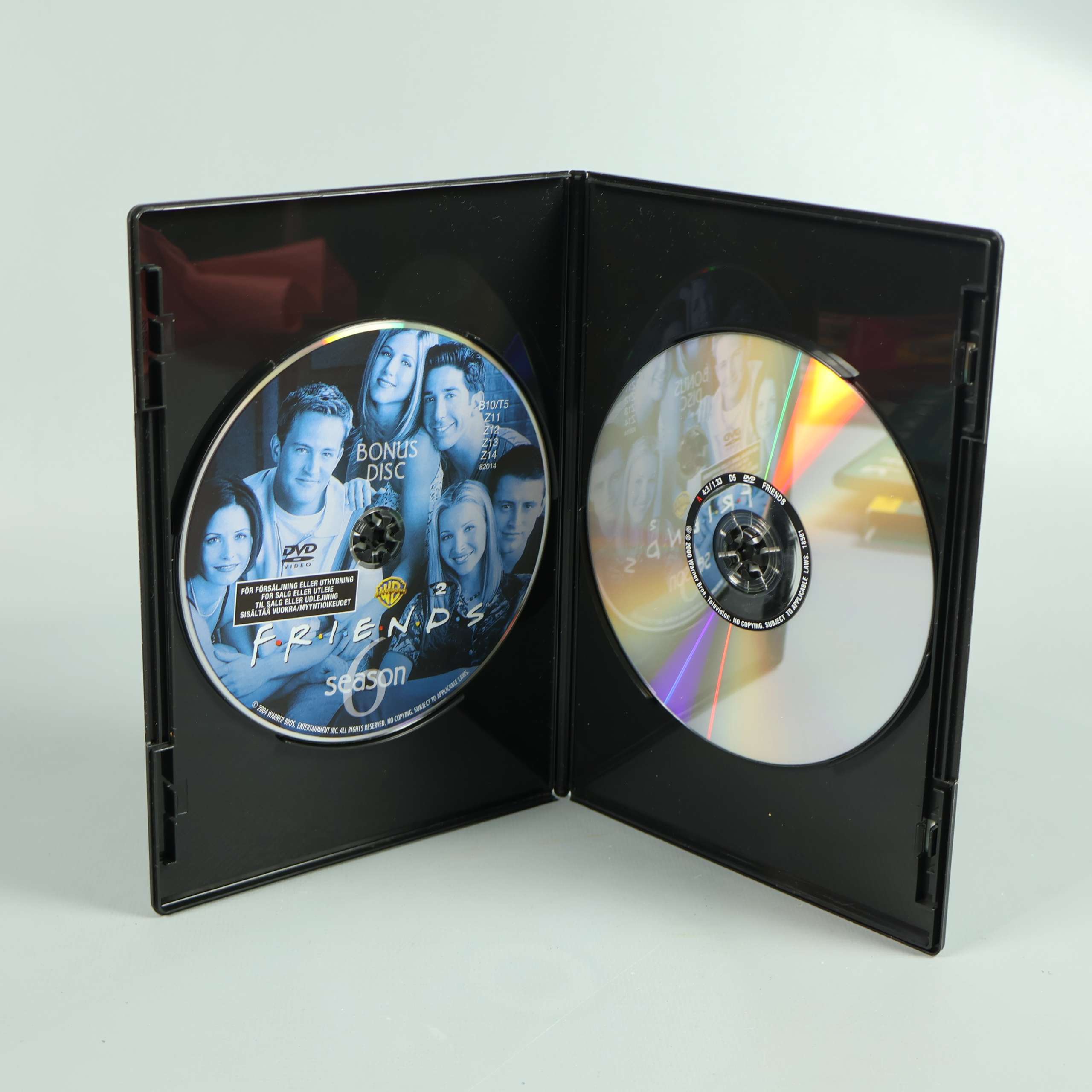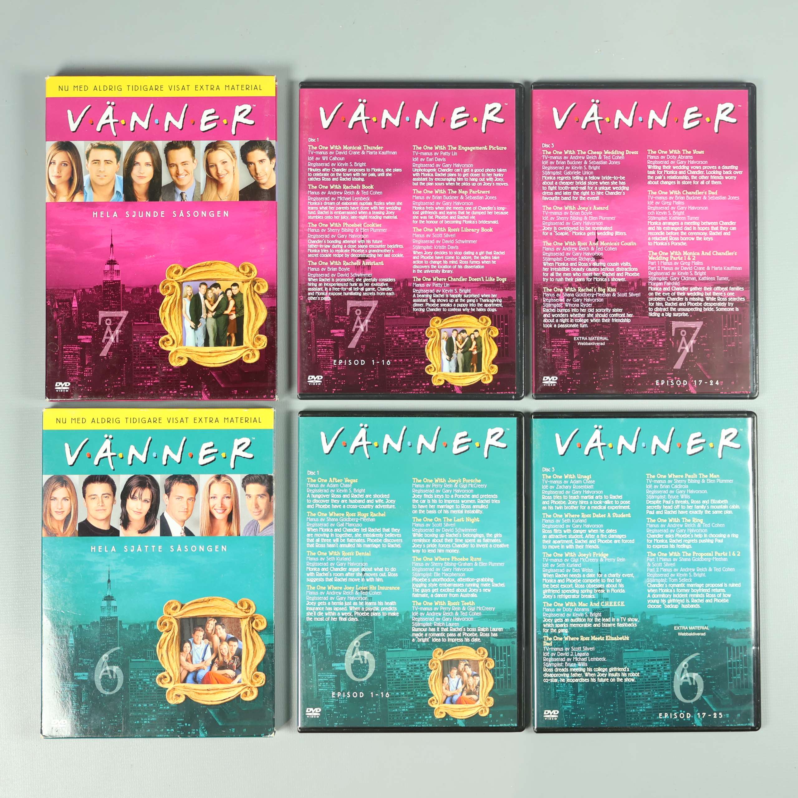 Upptäck två hela säsonger av den klassiska komediserien Vänner, säsong 6 och 7, samlade i snygga DVD-boxar med originaldesign. Perfekt för dig som vill återuppleva humorn, vänskapen och de ikoniska ögonblicken tillsammans med Rachel, Monica, Phoebe, Ross, Chandler och Joey. Varje box inkluderar flera skivor med både avsnitt och extramaterial, så att du kan njuta av timtals underhållning hemma. Omslagen har färgstarka tryck, serietypiska bilder på karaktärerna och lättlästa säsongsangivelser. Serien levereras på engelska och passar perfekt för både fans och den som vill ge bort en extra kul present. Denna upplaga har lätt slitage i hörnen på boxarna men skivorna är i använt men funktionsdugligt skick. Vänner är en tidlös sitcom som passar för både serie- och filmkvällar med vänner eller familj. Boxarna är smidiga att ställa i bokhyllan och lätt att ta fram när andan faller på.