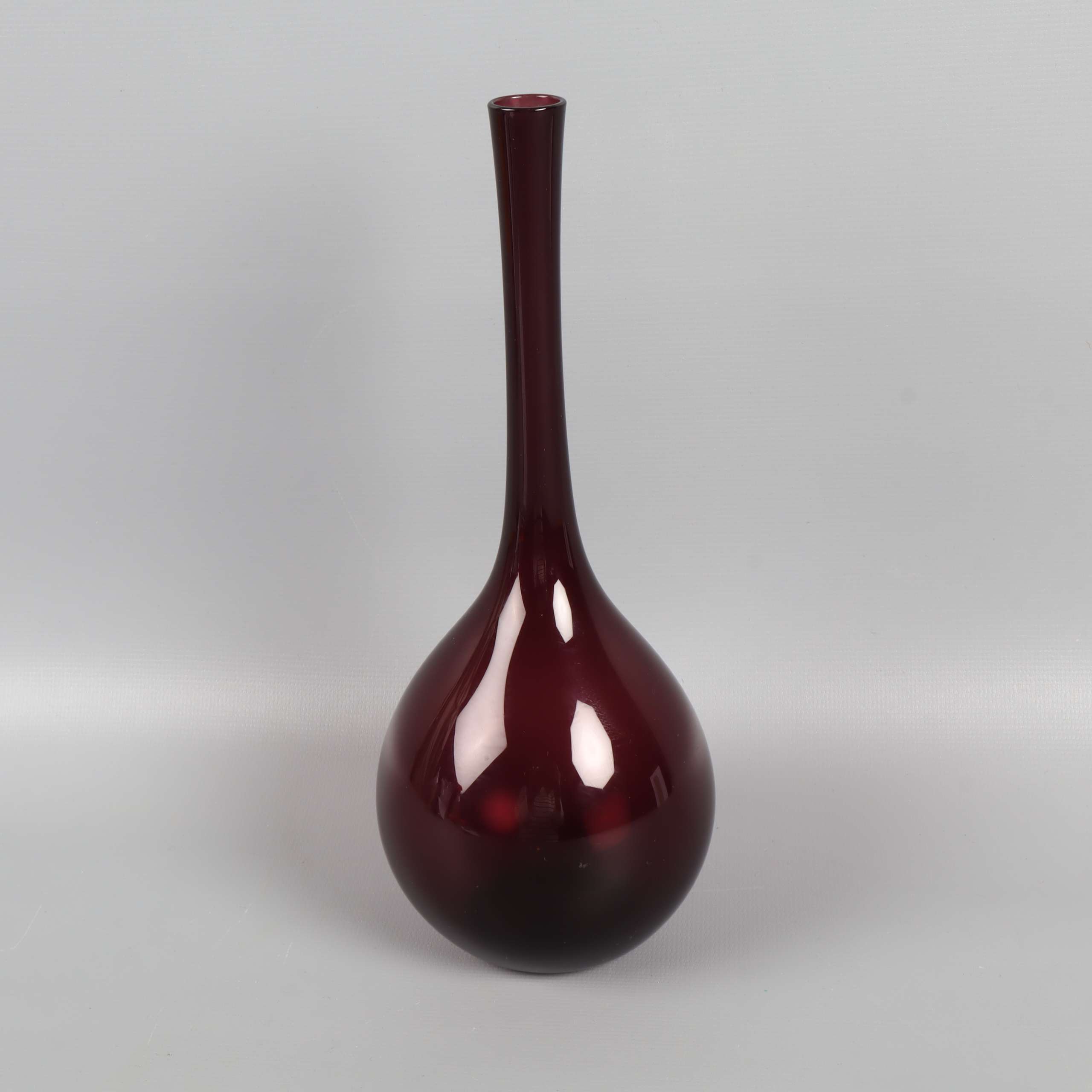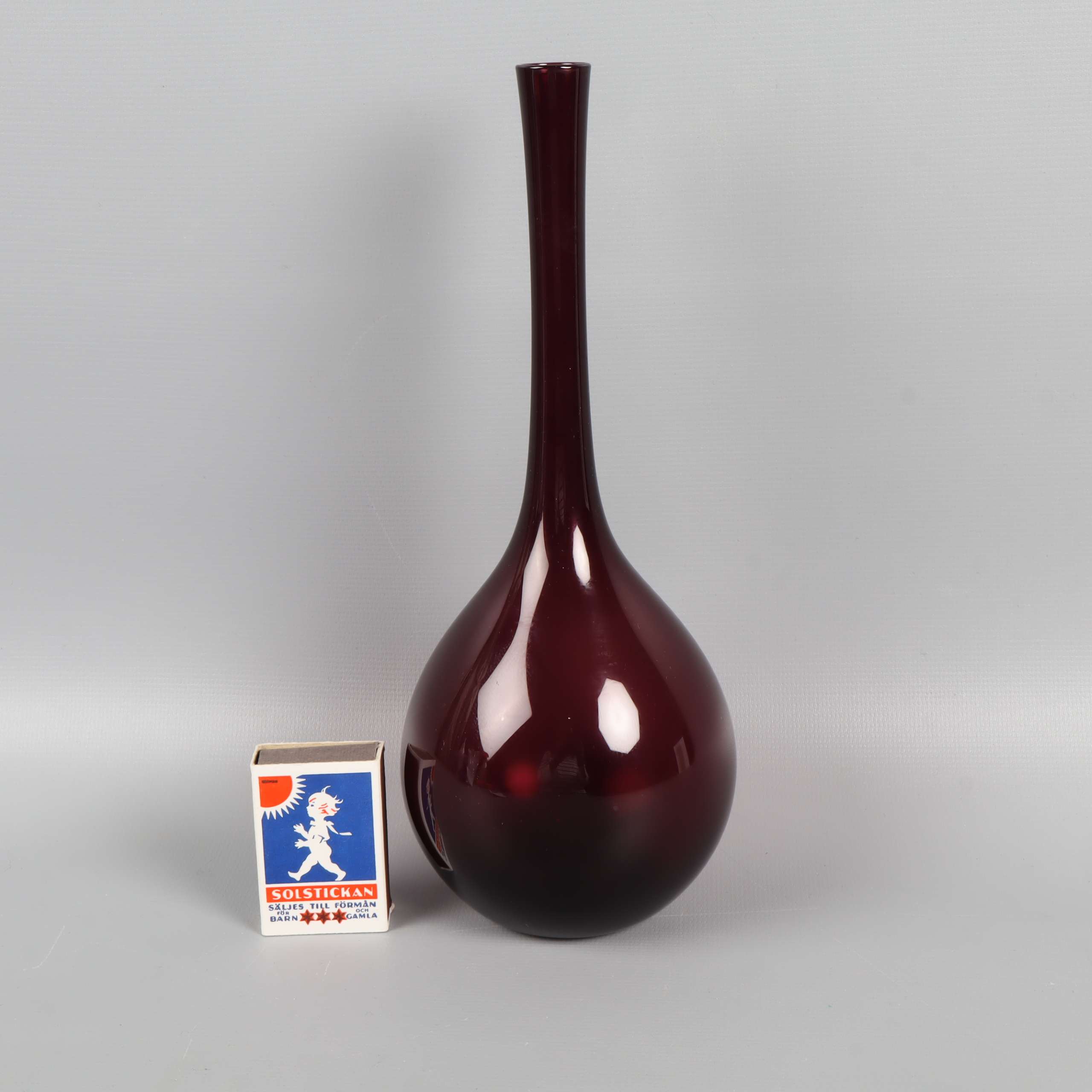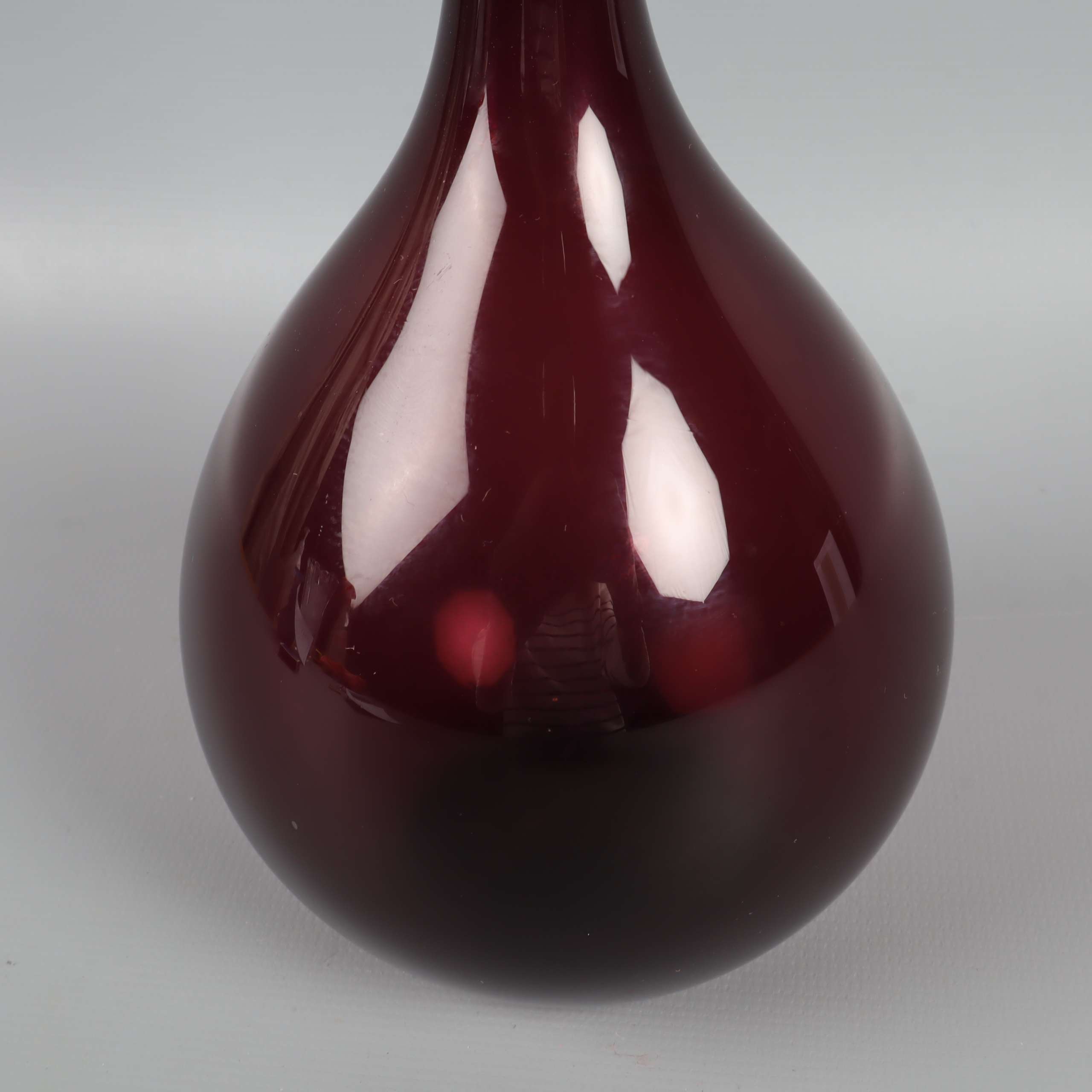 Stilren vas med droppformad botten och smal, hög hals som ger ett modernt intryck. Den blanka ytan och djupt vinröda färgen skapar en lyxig och samtida känsla.