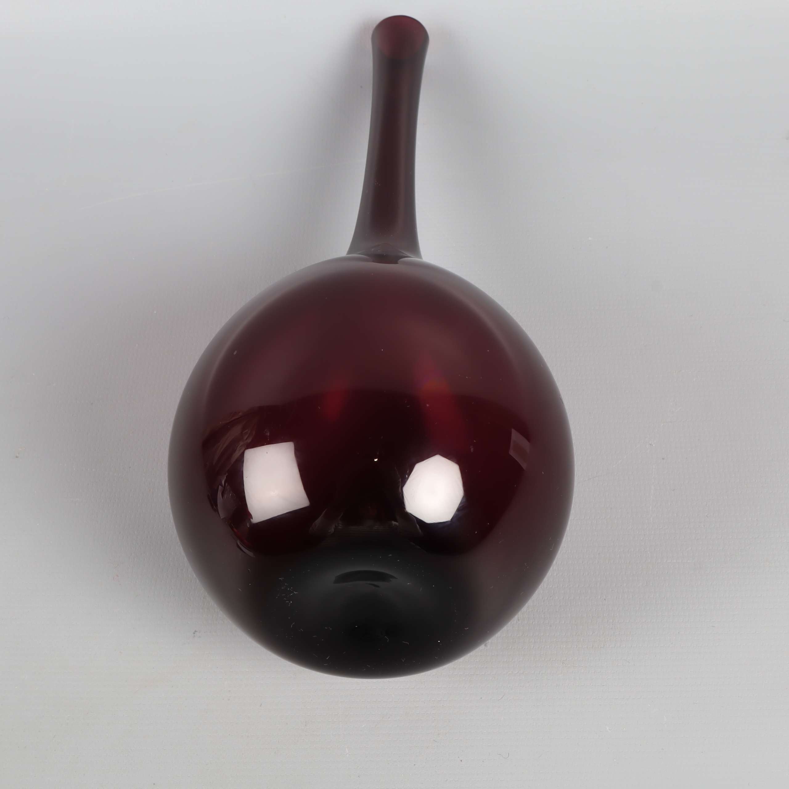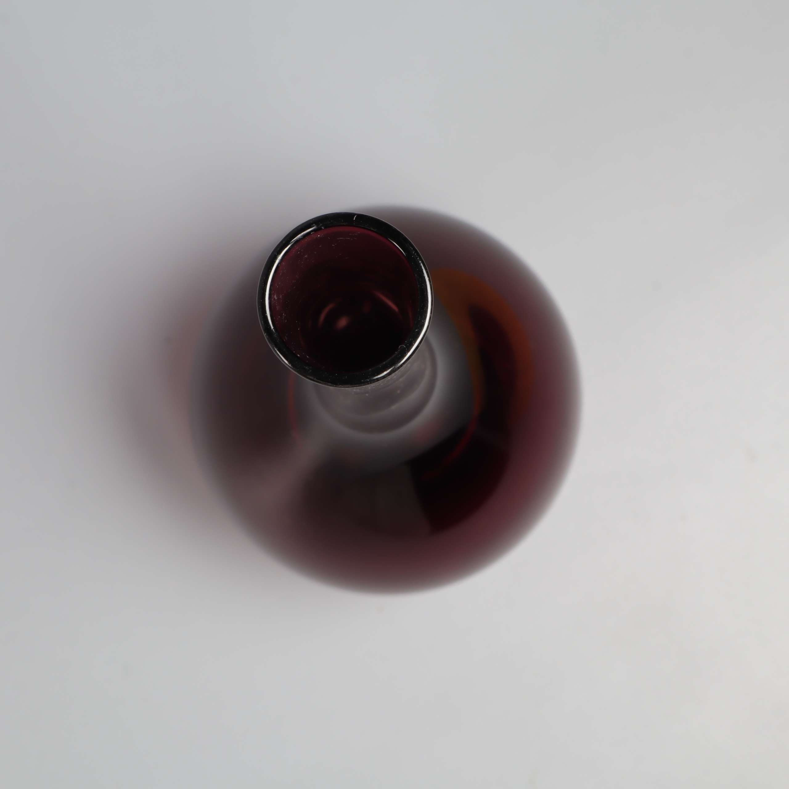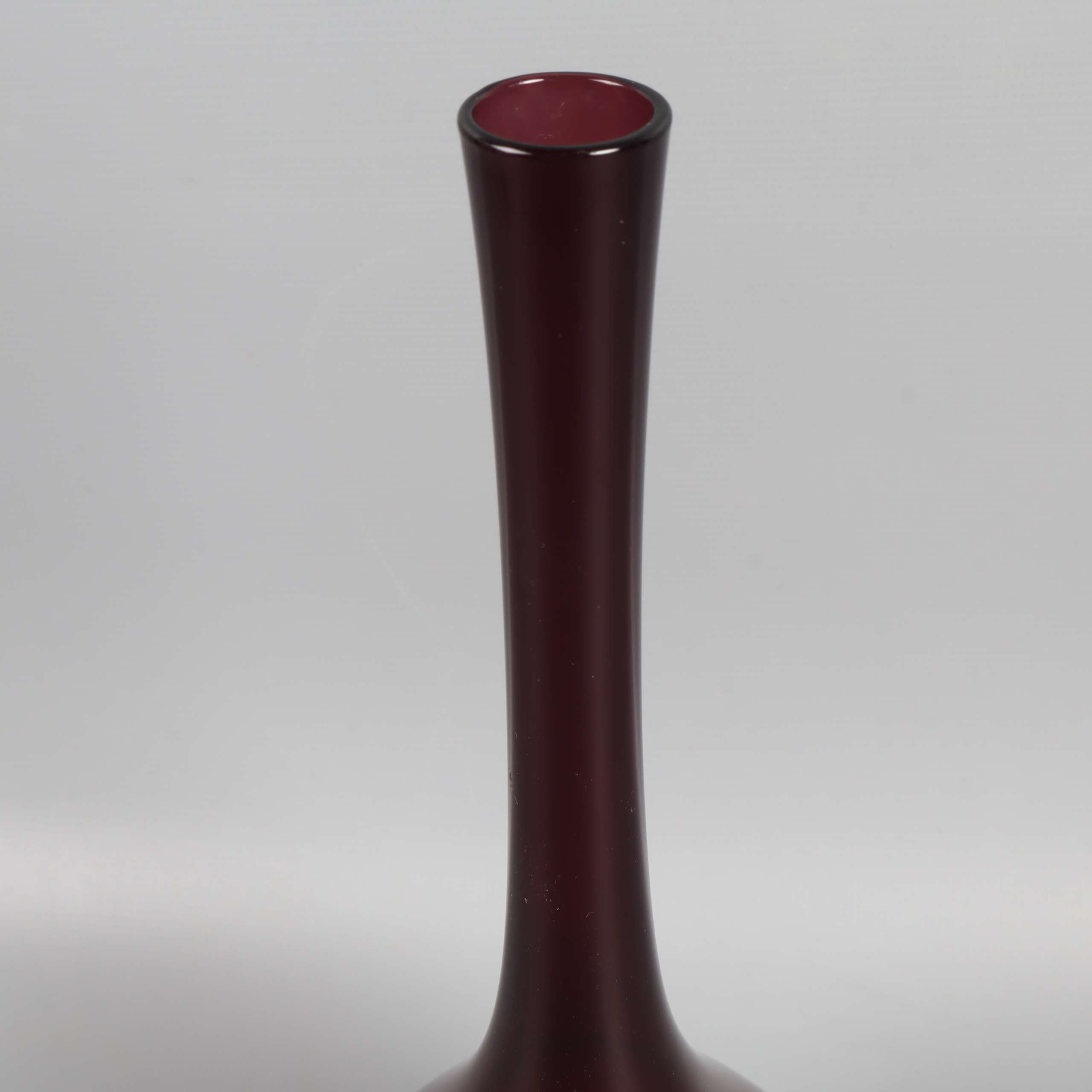 Stilren vas med droppformad botten och smal, hög hals som ger ett modernt intryck. Den blanka ytan och djupt vinröda färgen skapar en lyxig och samtida känsla.