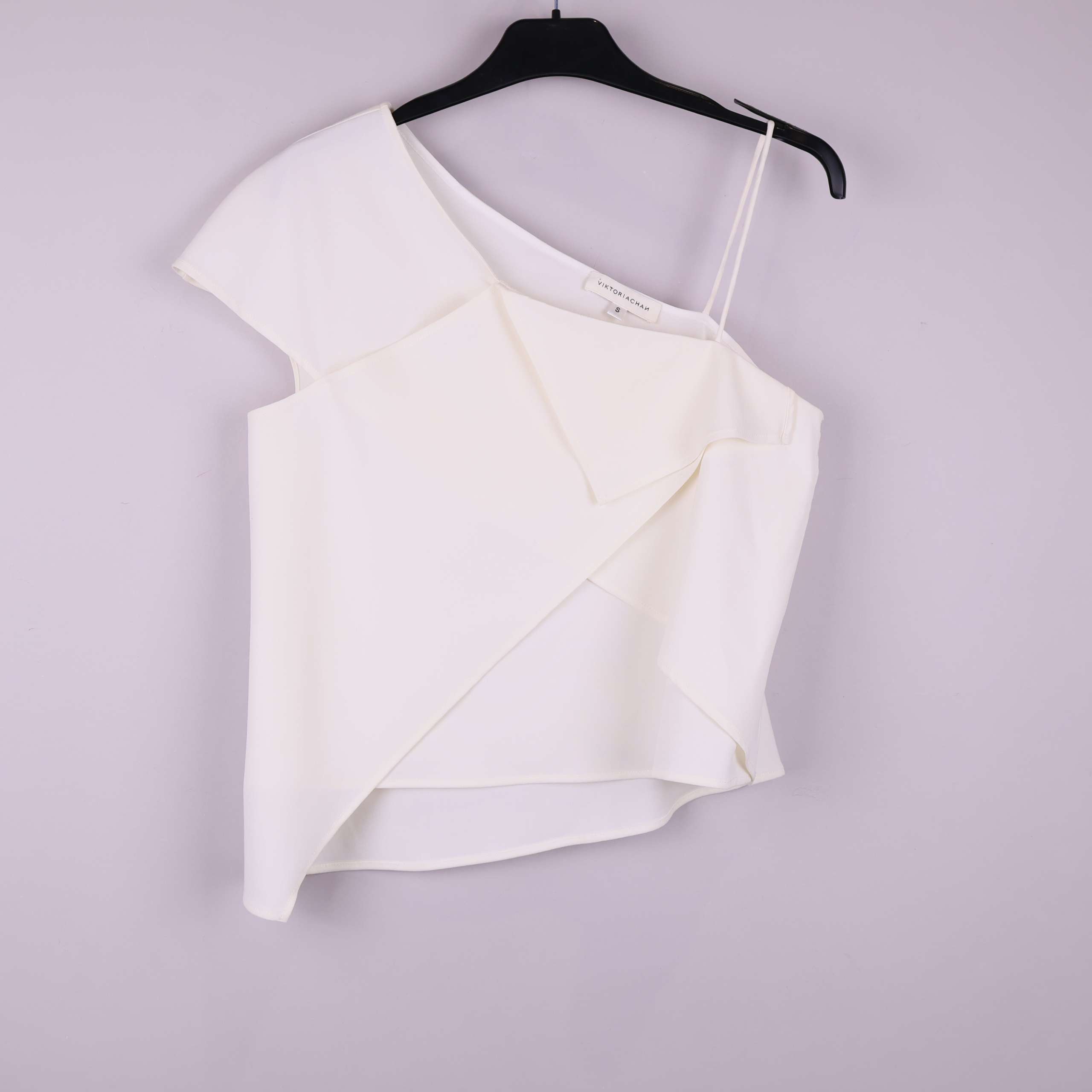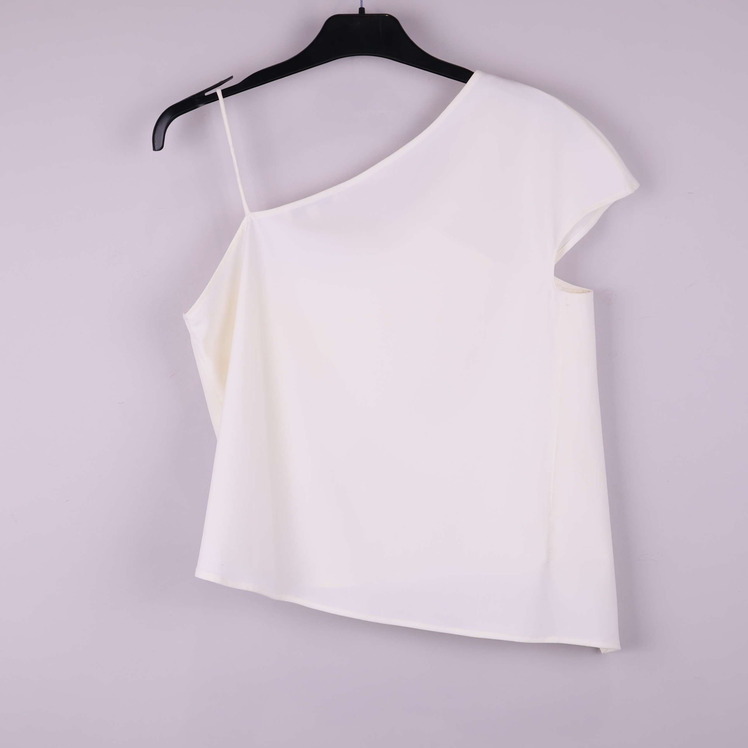 Stilren topp med asymmetrisk design, en axel och kontrasterande axelband för modern känsla. Mjukt tyg i ljust material som faller snyggt och ger en elegant look. Passar perfekt när du vill sticka ut med subtila detaljer och en luftig, bekväm känsla.
