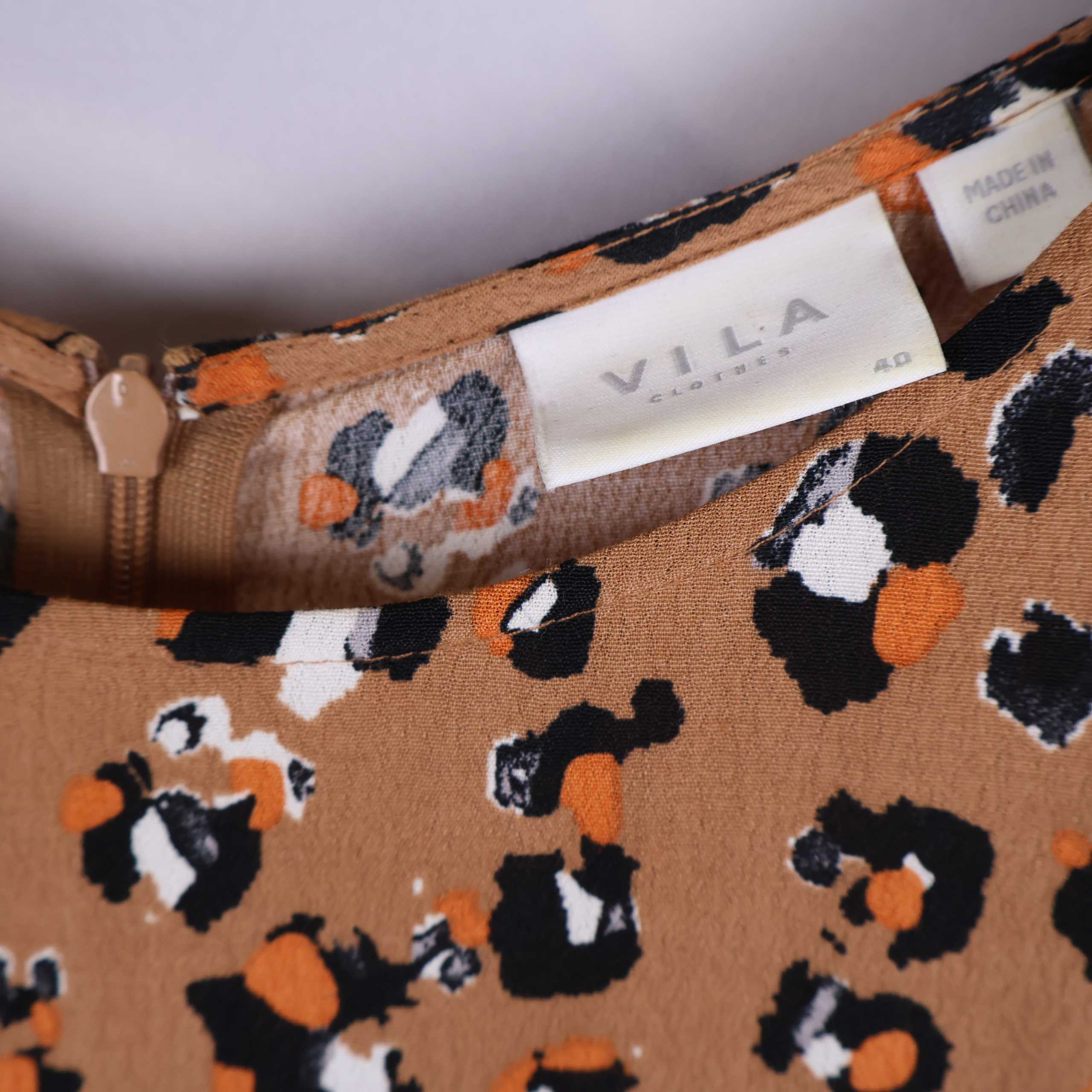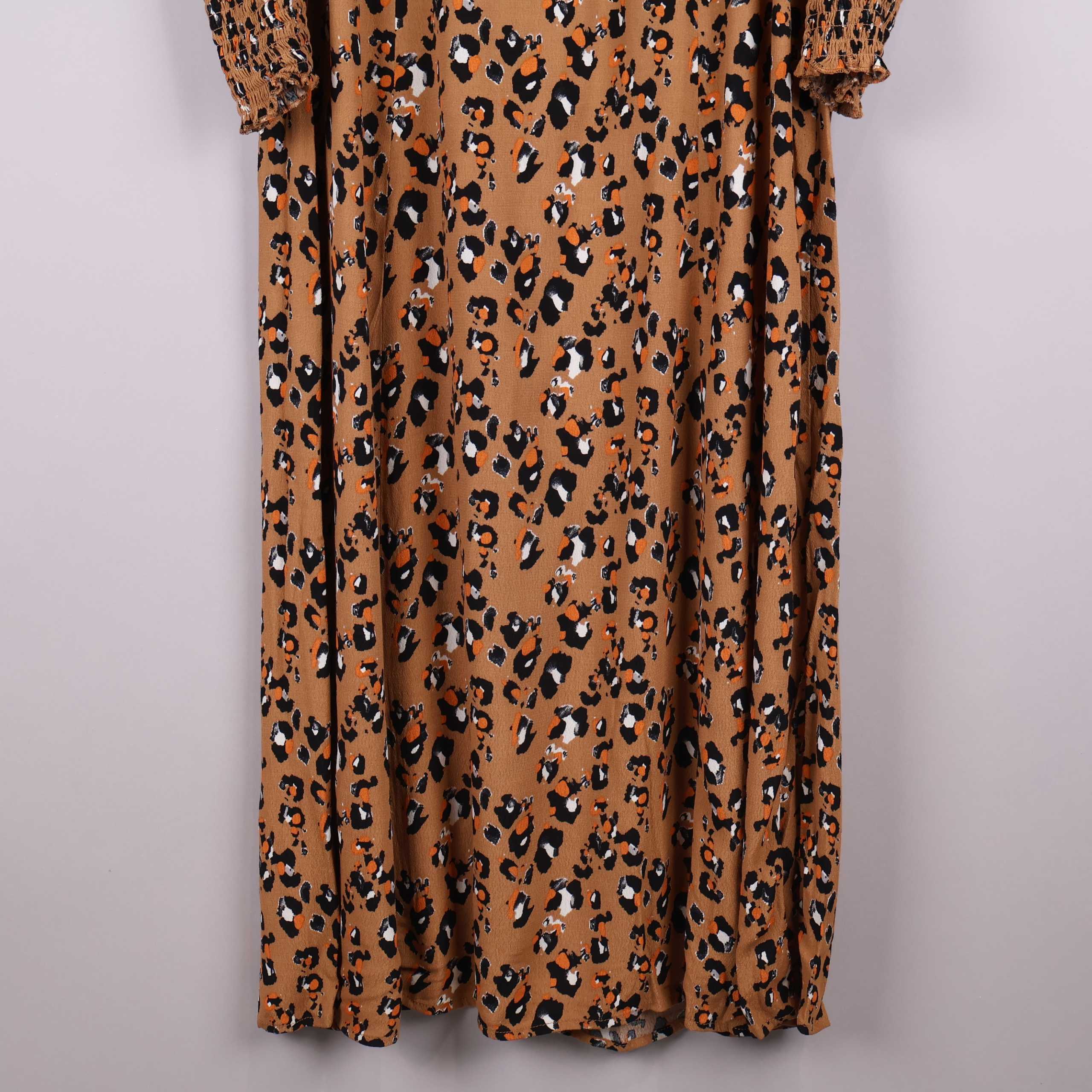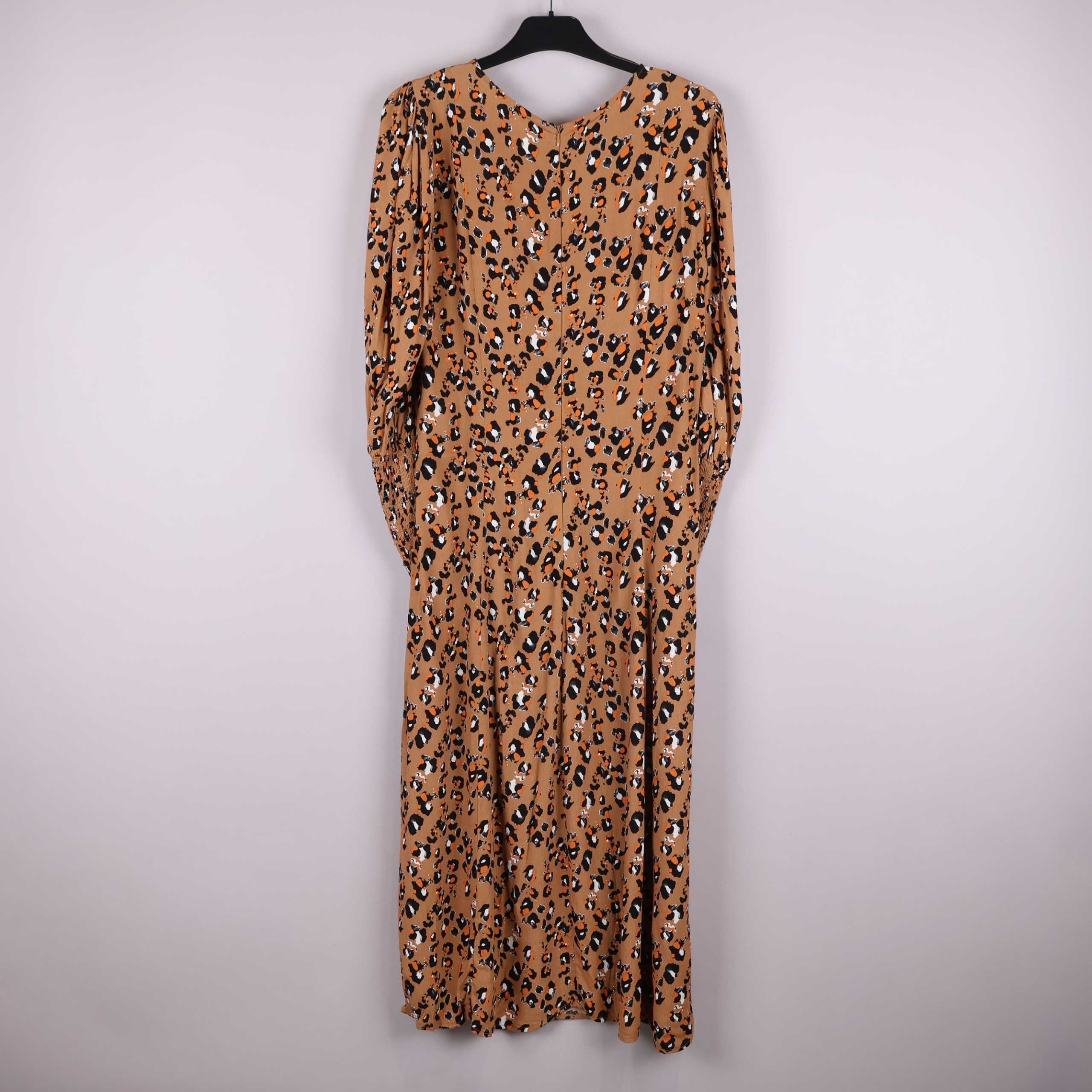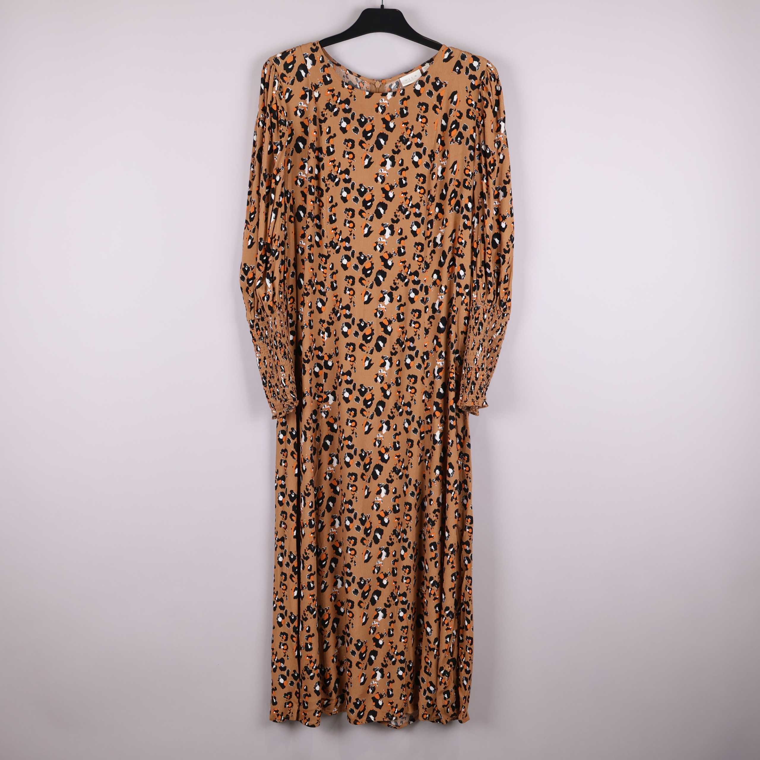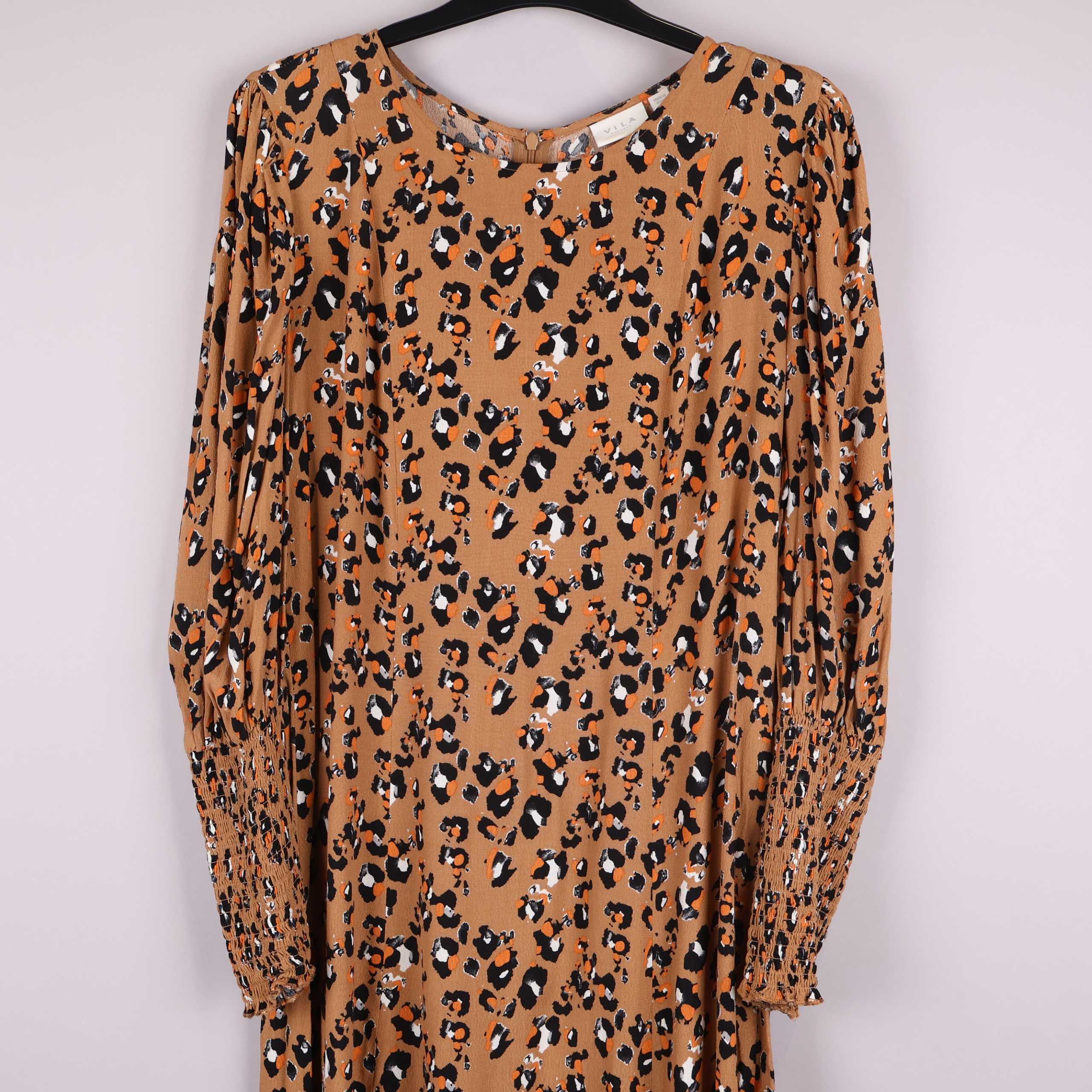 Elegant långklänning med ett modernt leopardmönster på en klassisk beige bas. Den har långa ärmar med voluminöst plissering och en fin dragkedja i ryggen.