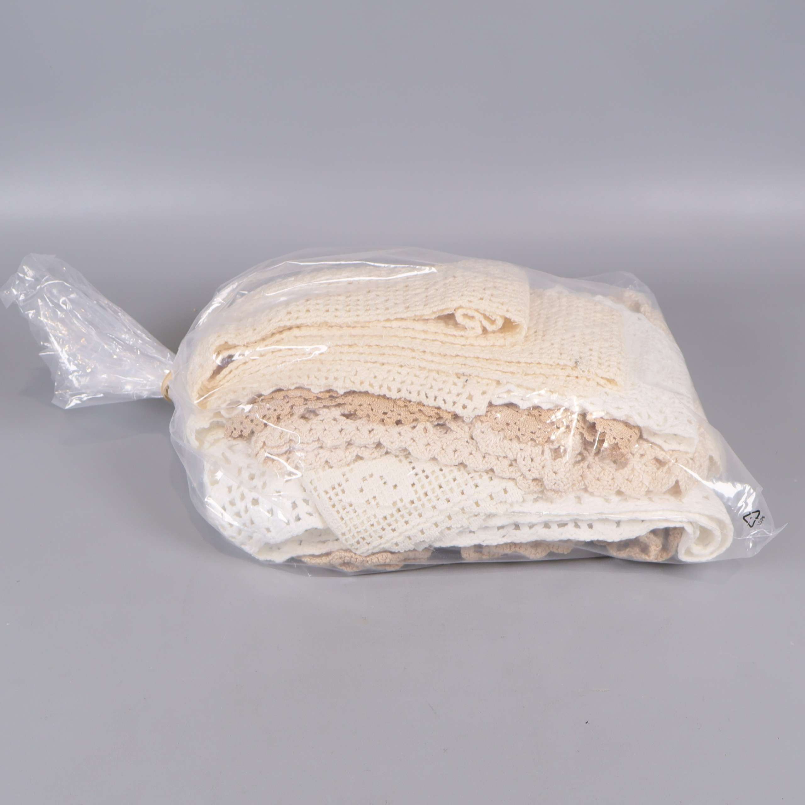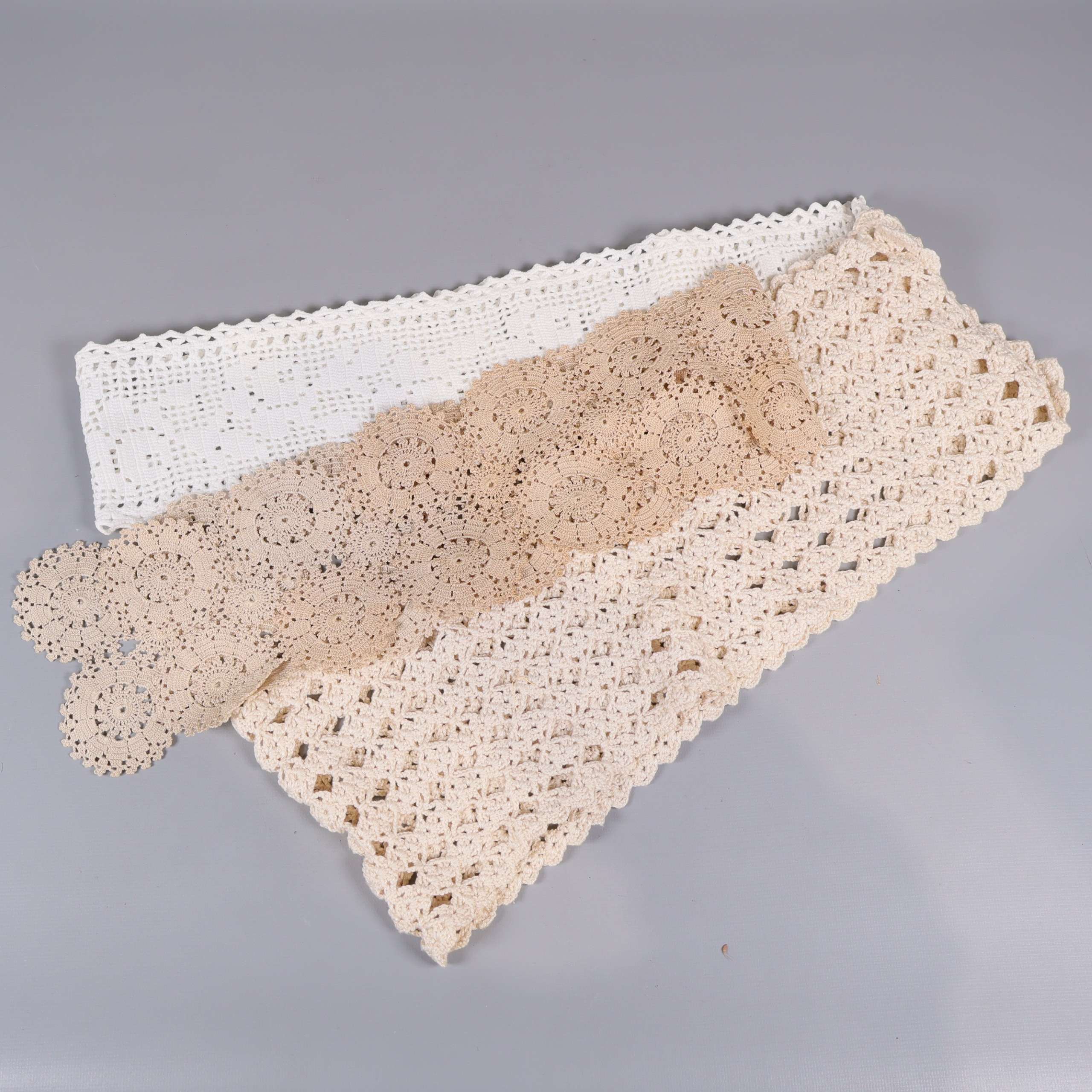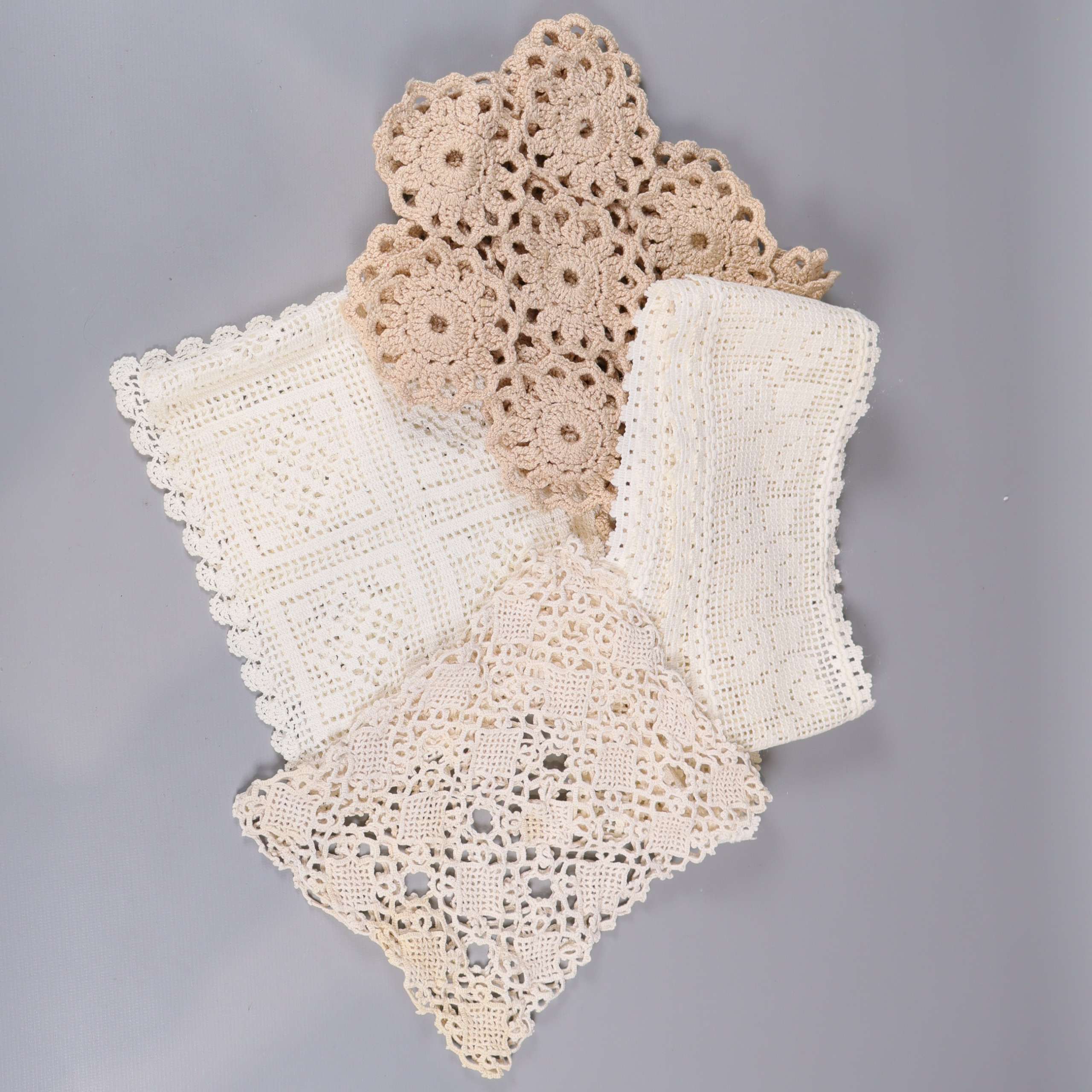 Ett set med mixade virkade spetsar och dukar i mjuka beige och gräddvita toner. Olika mönster och former ger en klassisk och dekorativ känsla. Perfekt för dig som gillar en vintage vibe i hemmet. Spetsarna är noggrant arbetade med fina detaljer som ger en hantverksmässig look.