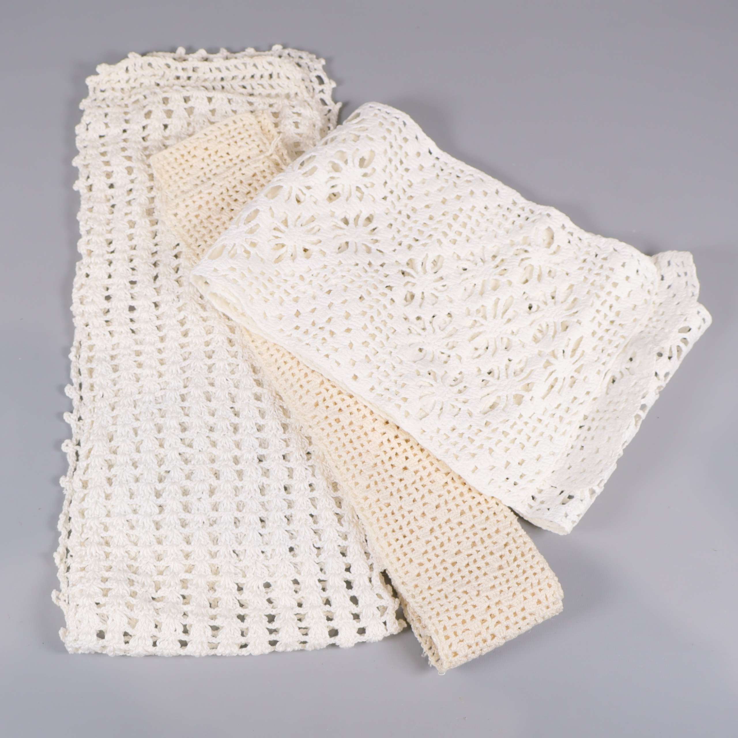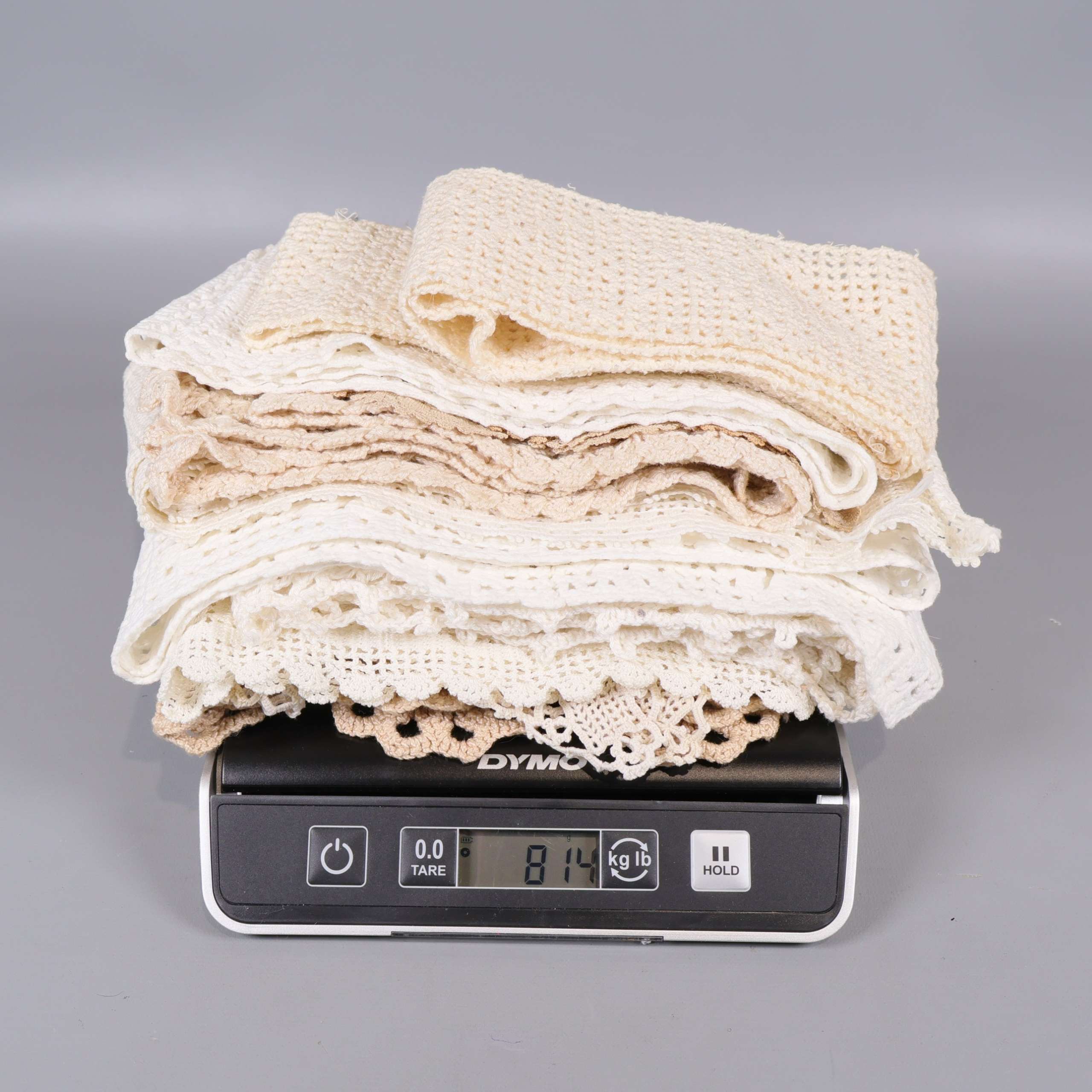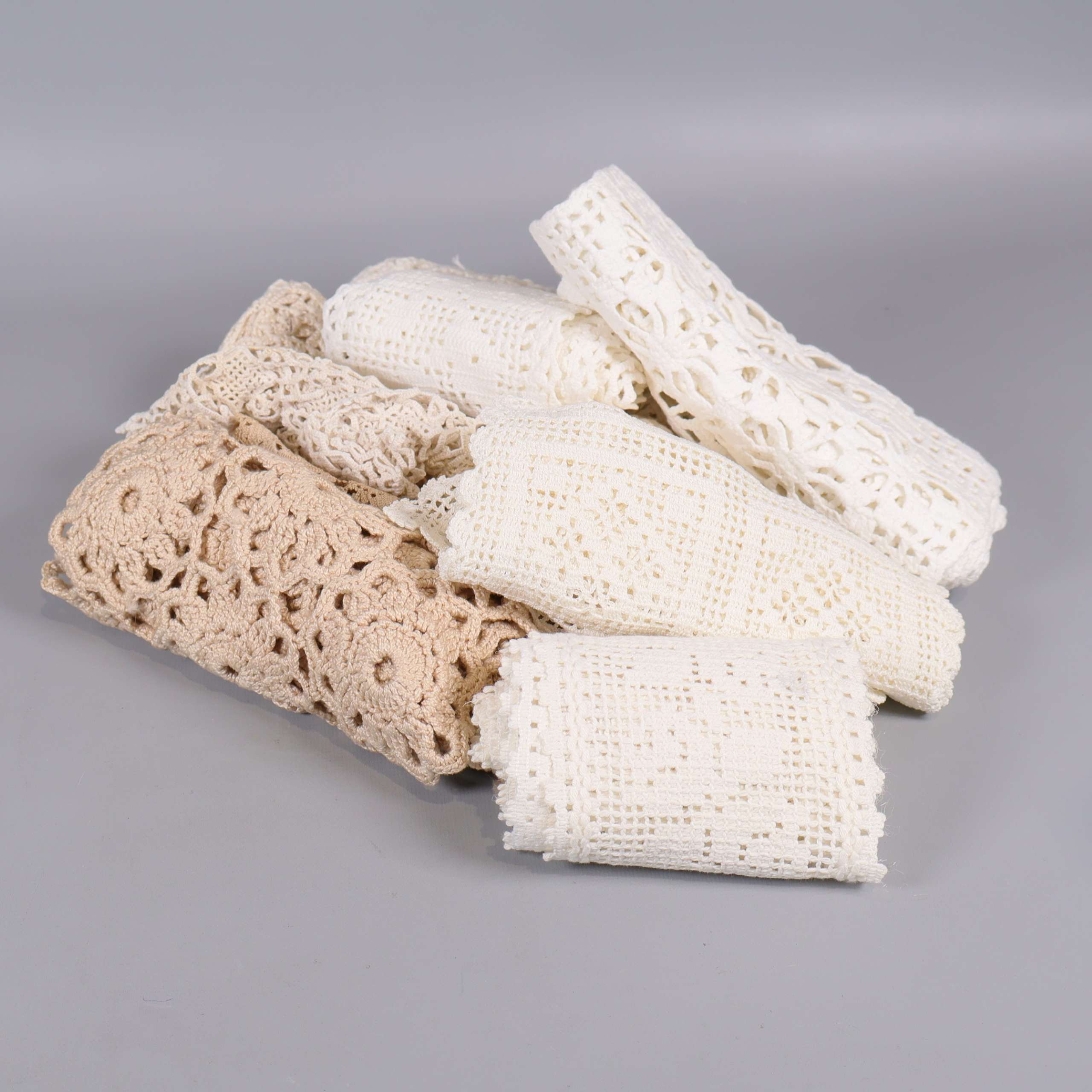Ett set med mixade virkade spetsar och dukar i mjuka beige och gräddvita toner. Olika mönster och former ger en klassisk och dekorativ känsla. Perfekt för dig som gillar en vintage vibe i hemmet. Spetsarna är noggrant arbetade med fina detaljer som ger en hantverksmässig look.
