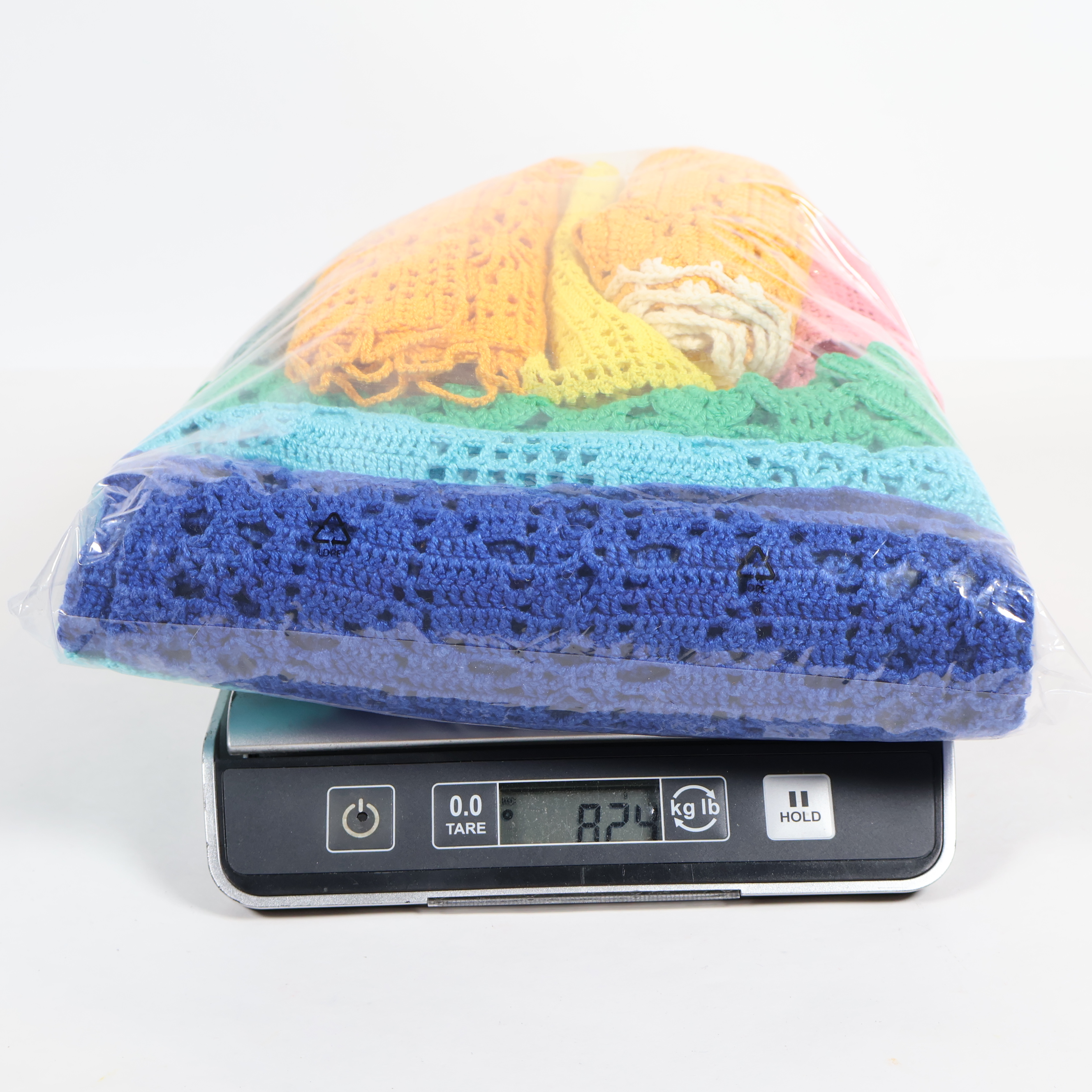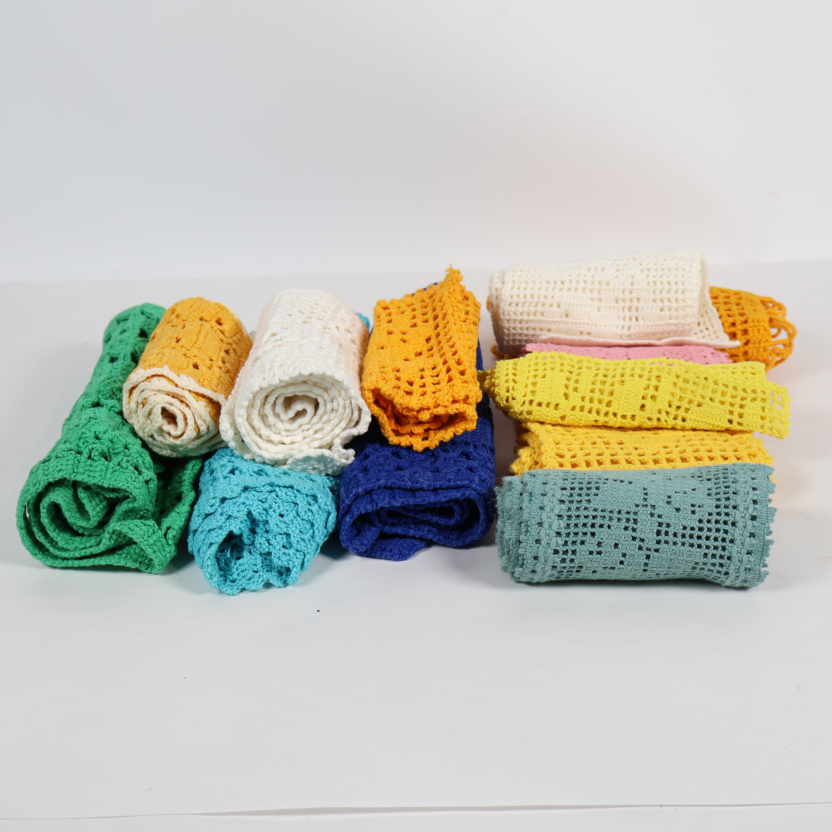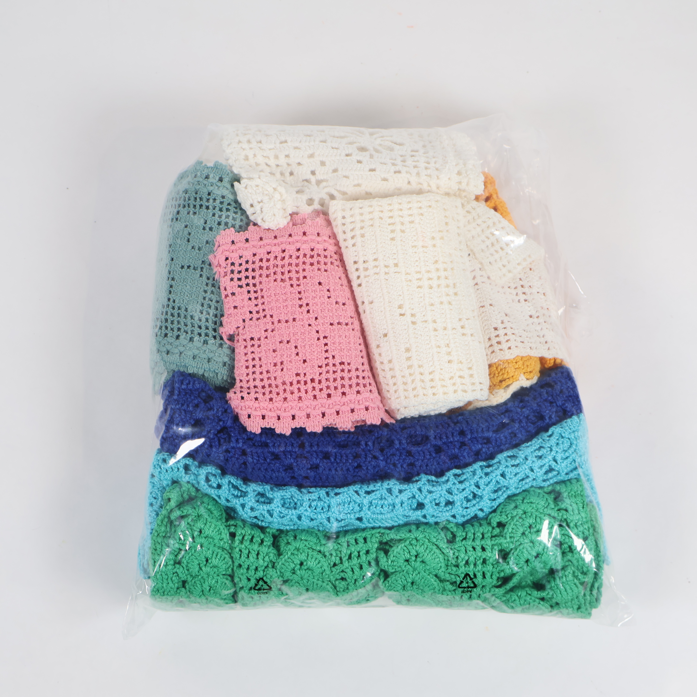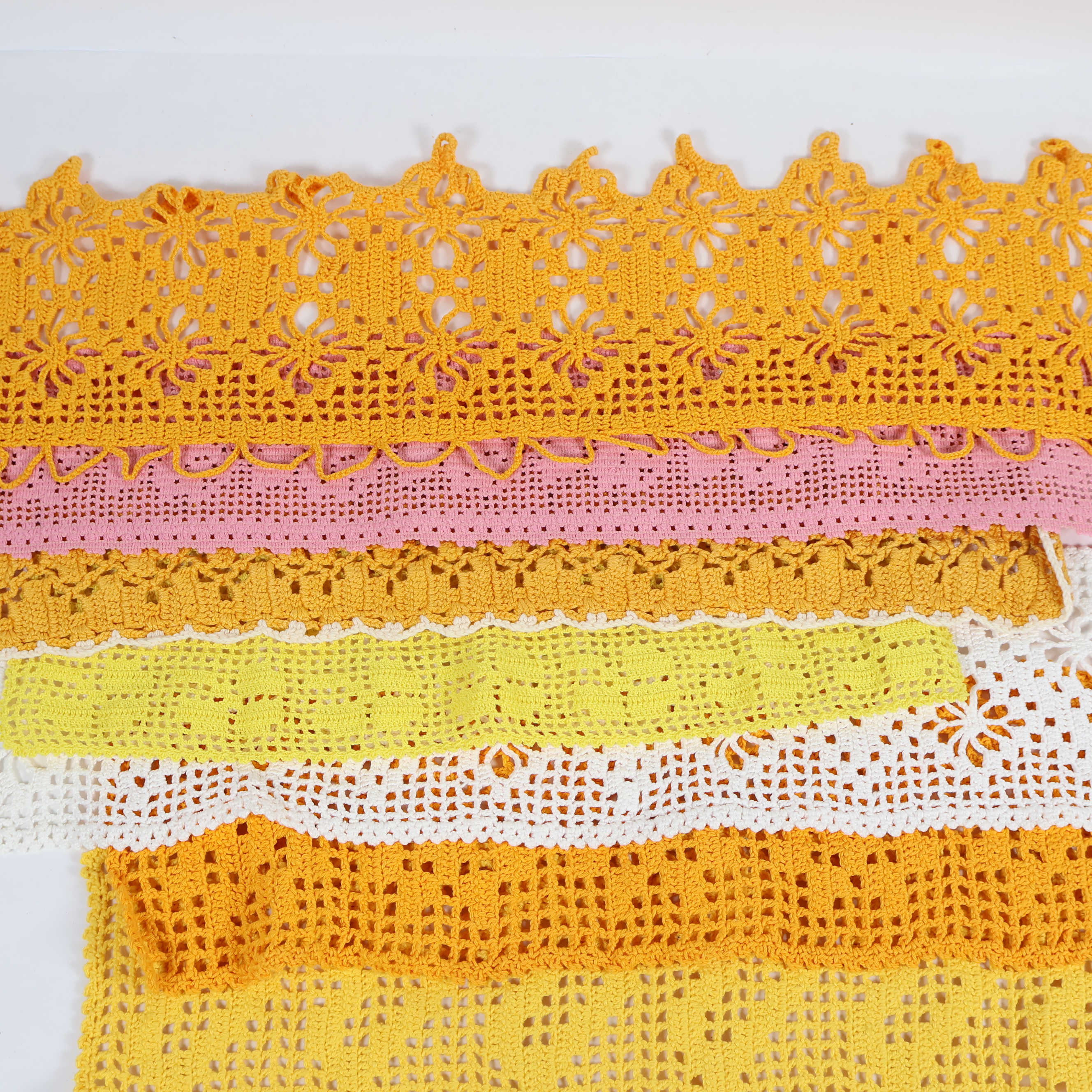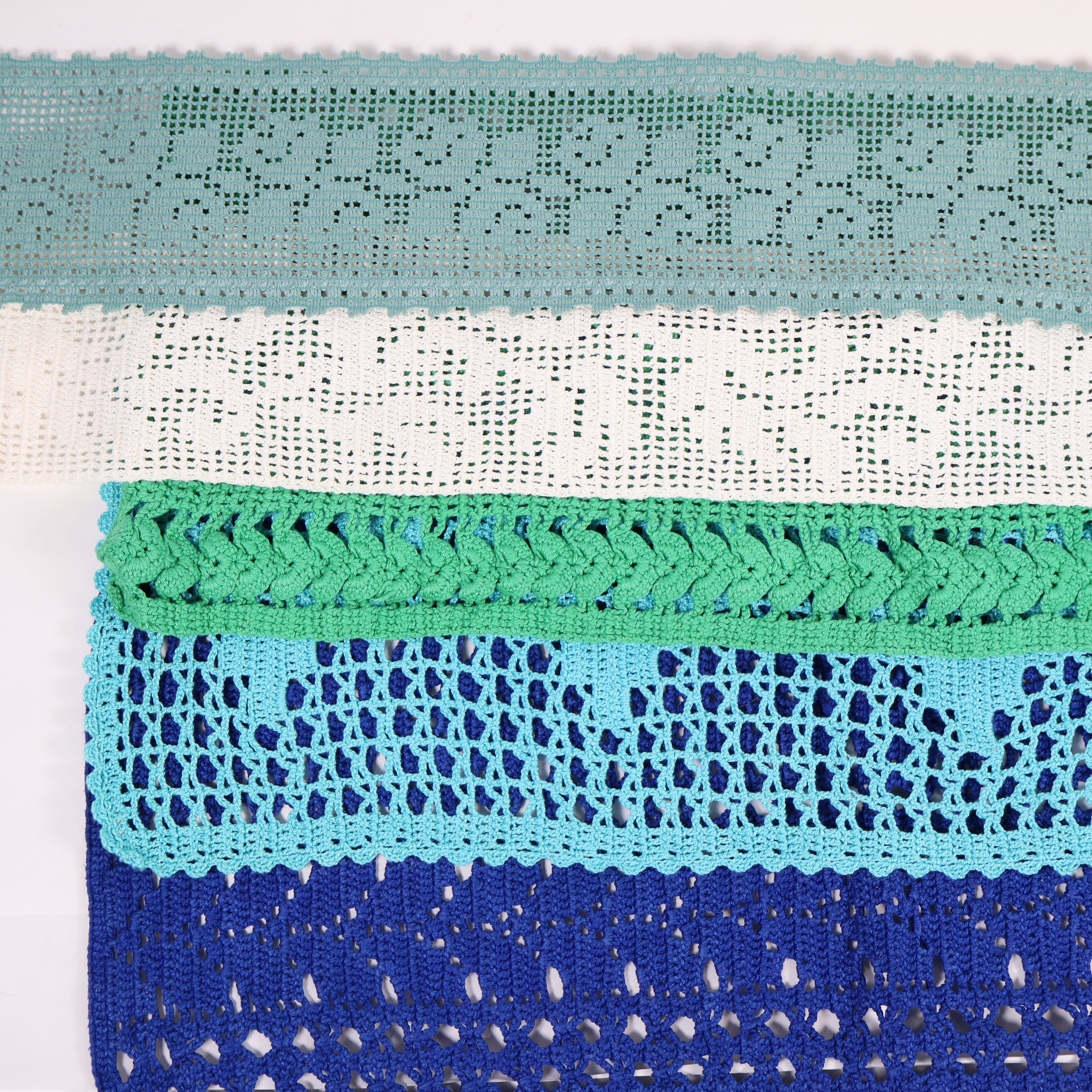 Ett paket med flera virkade spetsar i olika färger och mönster. Spetsarna är noggrant virkade och passar perfekt för dig som gillar handarbete, pyssel eller vill sätta egen touch på inredning och textilprojekt. Här hittar du en färgglad blandning av blått, grönt, gult, rosa och naturvitt – varje remsa har sitt eget unika uttryck och charm. Övrigt: ca 824 gr