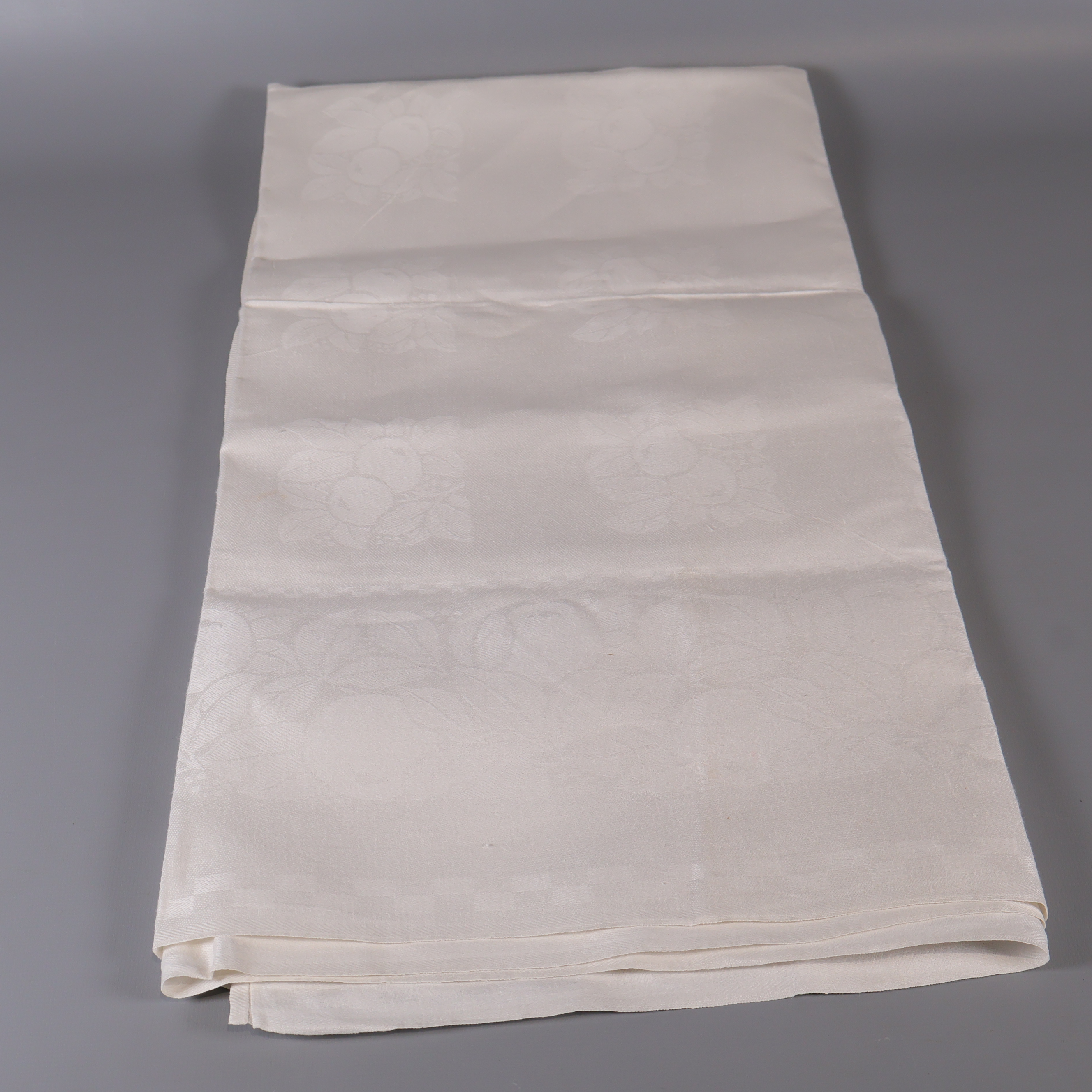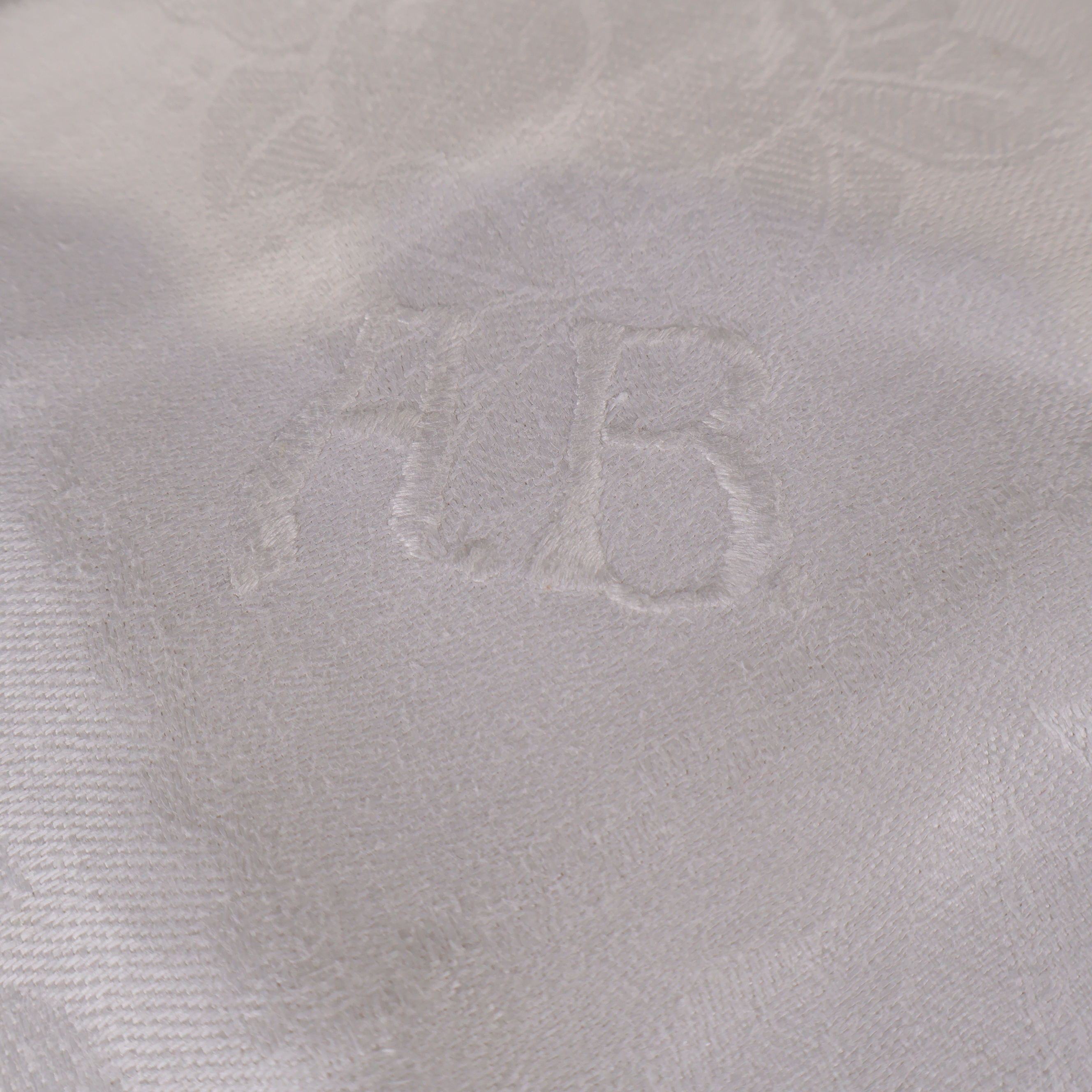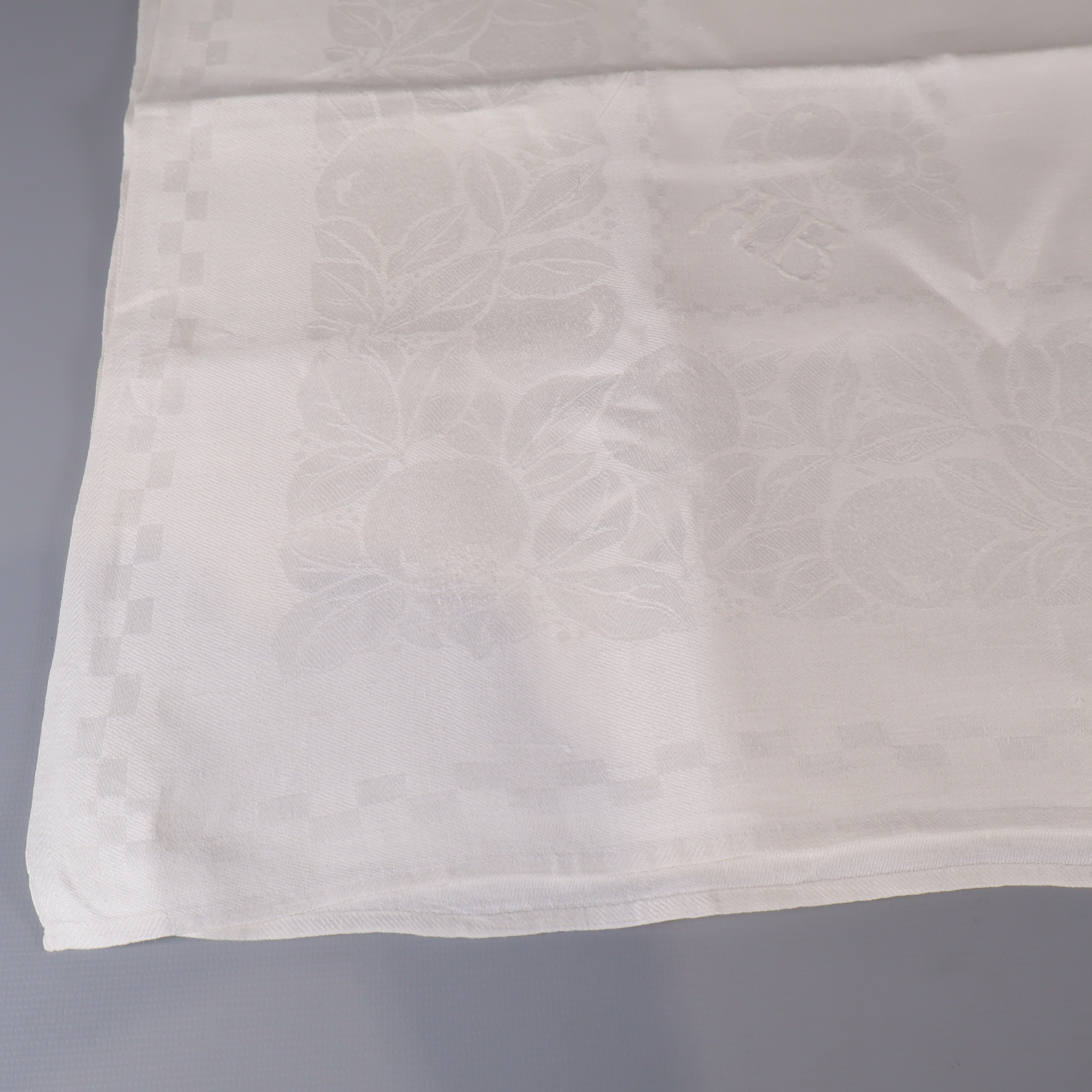En klassisk vit duk med subtilt invävt blommönster och diskreta initialer. Duken utstrålar en tidlös, elegant känsla som passar lika bra till vardag som till fest. Mjuk textil och lätt glans i tyget ger rummet en extra touch av stil.
