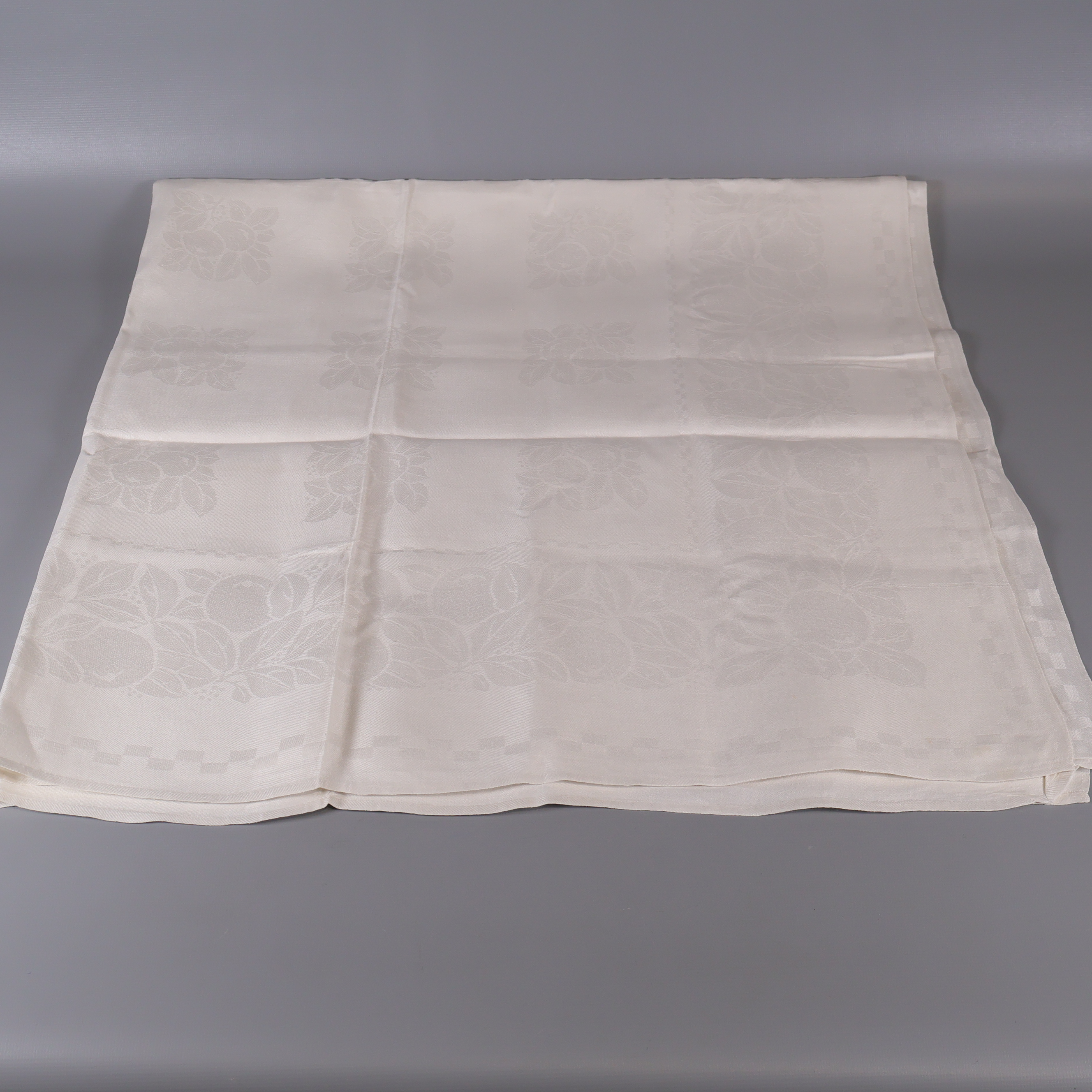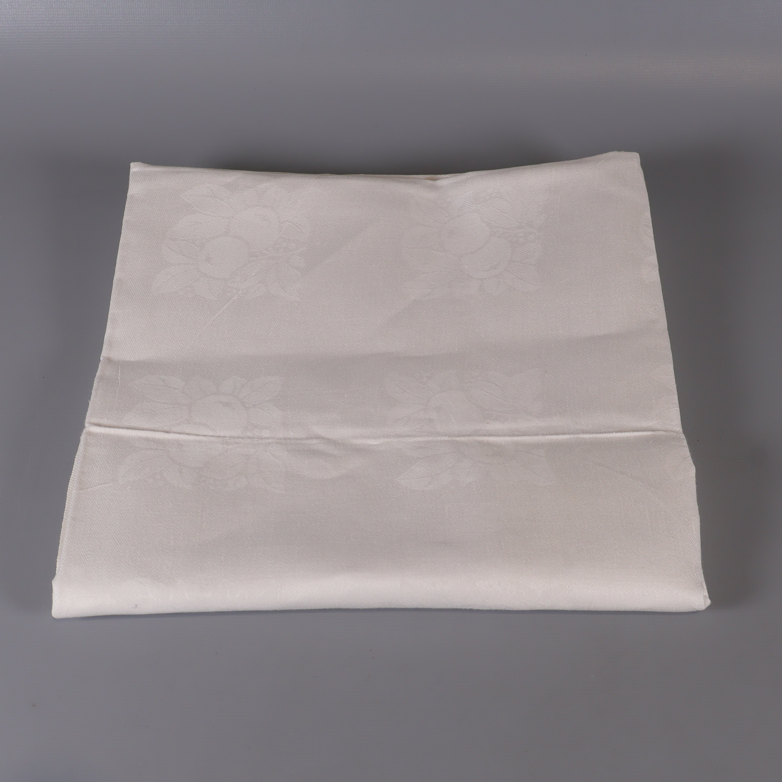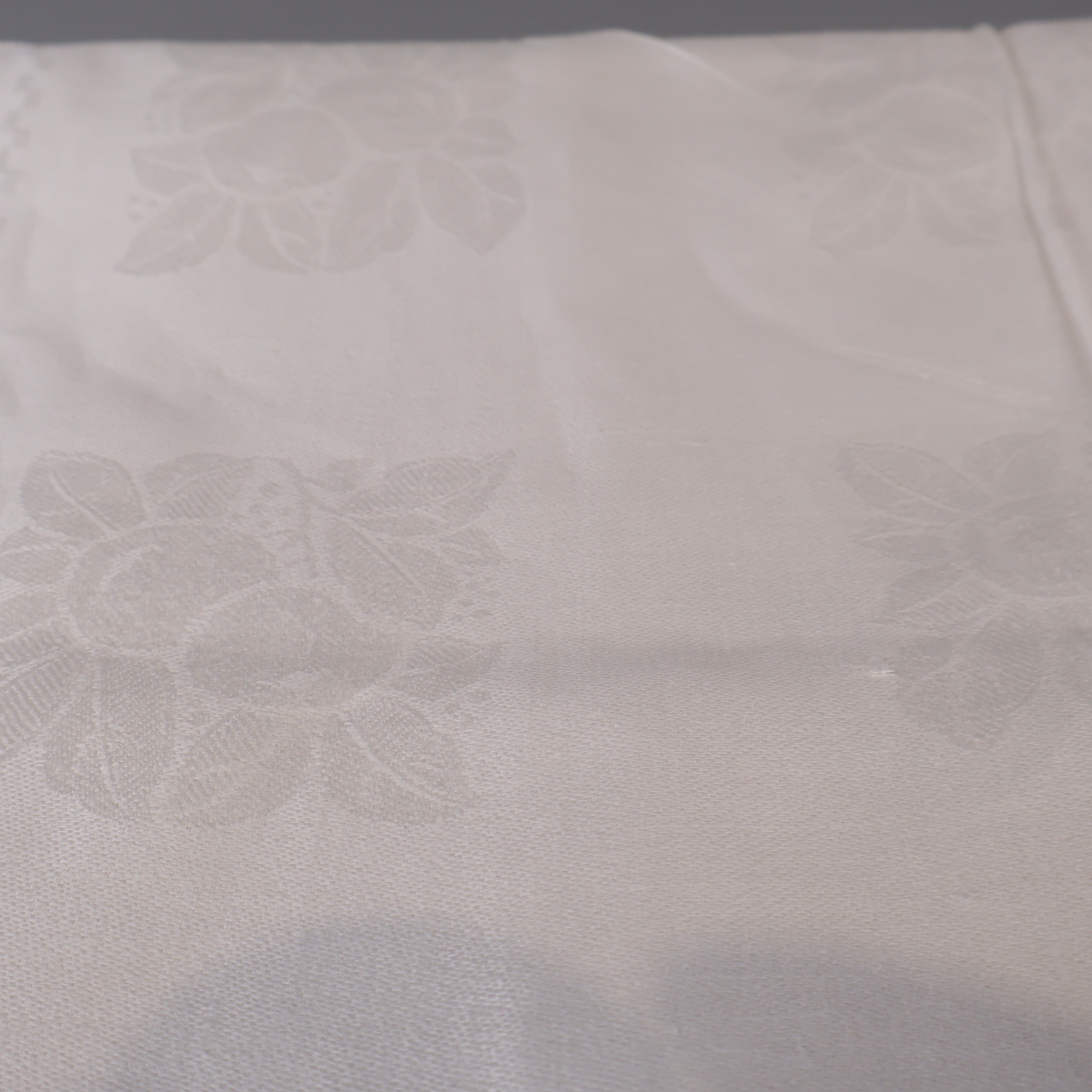 En klassisk vit duk med subtilt invävt blommönster och diskreta initialer. Duken utstrålar en tidlös, elegant känsla som passar lika bra till vardag som till fest. Mjuk textil och lätt glans i tyget ger rummet en extra touch av stil.