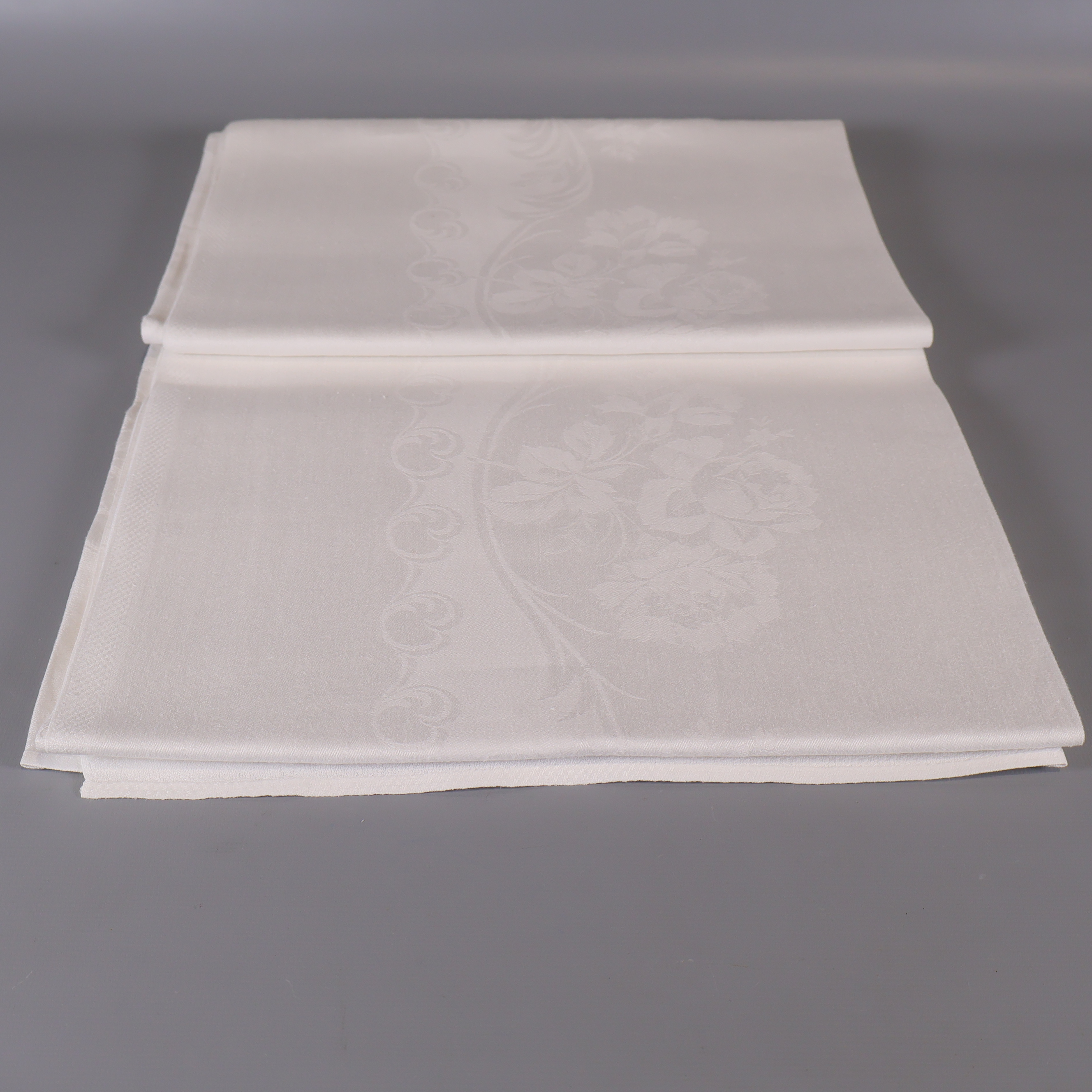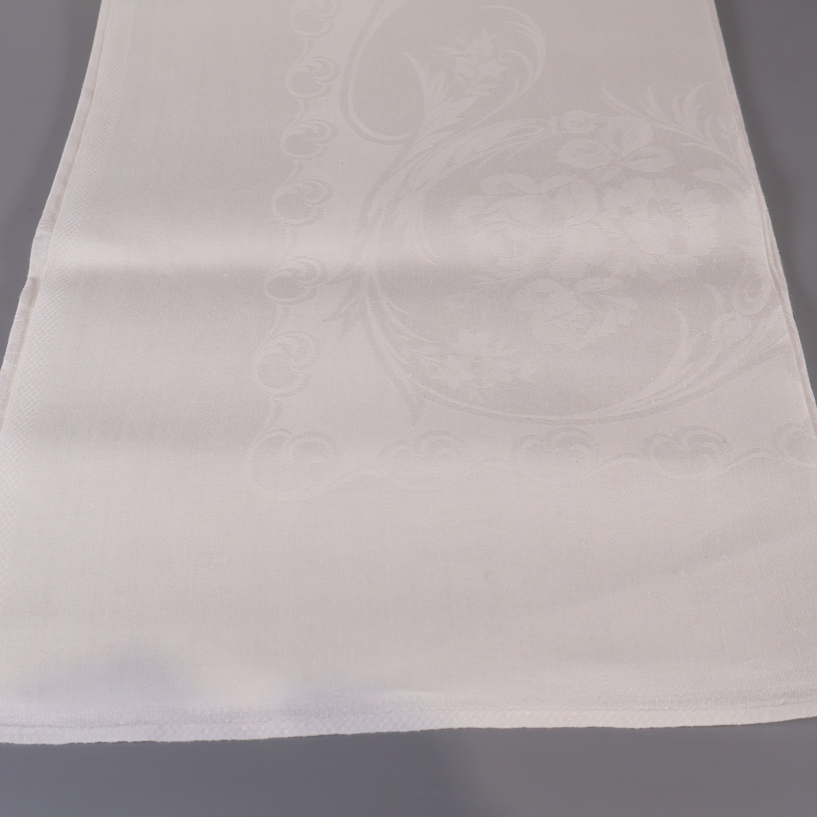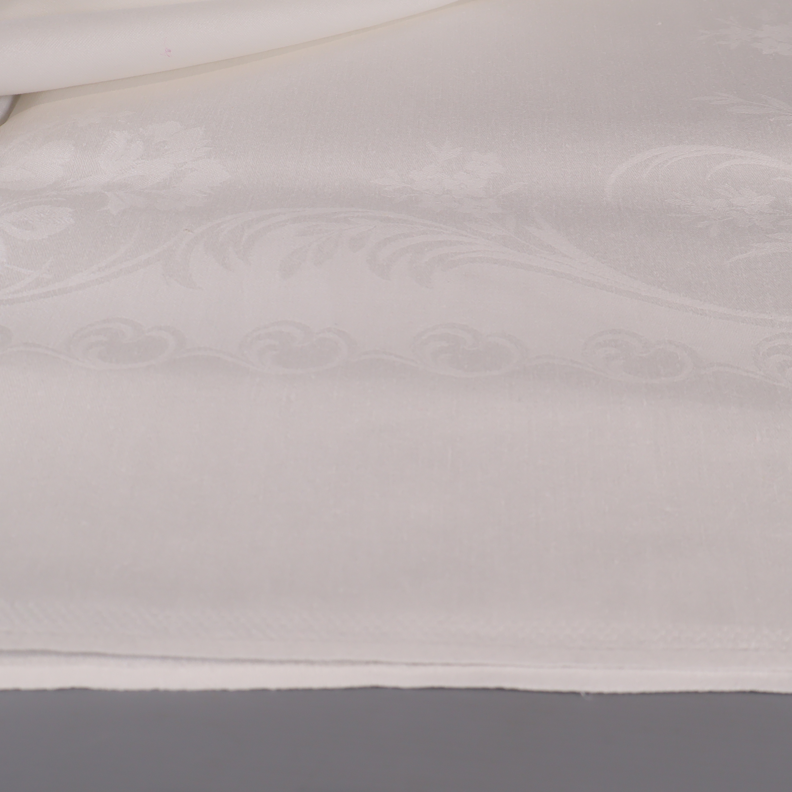 Elegant duk i vit nyans med subtilt invävt blommönster och fin struktur. Perfekt till både vardag och festliga tillfällen tack vare den tidlösa designen och enkla utstrålningen. Detaljerade kanter ger ett stilrent intryck, och duken känns lätt och följsam mot underlaget.