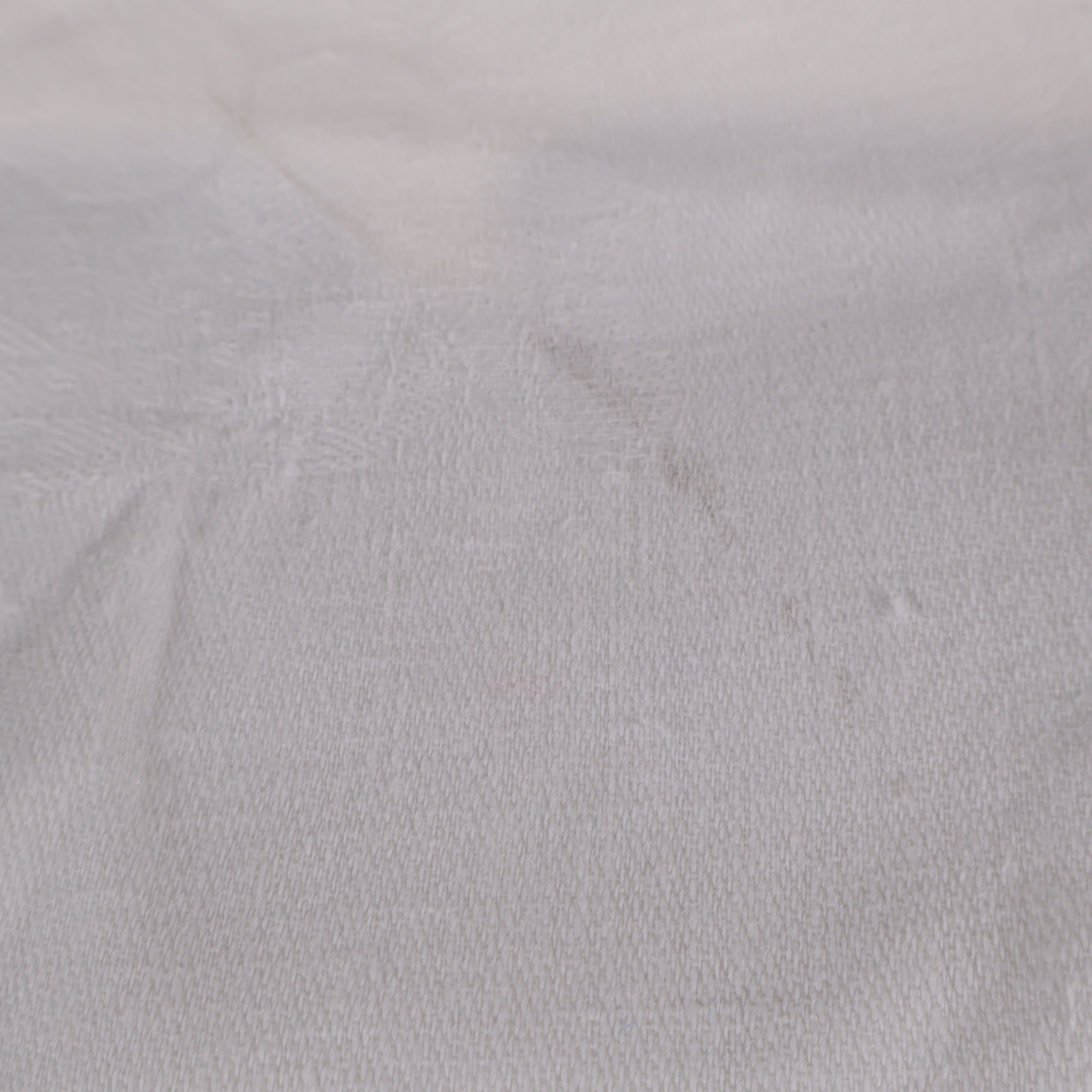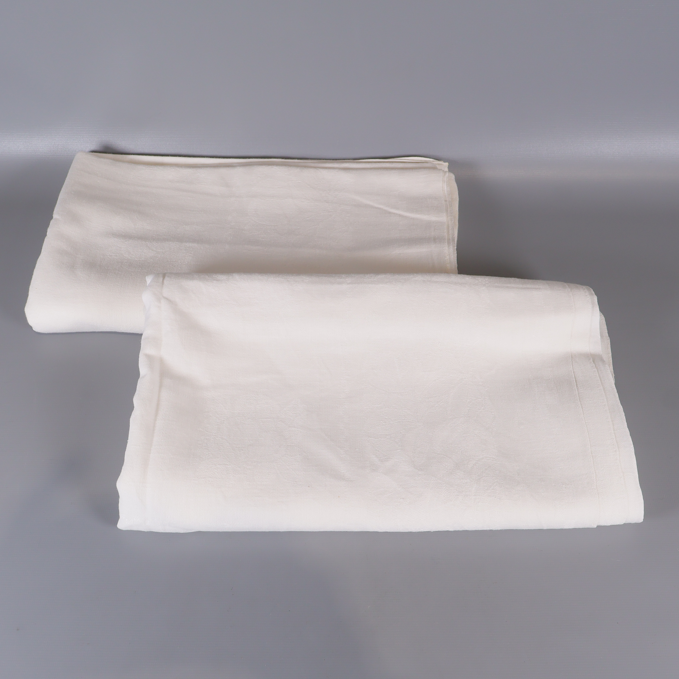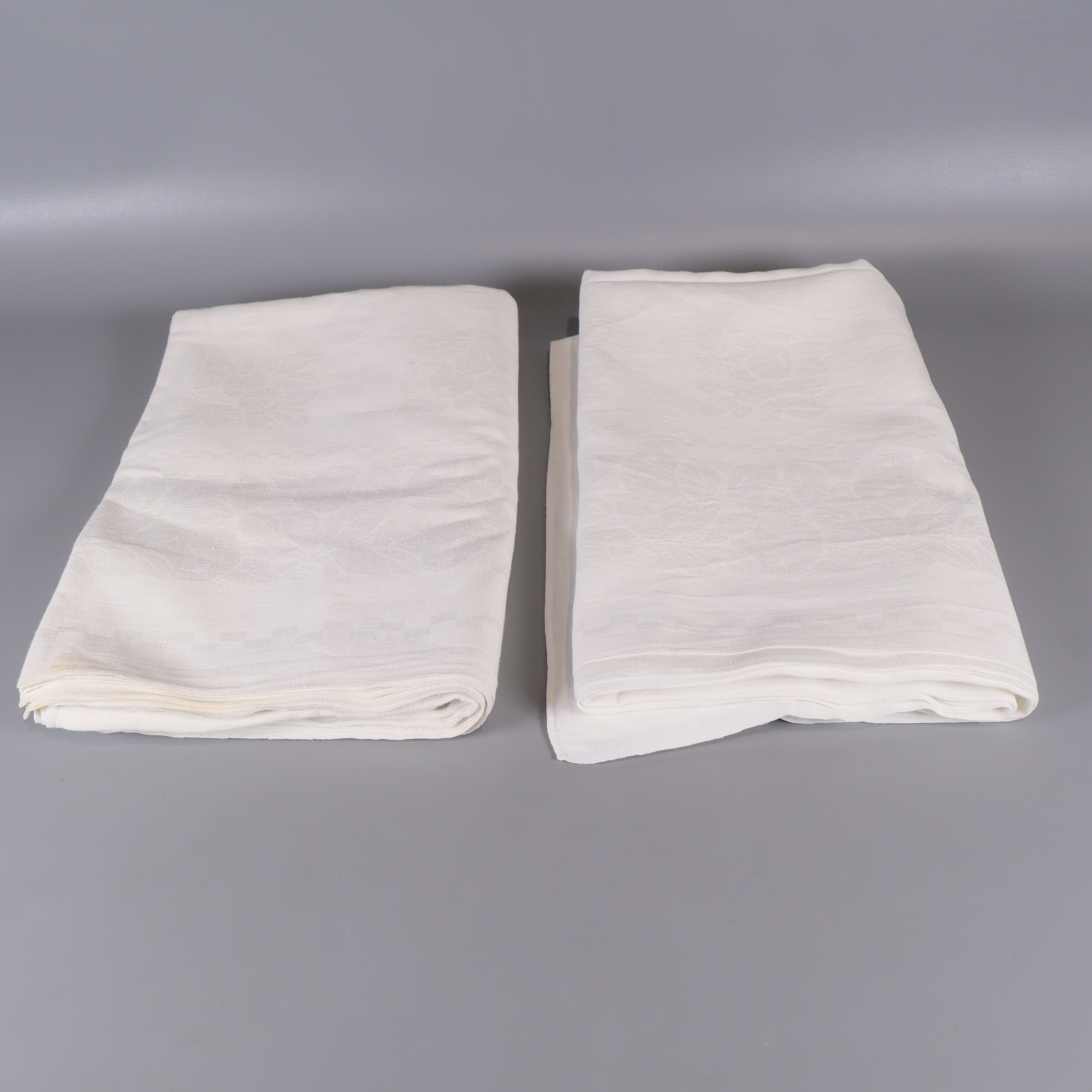 Två klassiska vita dukar med subtila växtmönster som ger en elegant känsla till dukningen. Tygytan är mjuk och följsam med en stilren finish. Ljusa fläckar och bruksspår finns, men helheltsintrycket är rent och tidlöst.