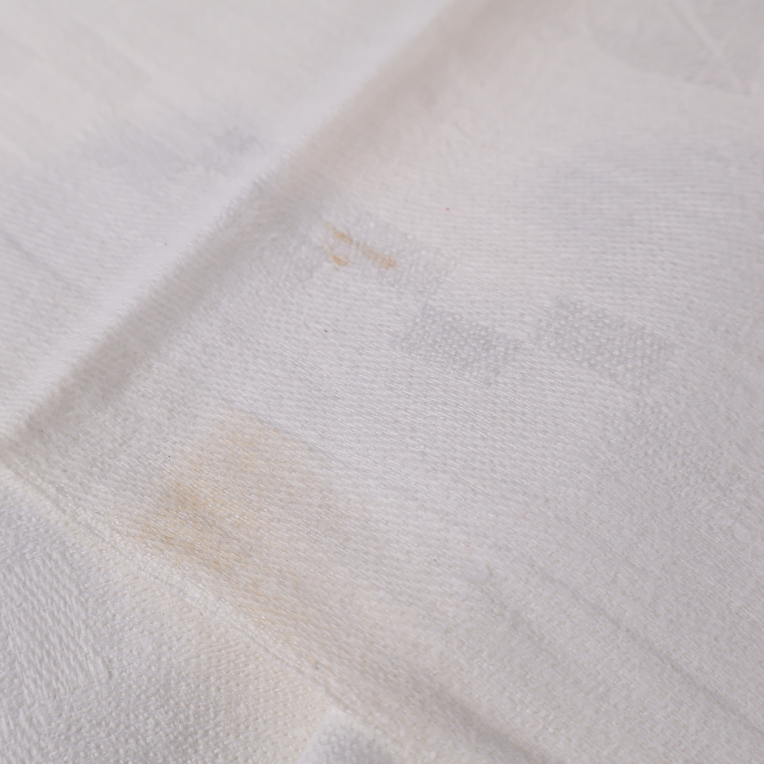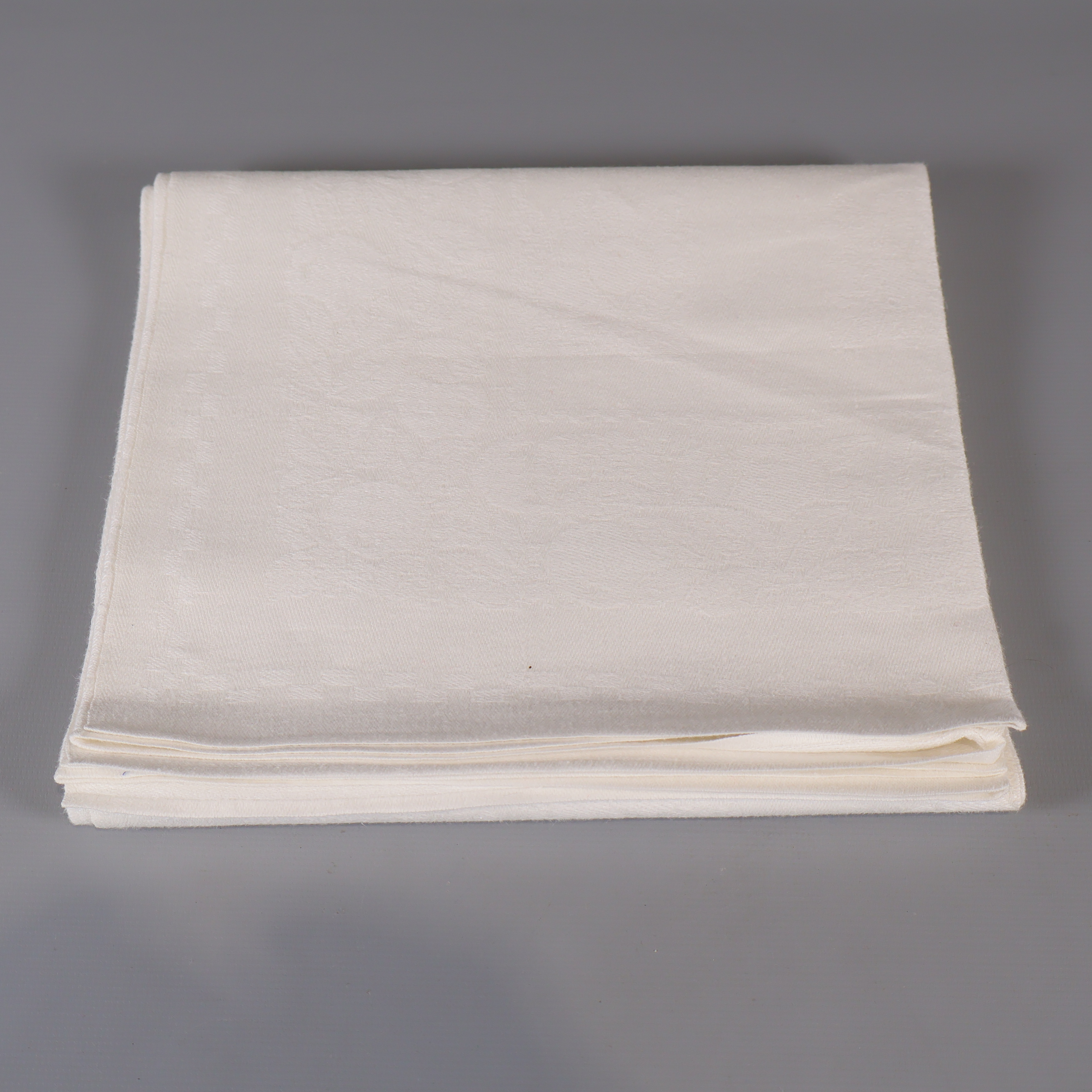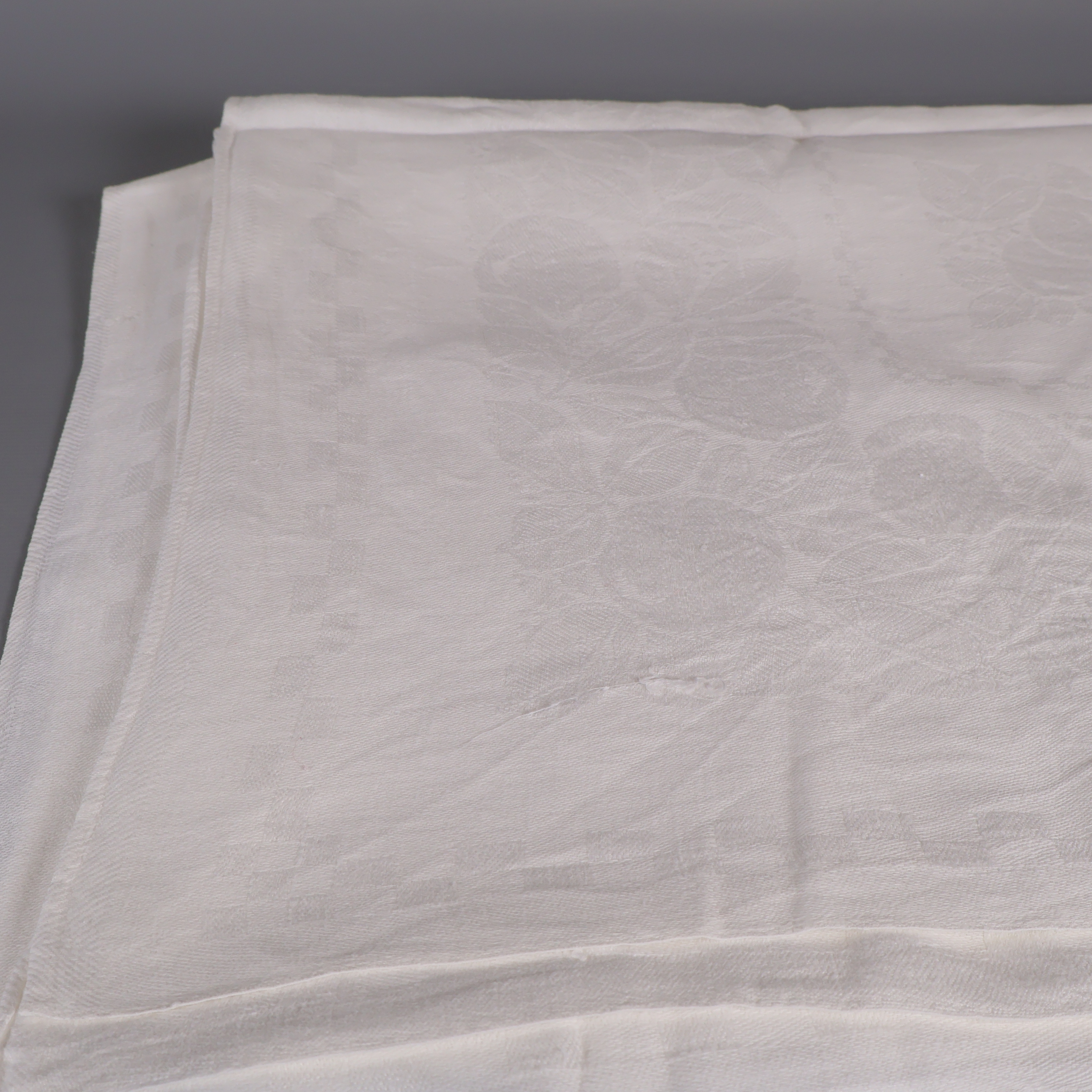 Två klassiska vita dukar med subtila växtmönster som ger en elegant känsla till dukningen. Tygytan är mjuk och följsam med en stilren finish. Ljusa fläckar och bruksspår finns, men helheltsintrycket är rent och tidlöst.