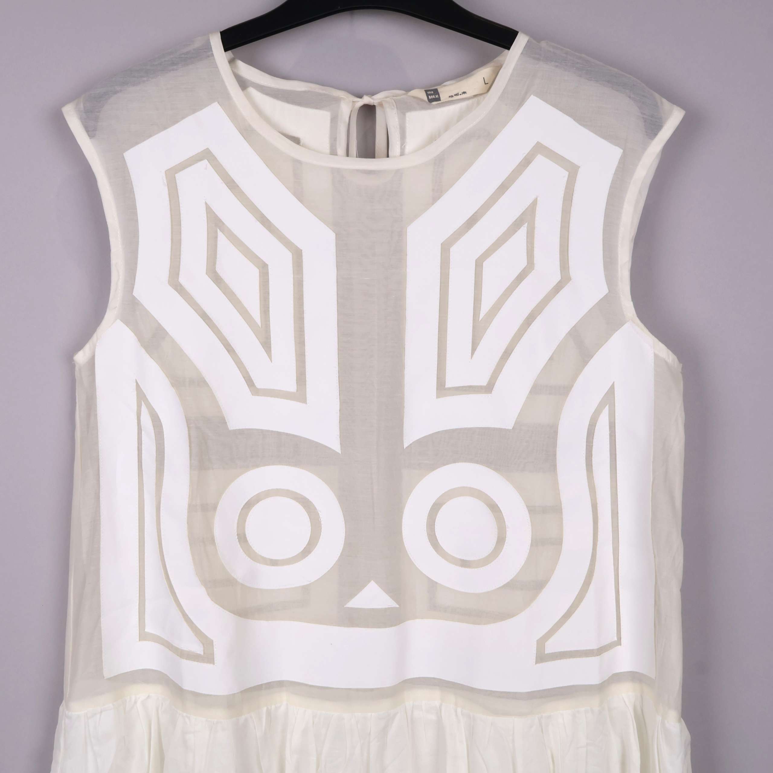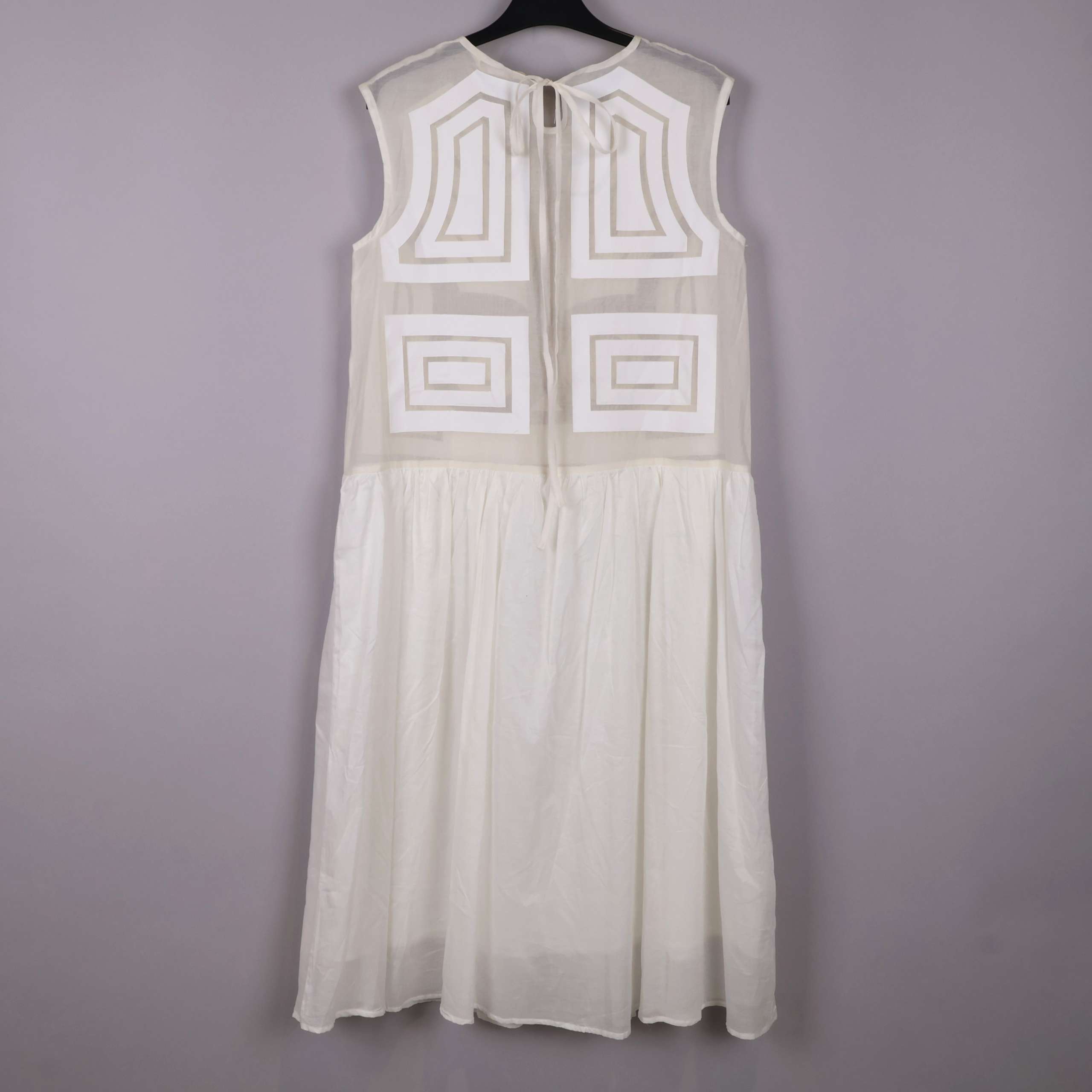 Elegant vit klänning med ett distinkt grafiskt mönster framtill och bak. Klänningen har en ärmlös design och ett luftigt fallande kjolparti som ger ett stilrent och modernt utseende. Passar utmärkt för både vardag och festliga tillfällen.