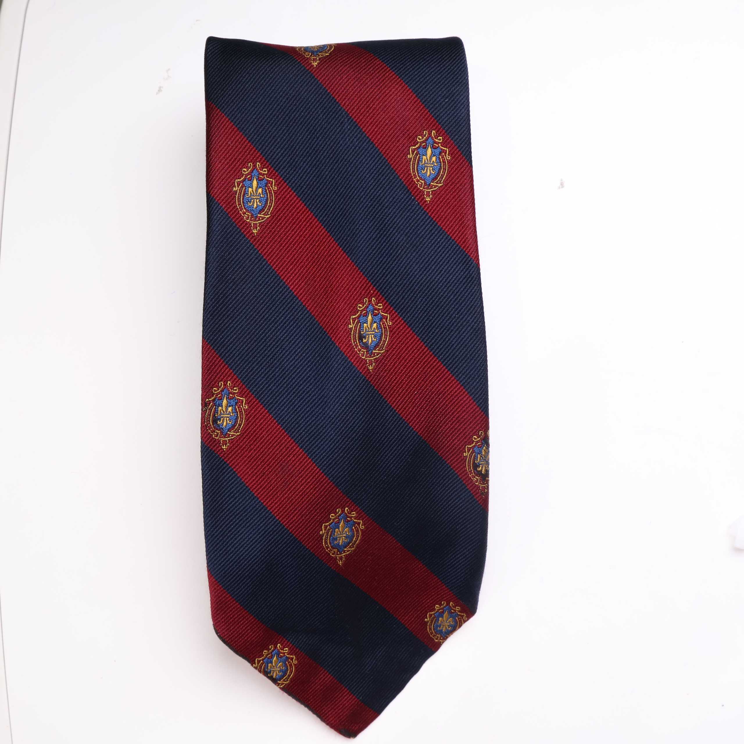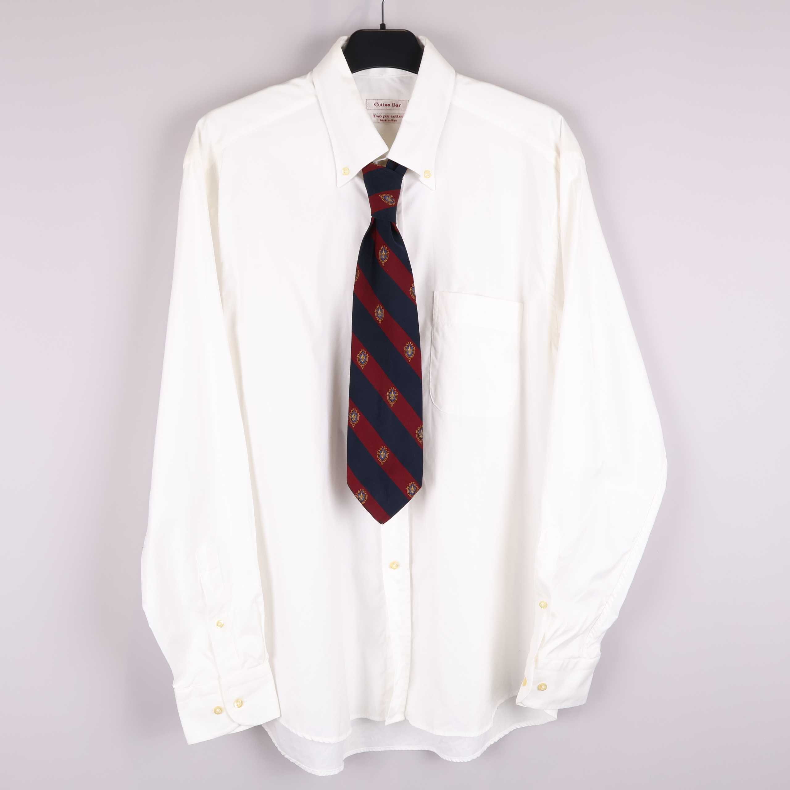Elegant vit skjorta med klassisk design och knappstängning framtill. Tillhörande slips i rött och blått med dekorativt mönster ger en sofistikerad touch. Skjortan har bröstficka och genomgående knappar i kontrasterande färg för en stilren look.