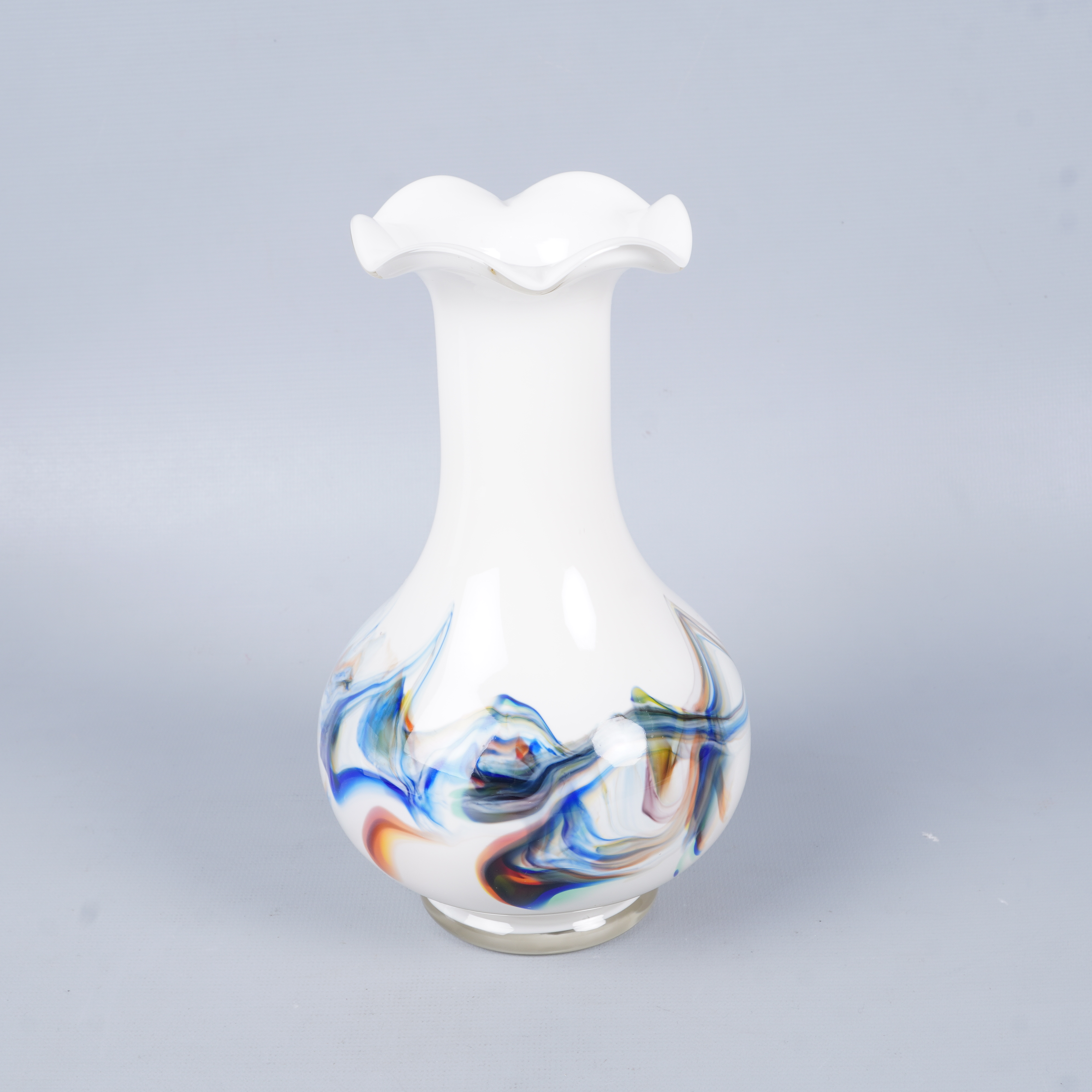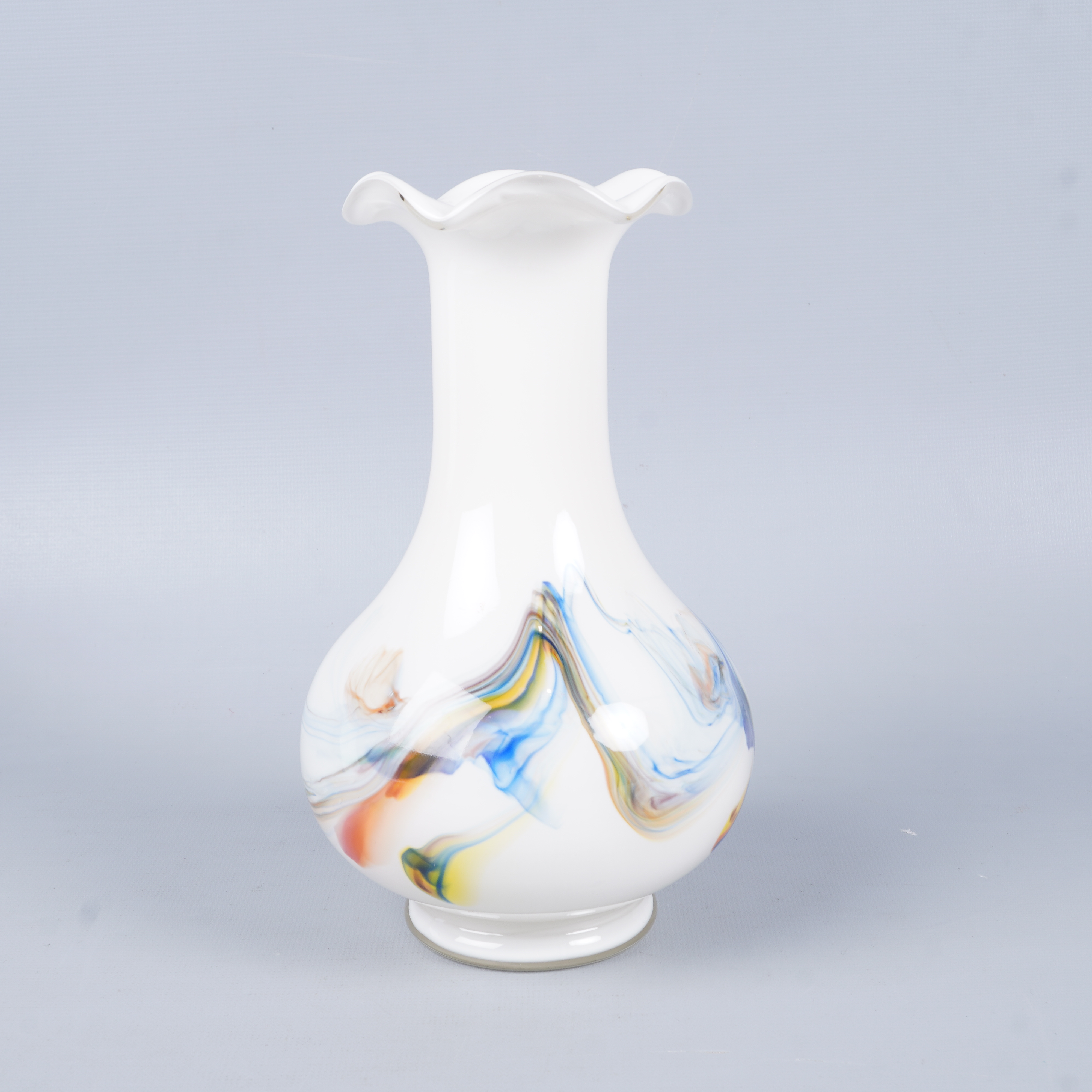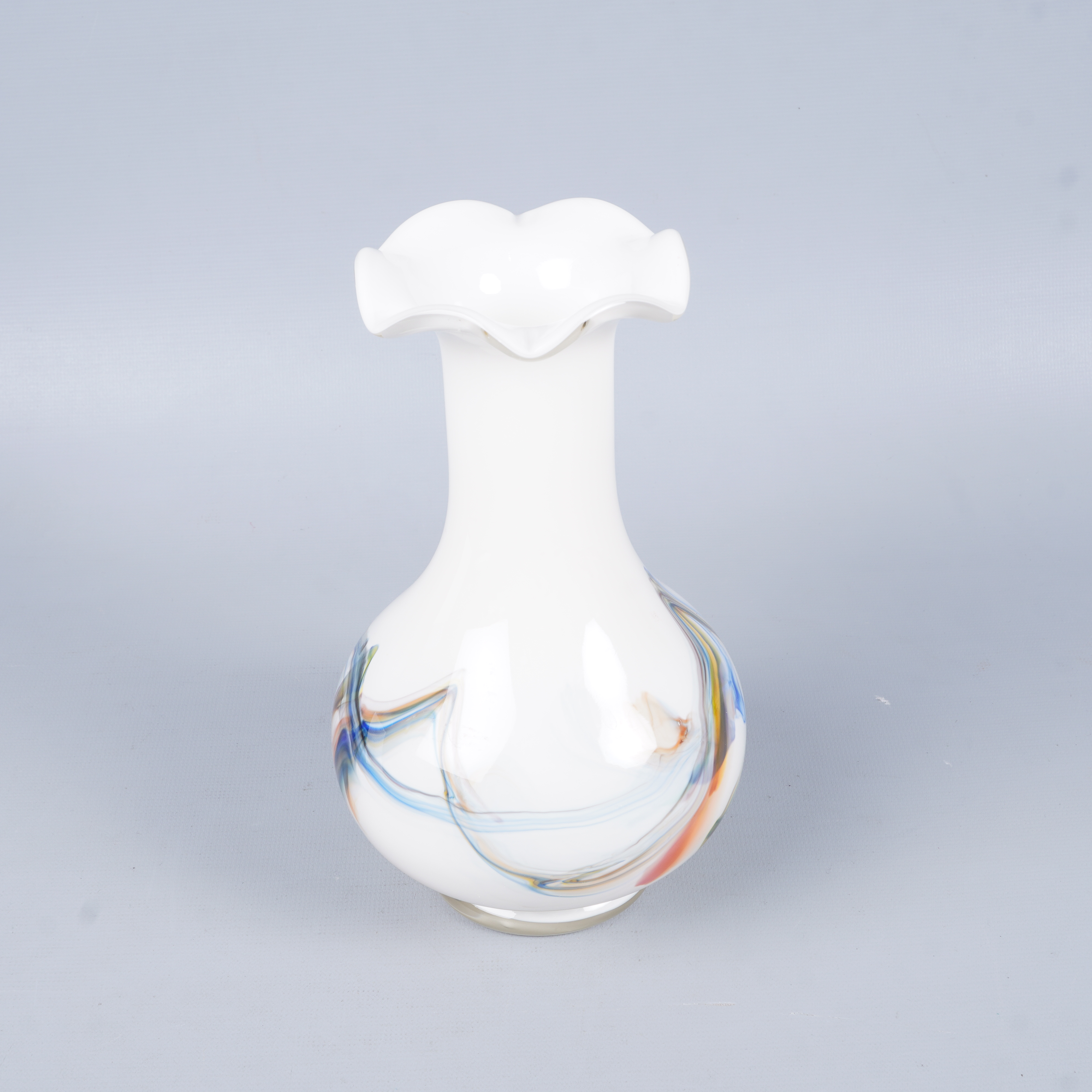 Vas i vitt glas med färgade inslag i blått, orange och grönt som ger ett levande och konstnärligt uttryck. Klassisk form med vågig öppning upptill och mjuka linjer som skapar en unik och kreativ känsla, perfekt till exempel som centerpiece.