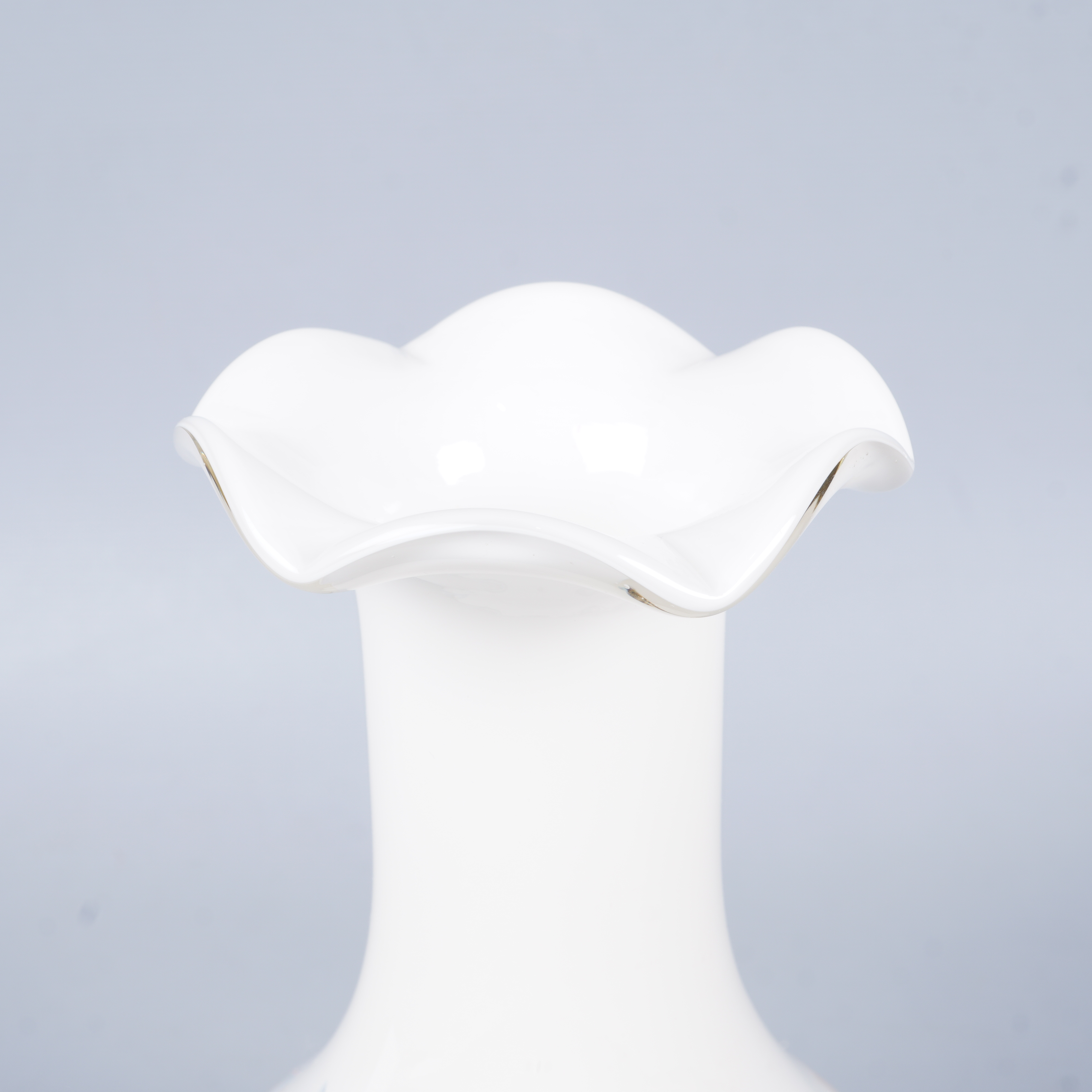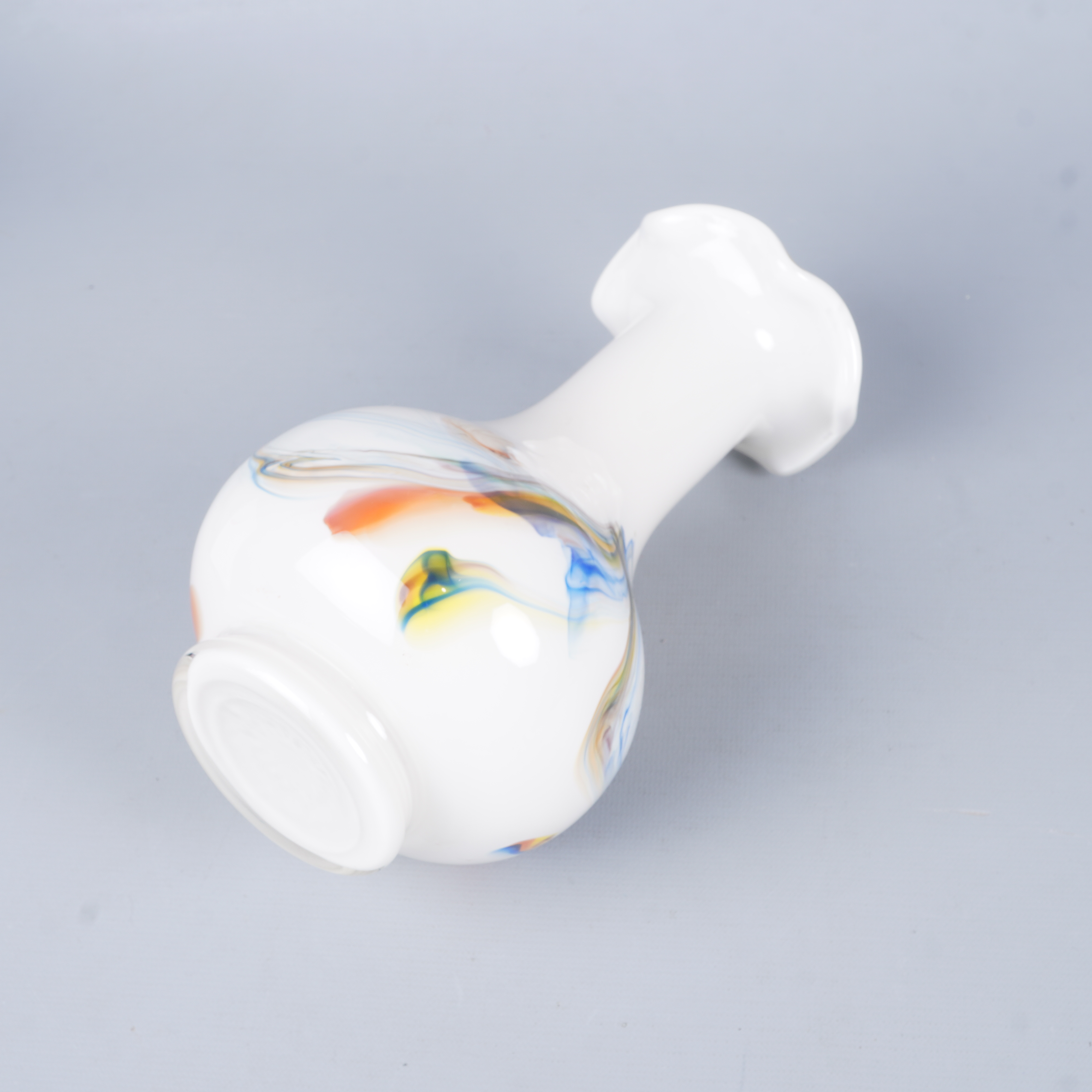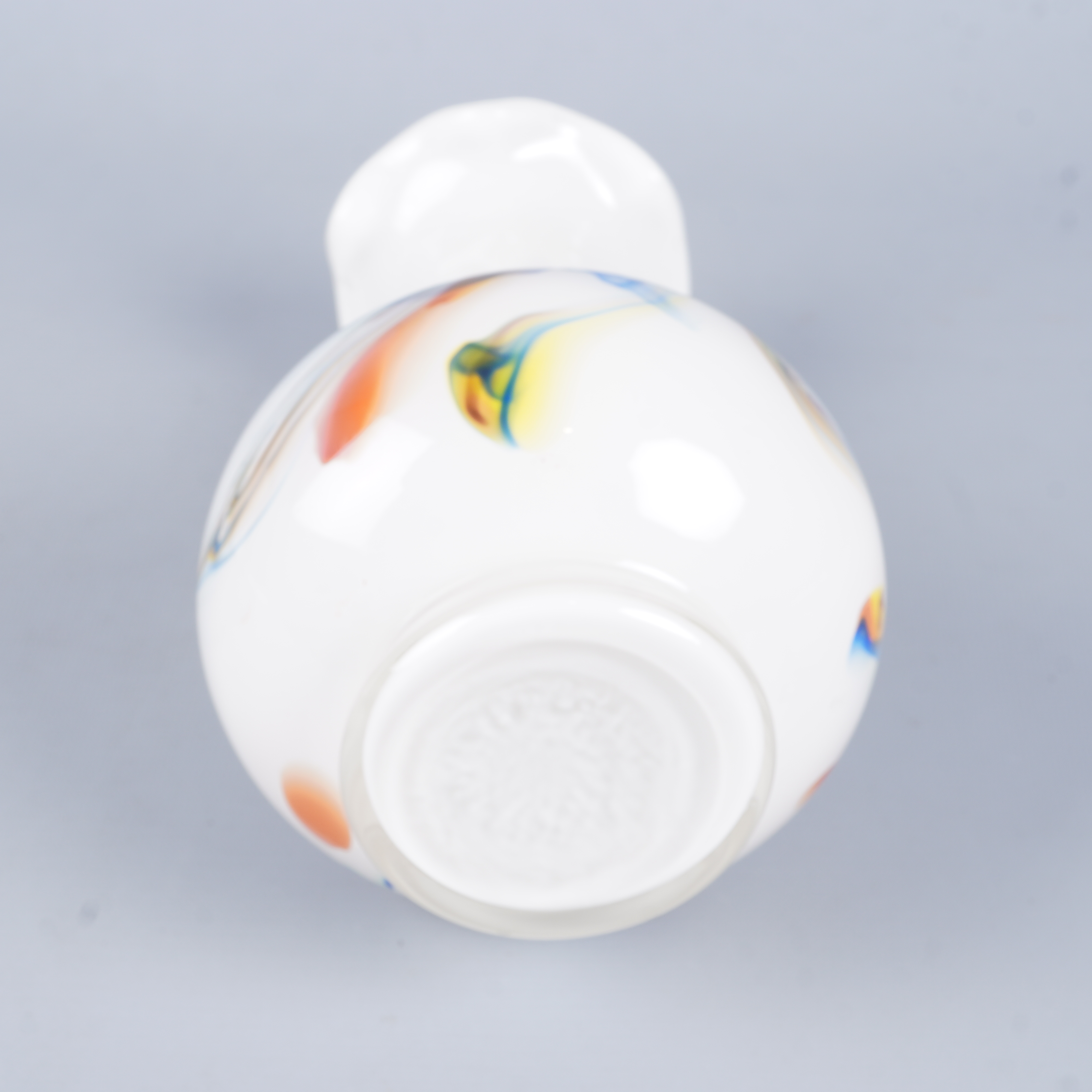 Vas i vitt glas med färgade inslag i blått, orange och grönt som ger ett levande och konstnärligt uttryck. Klassisk form med vågig öppning upptill och mjuka linjer som skapar en unik och kreativ känsla, perfekt till exempel som centerpiece.