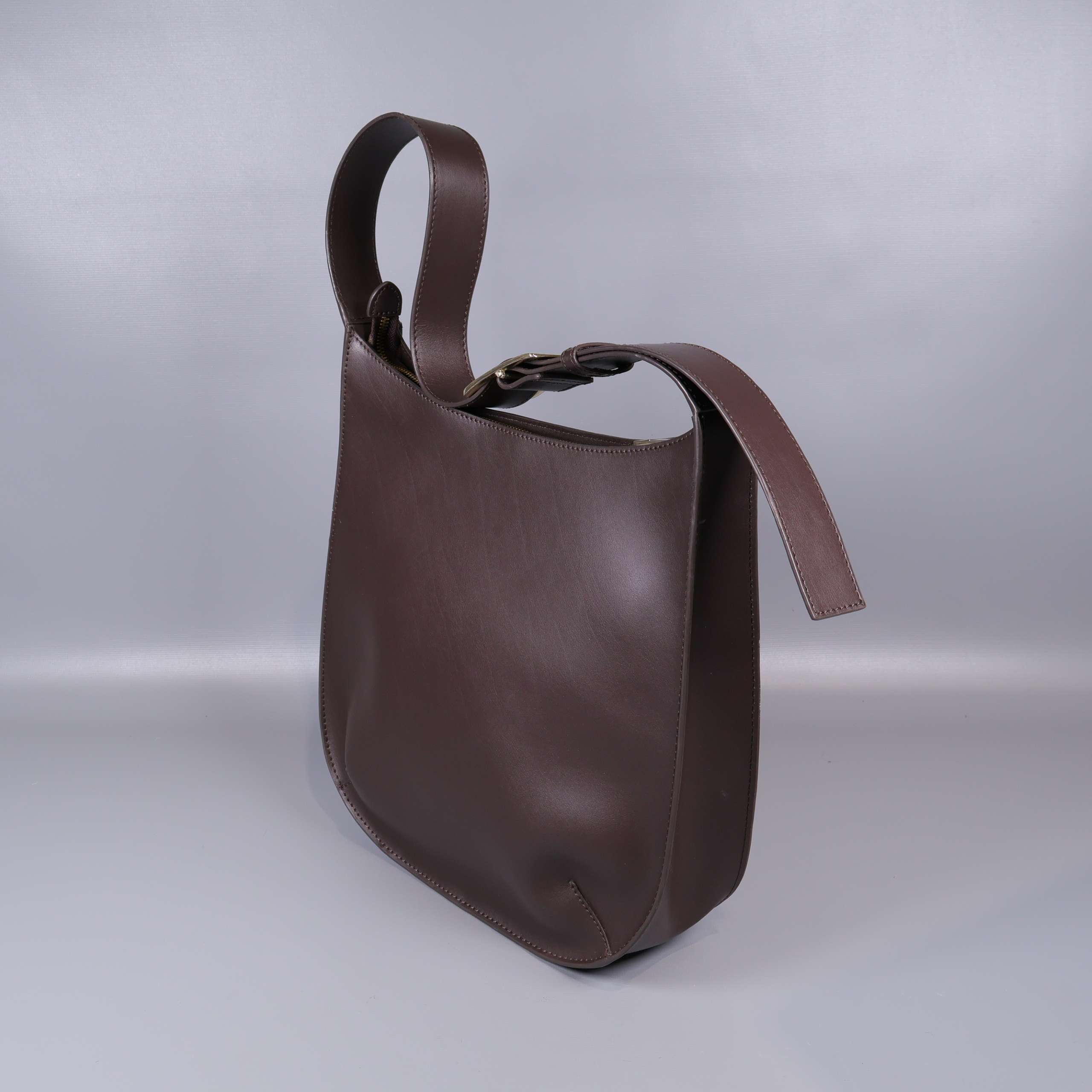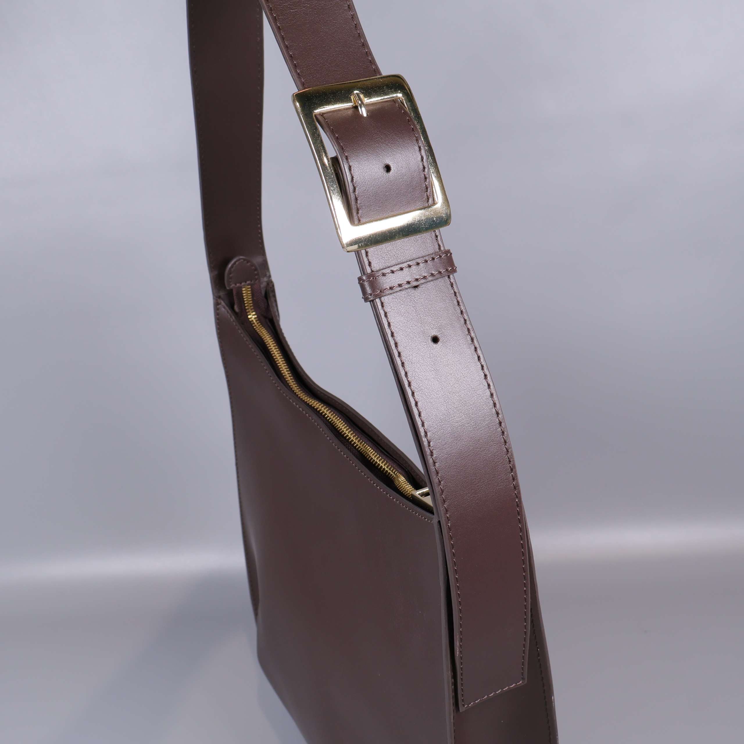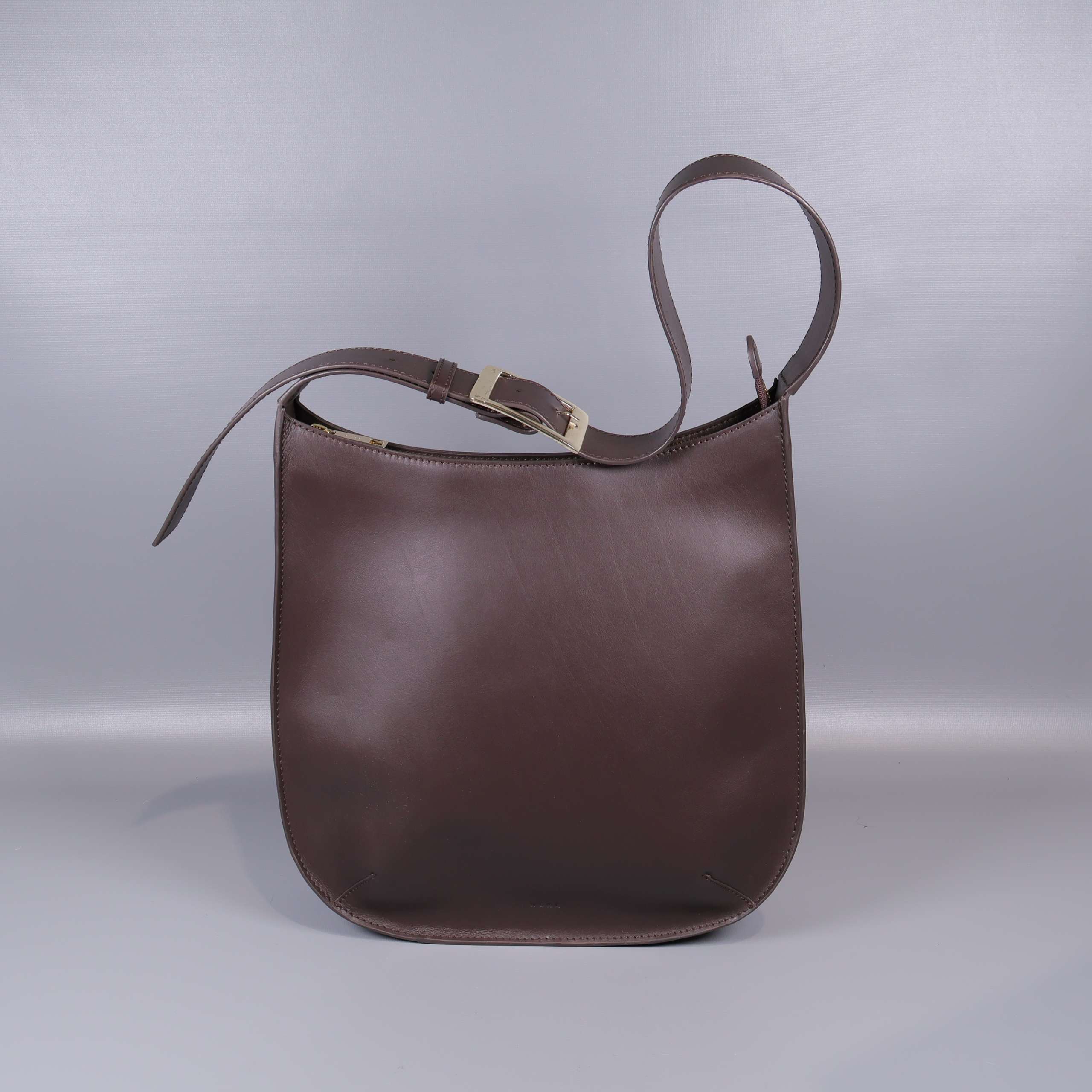 Stilren axelremsväska i slätt, brunt läder med justerbart axelband och dekorativt spänne i metall. Väskan har guldfärgad dragkedja, flera praktiska innerfack och elegant sömnadsdetalj.