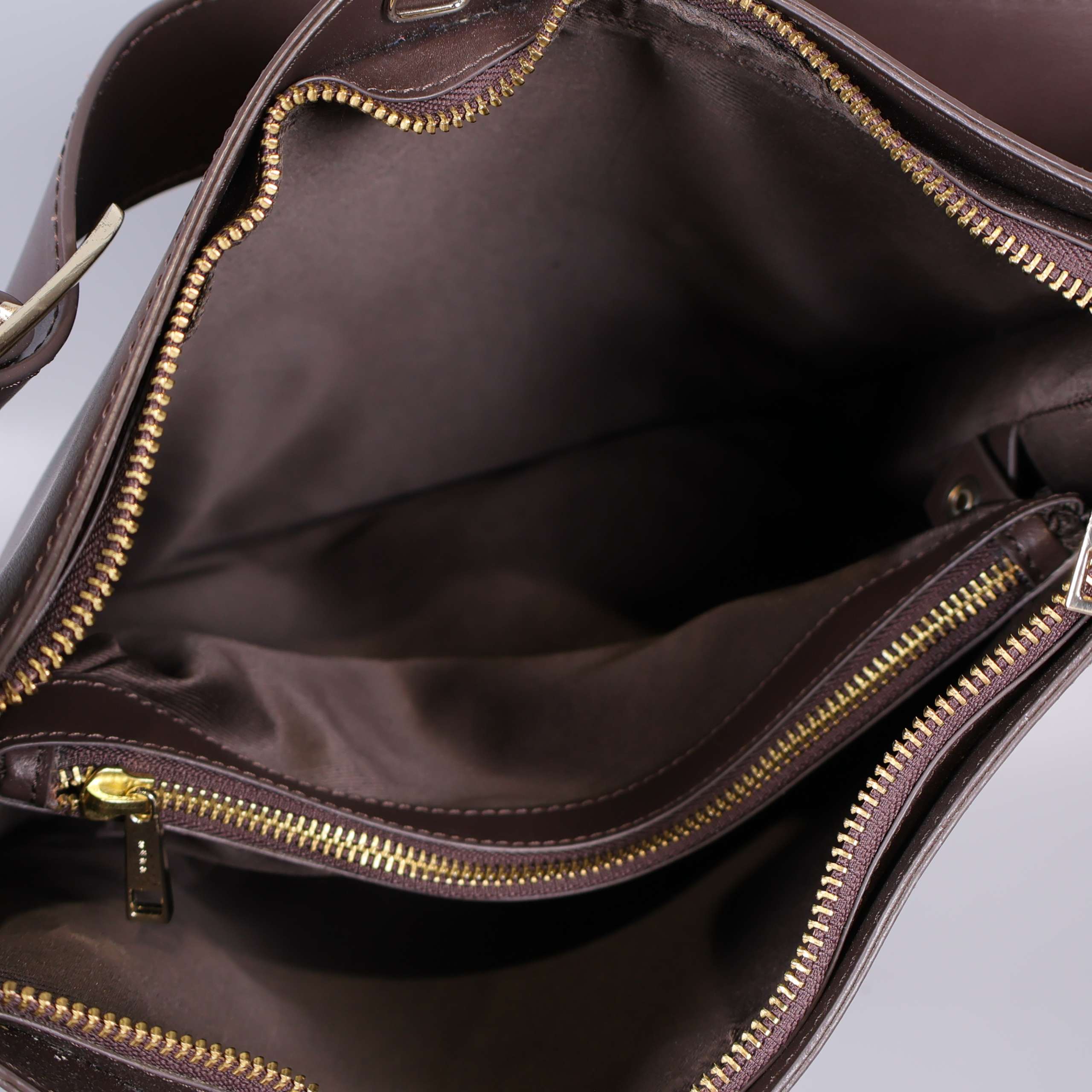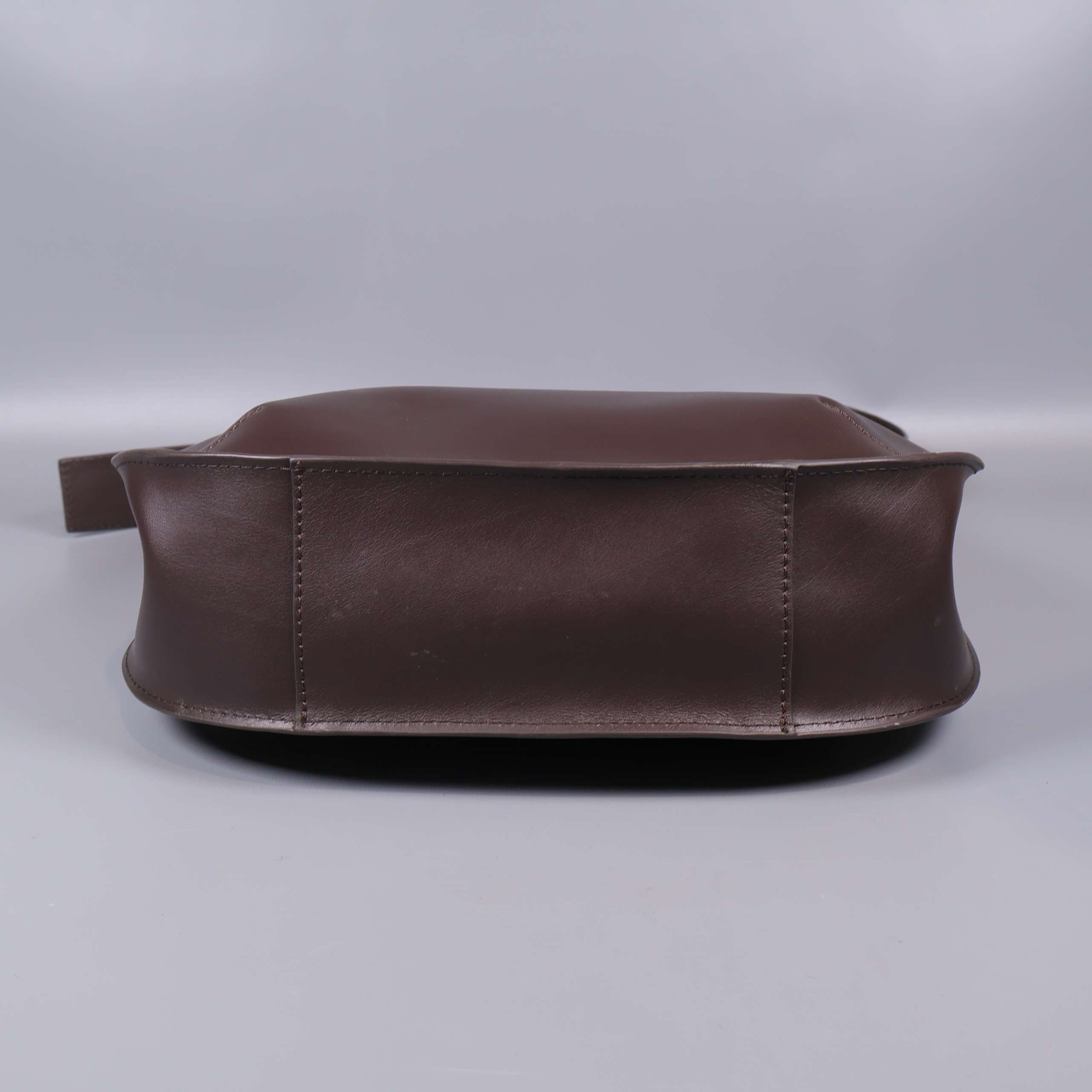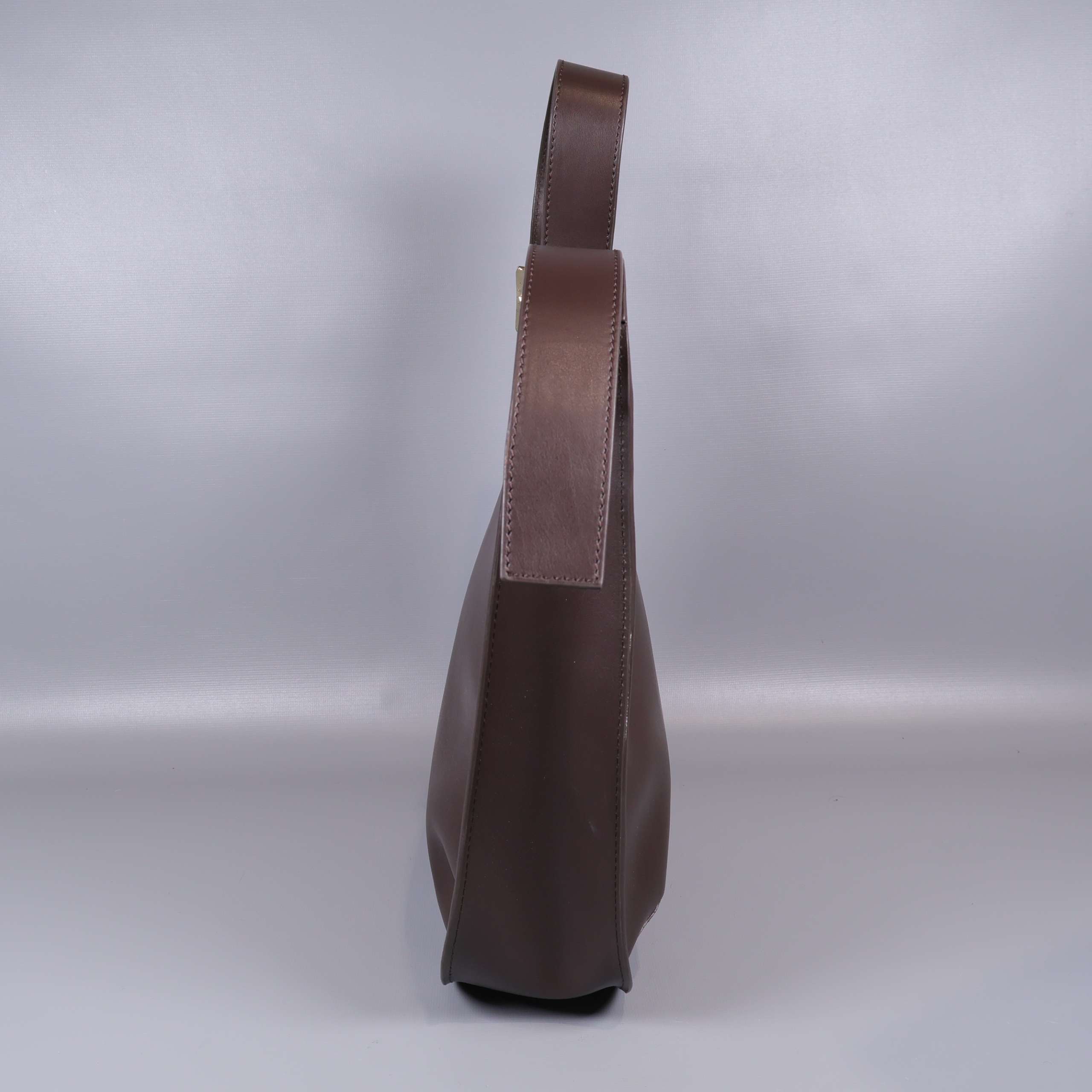 Stilren axelremsväska i slätt, brunt läder med justerbart axelband och dekorativt spänne i metall. Väskan har guldfärgad dragkedja, flera praktiska innerfack och elegant sömnadsdetalj.
