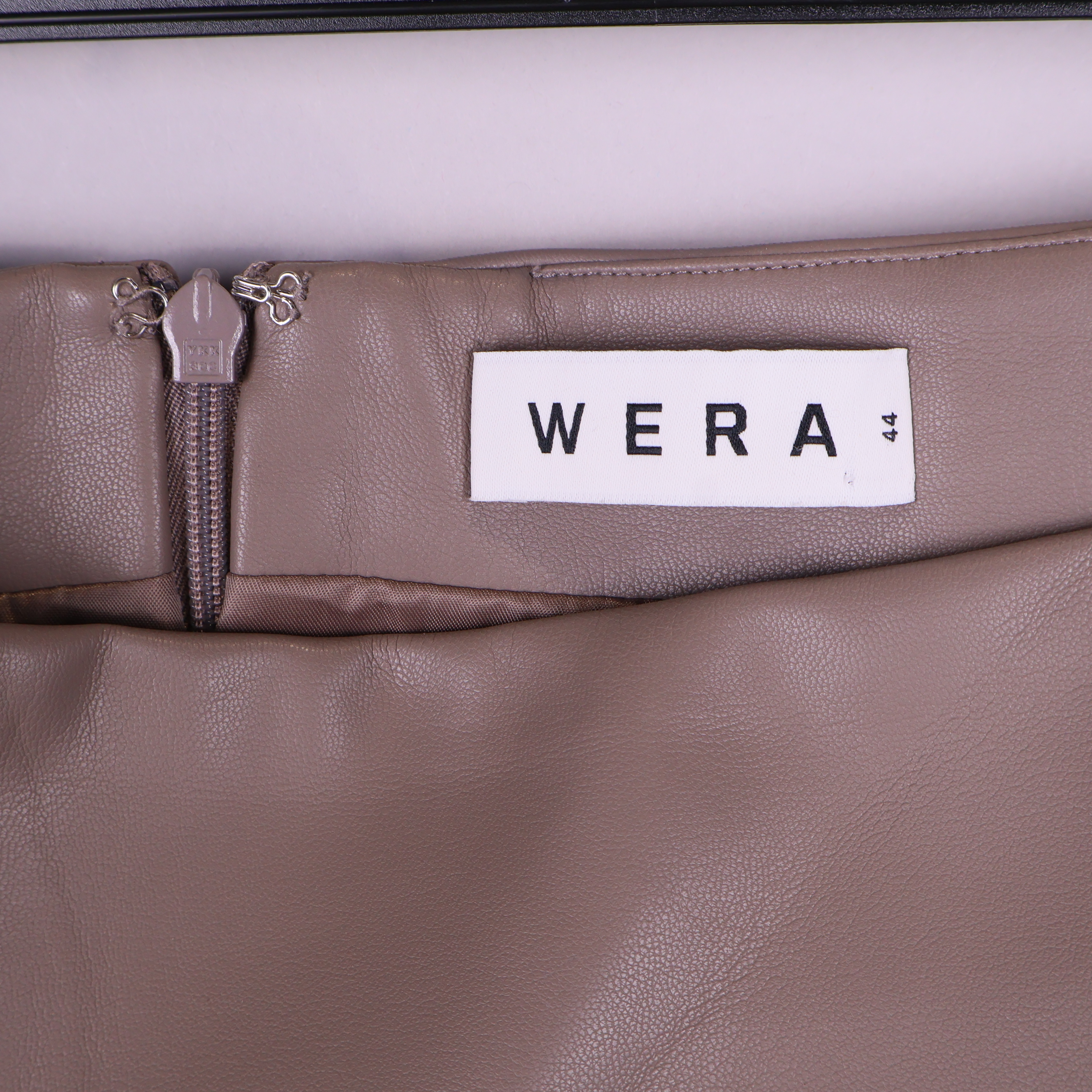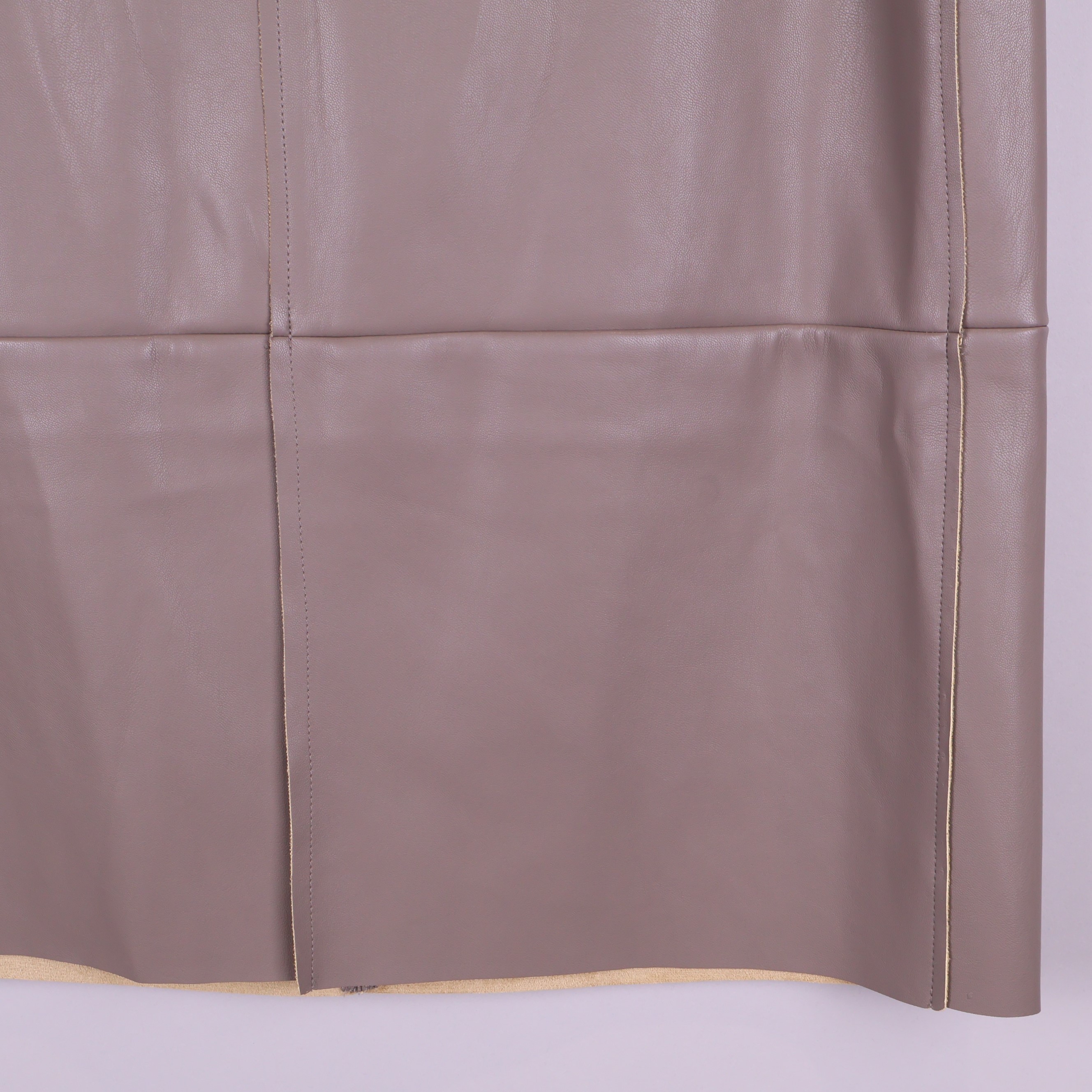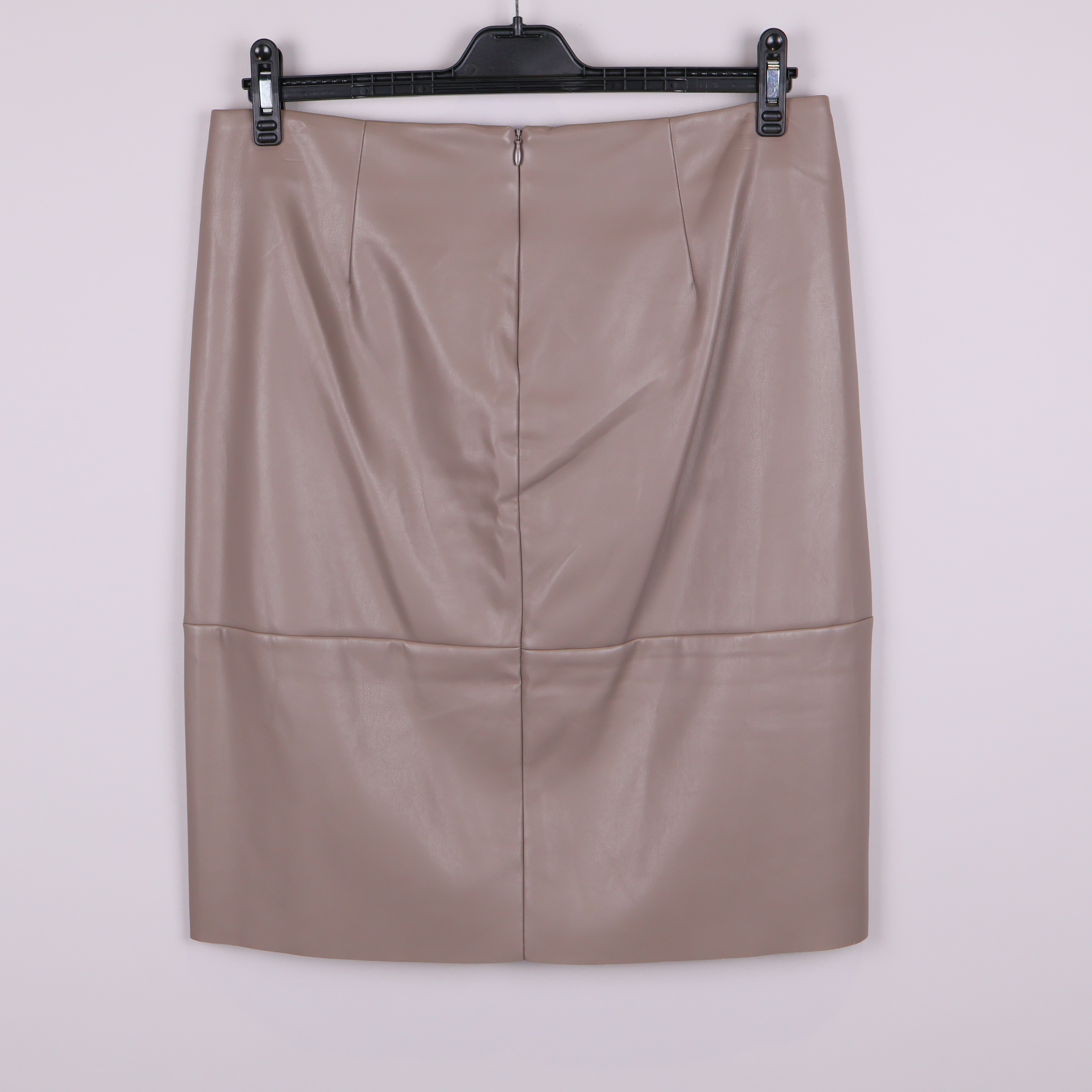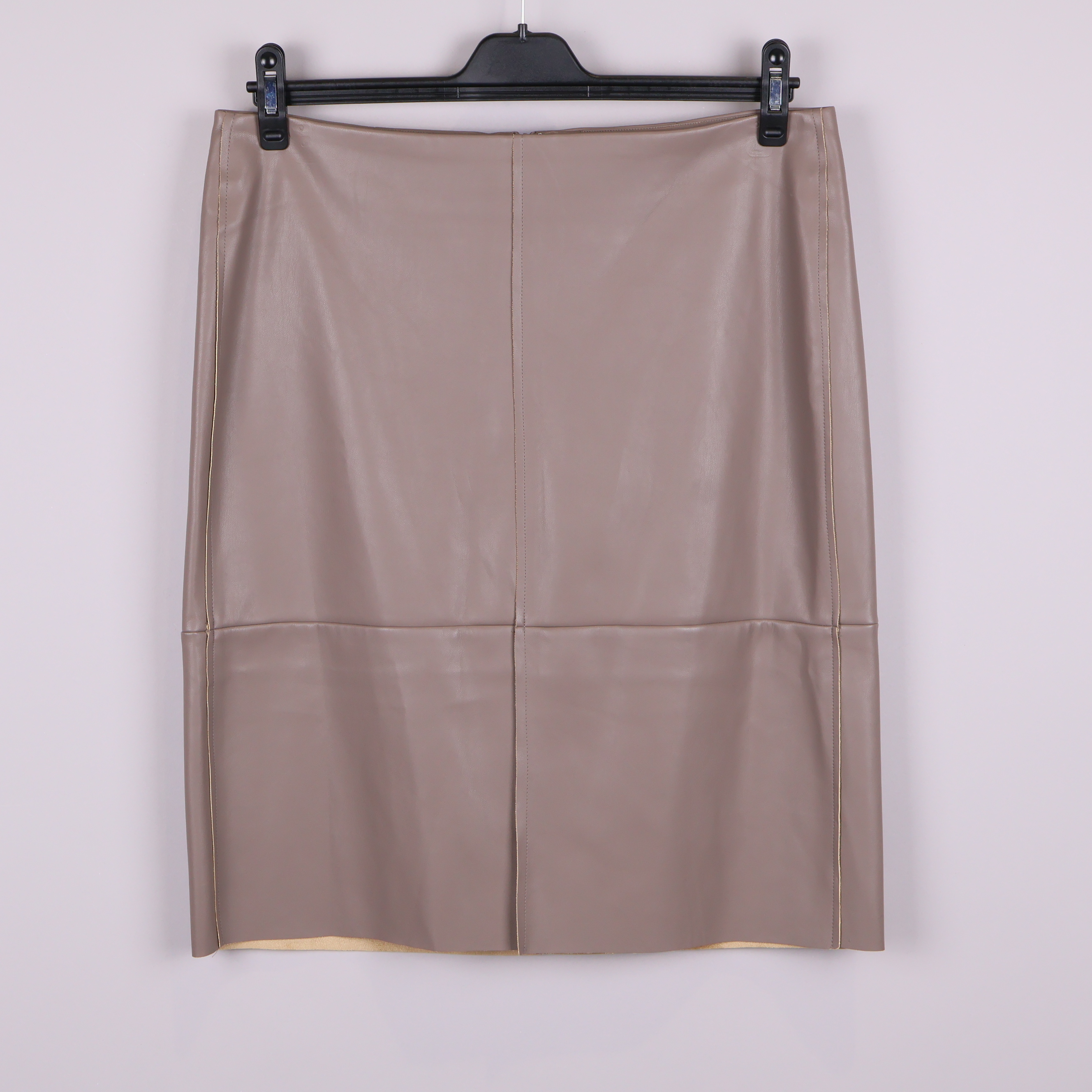Modern pennkjol i beige konstläder med markerade sömmar och slits fram. Kjolen har diskret dragkedja bak och en mjukt matt yta som ger en stilren känsla. Perfekt för dig som gillar en tidlös look där enkel design möter snygga detaljer.