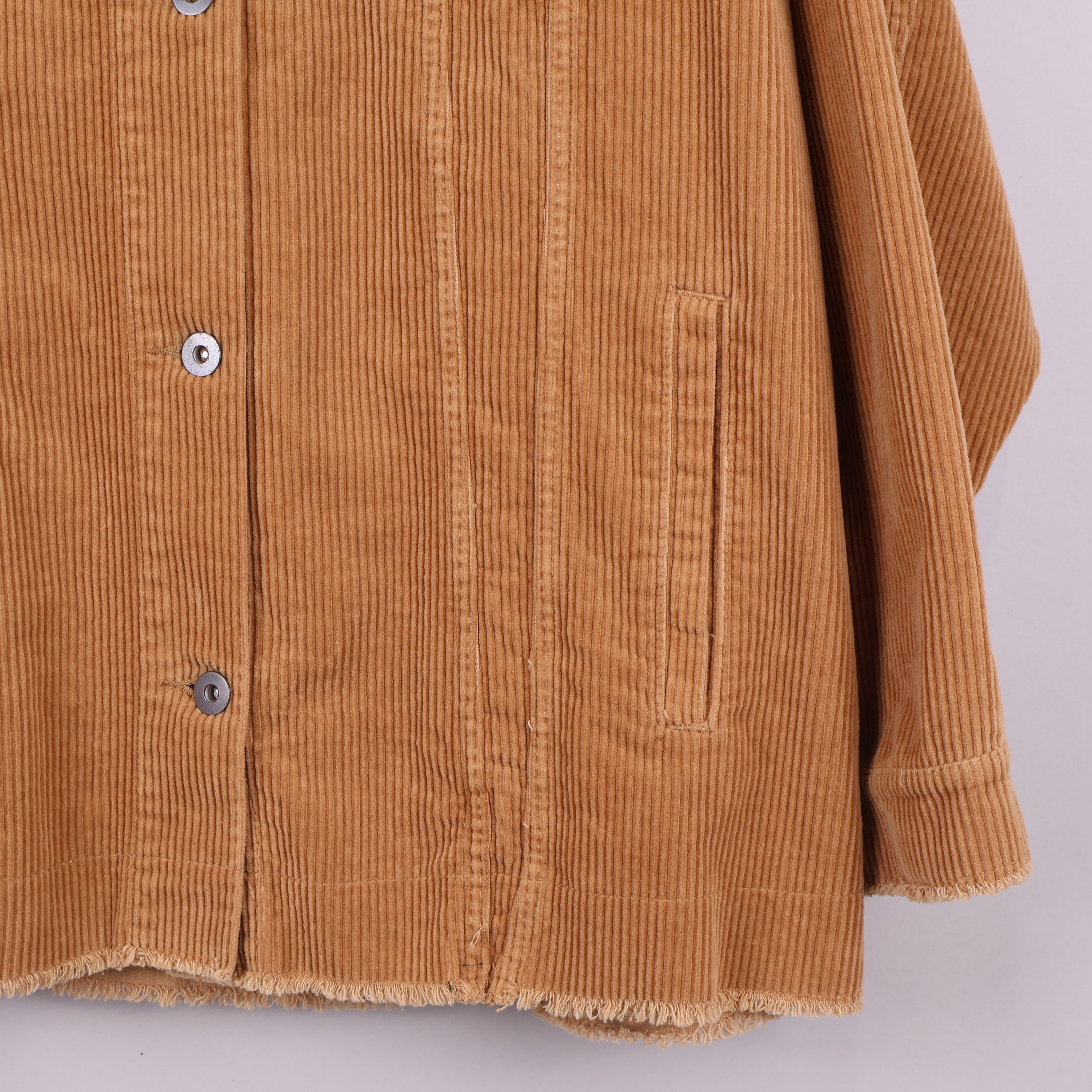 Stilren jacka i bredspårig manchester med klassisk skjortkrage och två bröstfickor med knappstängning. Knappslå framtill, raka ärmar och rå nederkant för en modern touch.