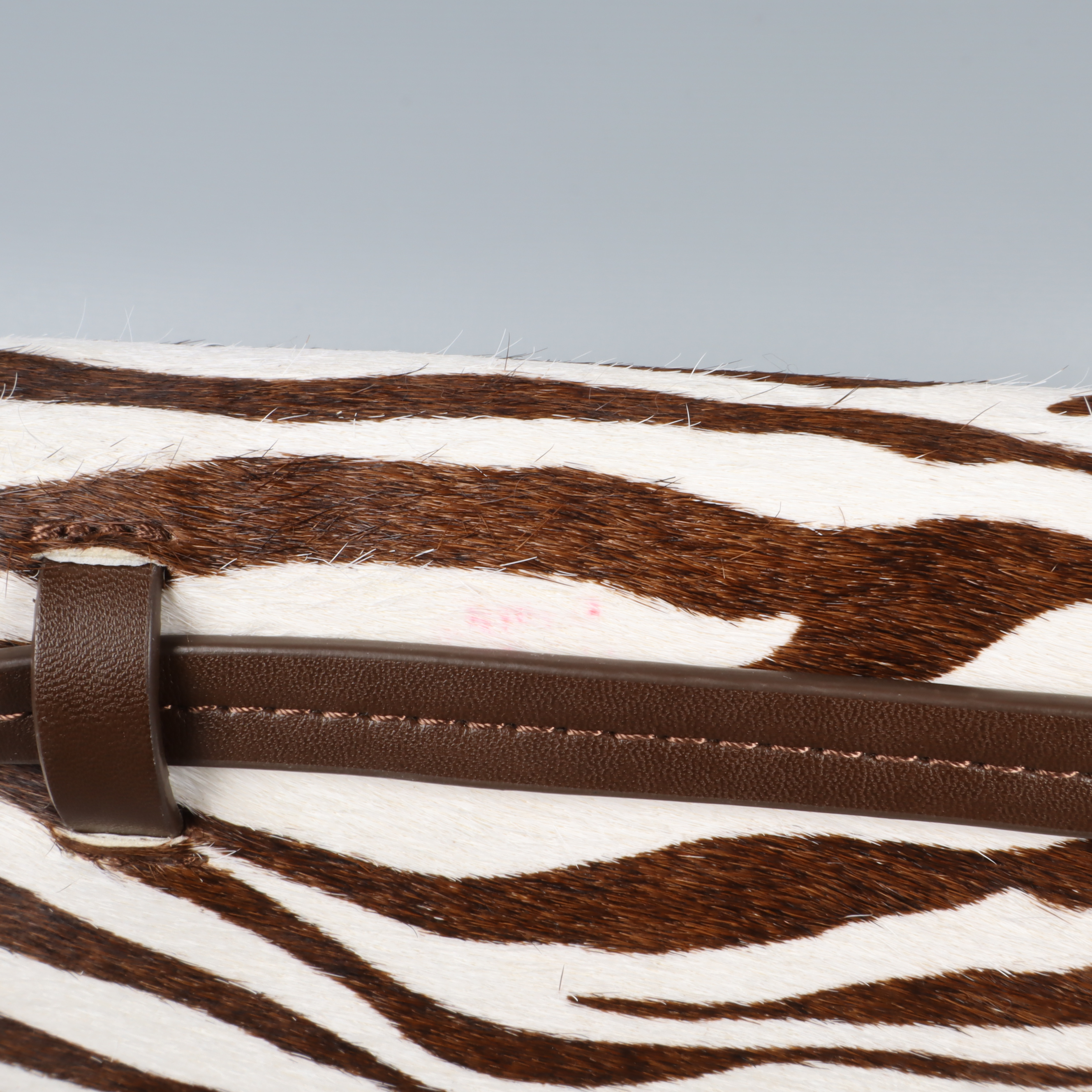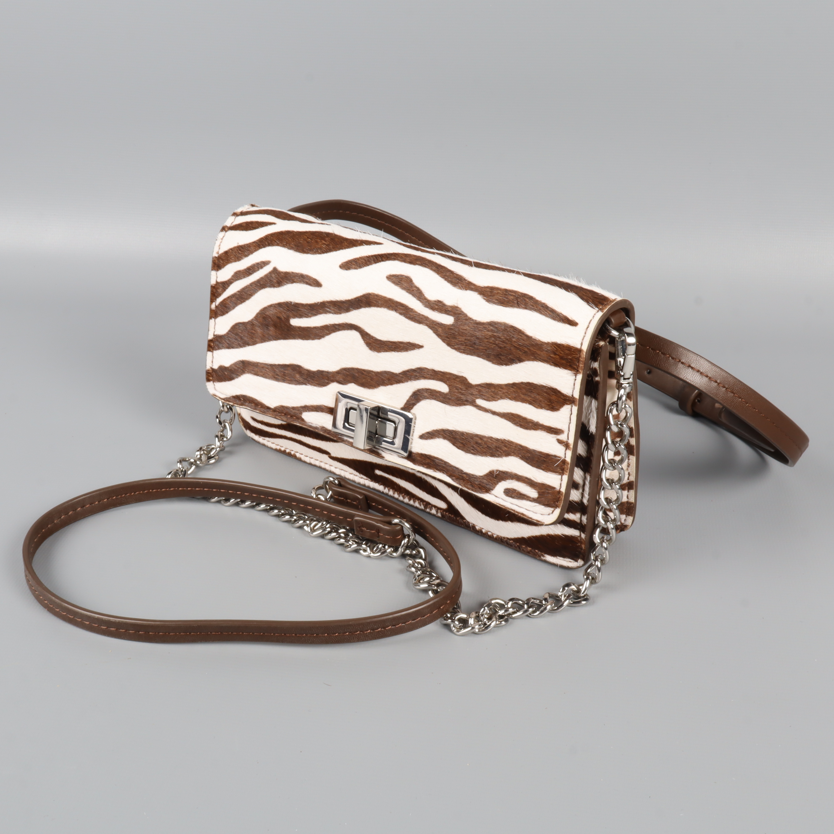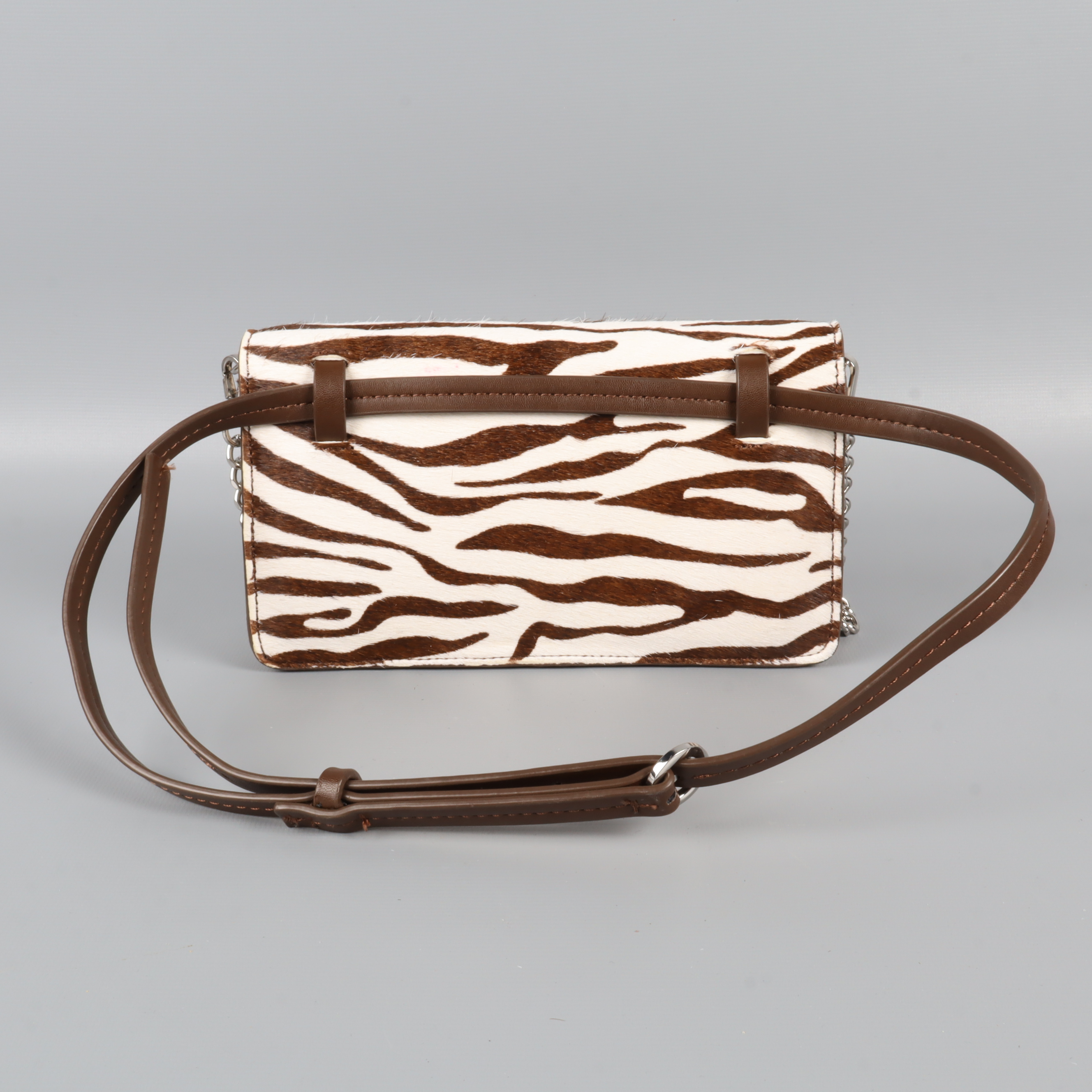 Stilren midjeväska/axelremsväska med iögonfallande zebramönster som kombinerar bruna och vita toner. Försedd med eleganta kedjedetaljer och justerbar axelrem för både stil och komfort. Invändigt finns flera praktiska fack för dina nödvändigheter.