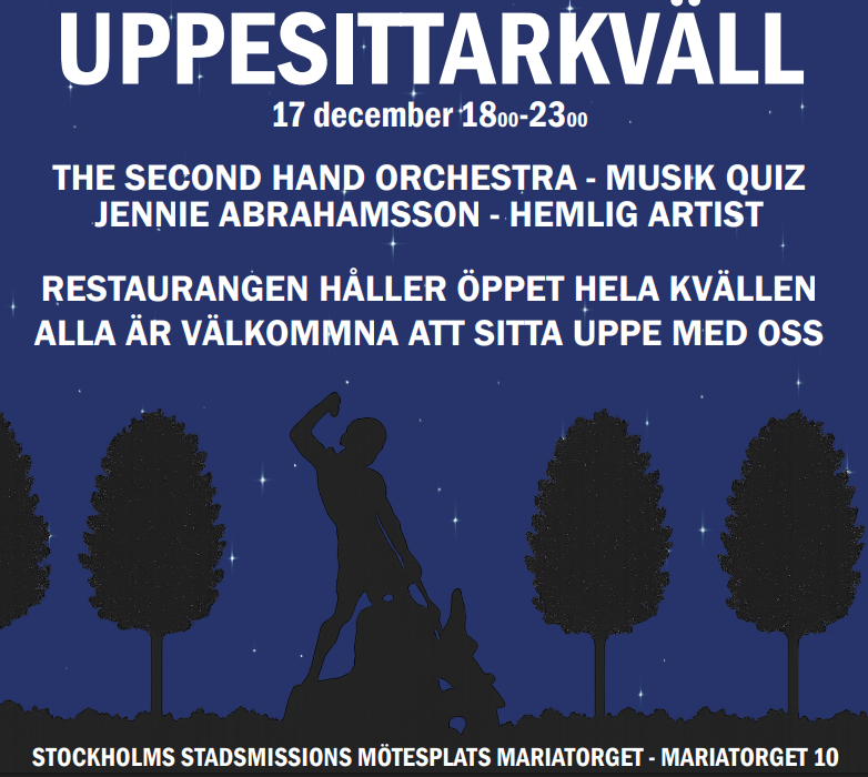 Den 17 december kl. 18.00–23.00 bjuder Stockholms Stadsmissions Mötesplats Mariatorget in till en stämningsfull kväll fylld av gemenskap, musik och julförberedelser. Tillsammans klär vi granen, umgås och njuter av en varm och välkomnande atmosfär.